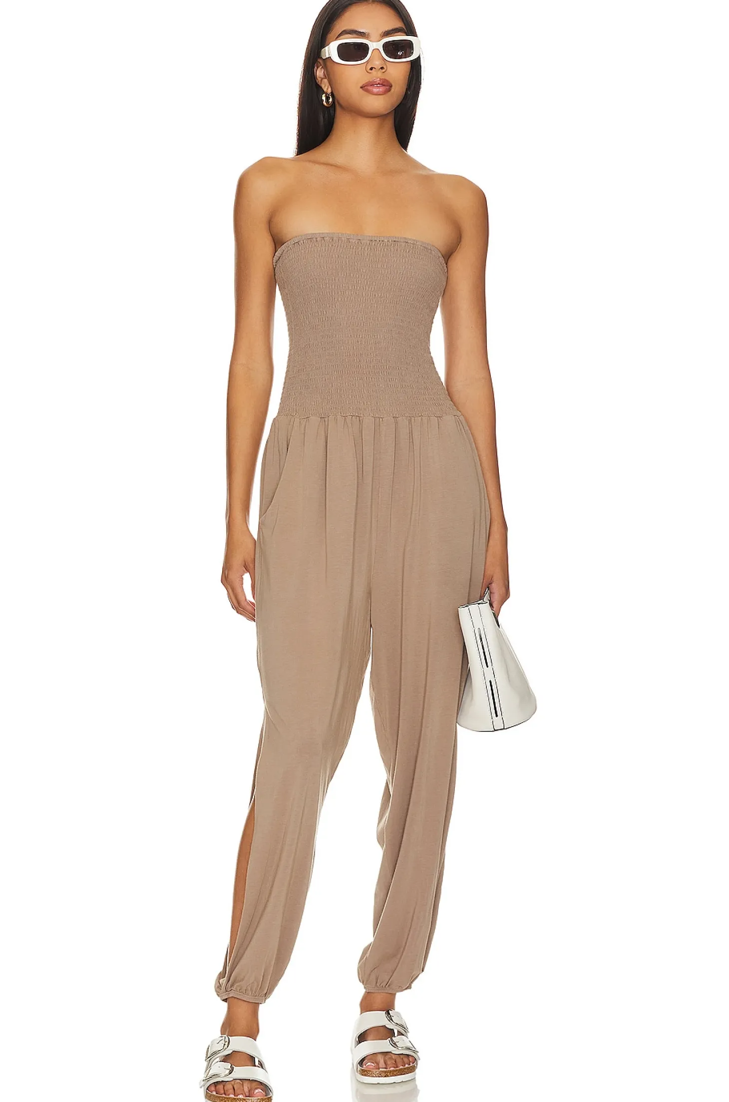 54% cotton 44% modal 2% spandex.Made in China.Hand wash.Smocked neckline.Drawstring waist.Side slant pockets.Jersey fabric with elastic cuffs.Neckline to hem measures approx 45" in length 19" at the knee narrows to 10" at the leg opening