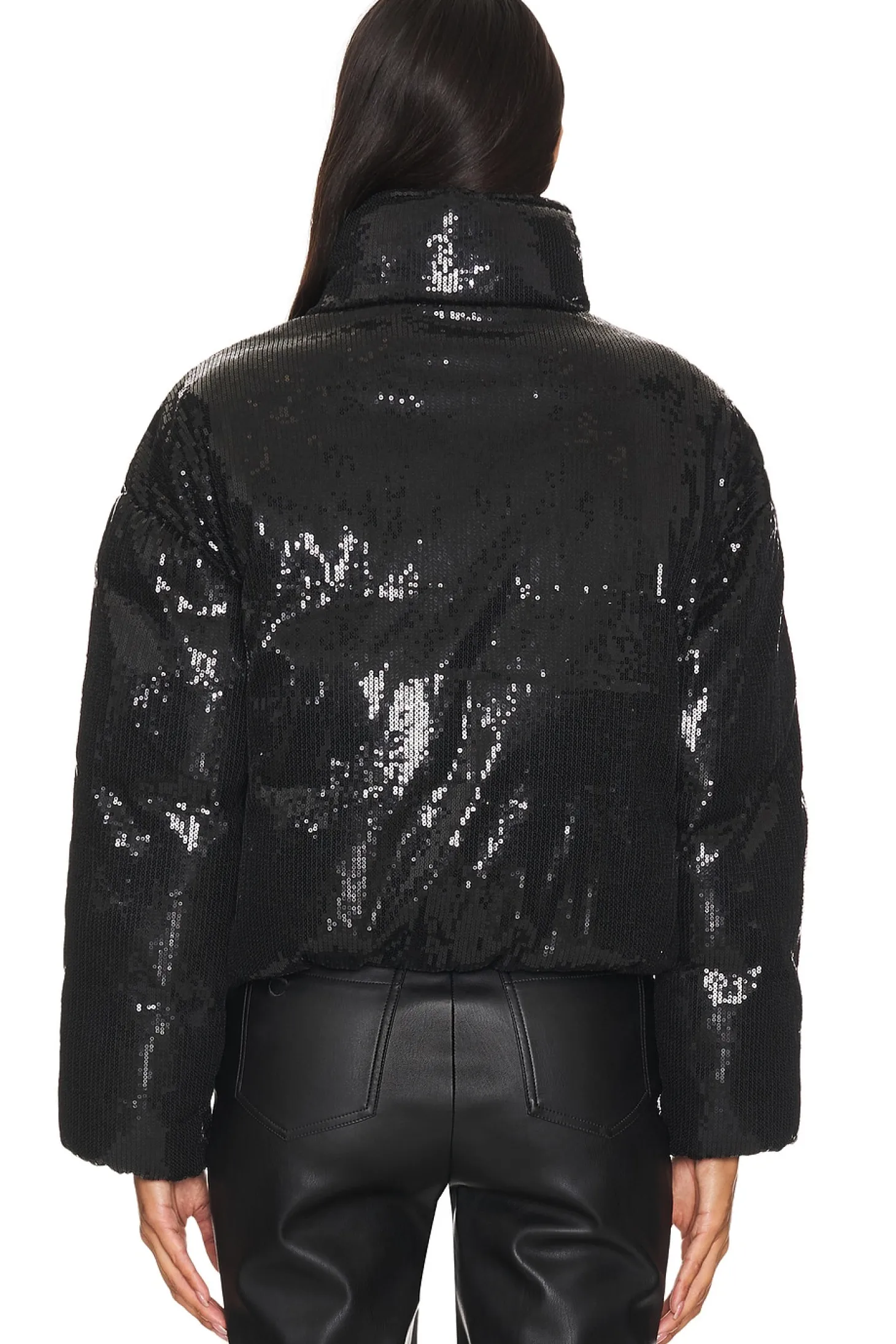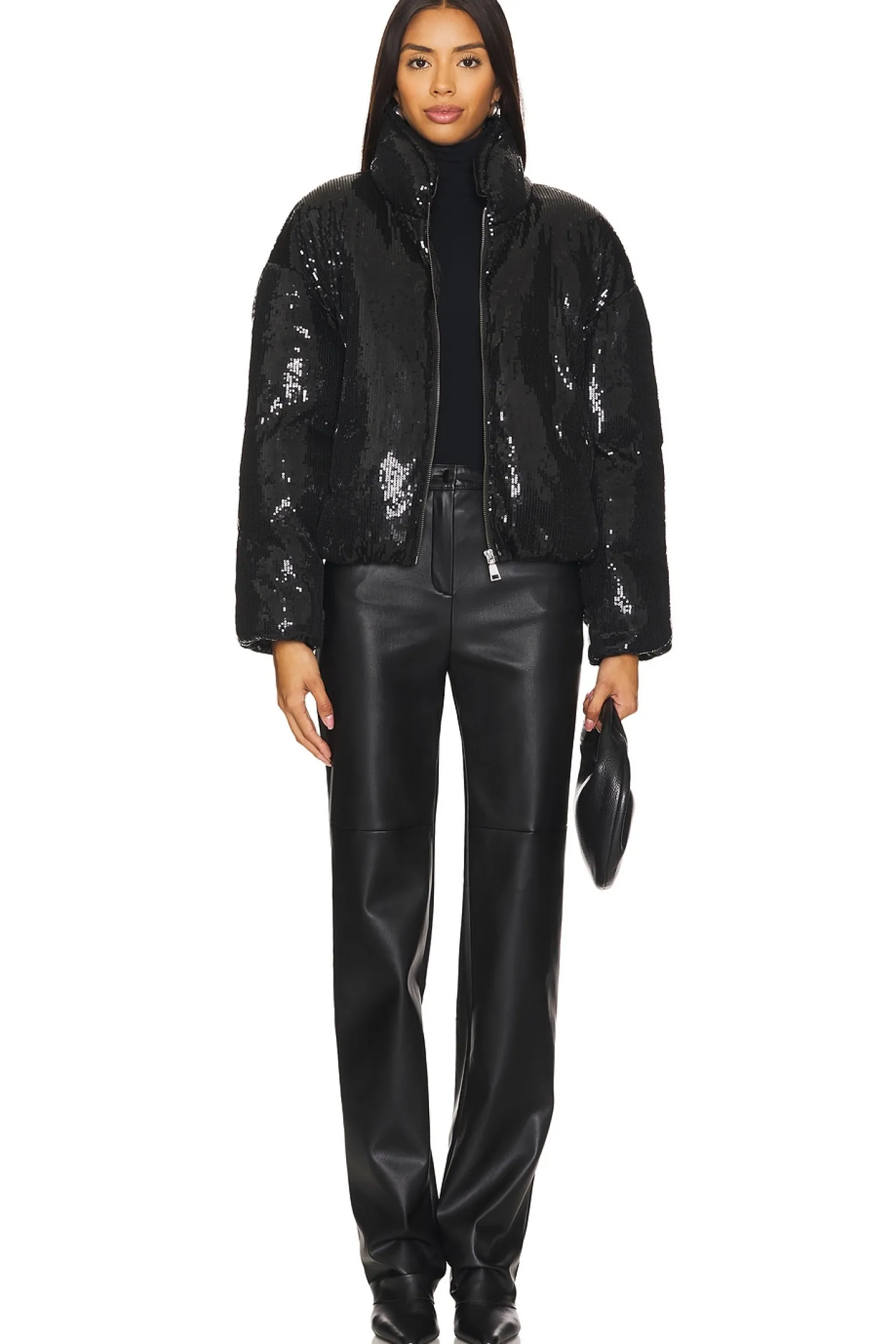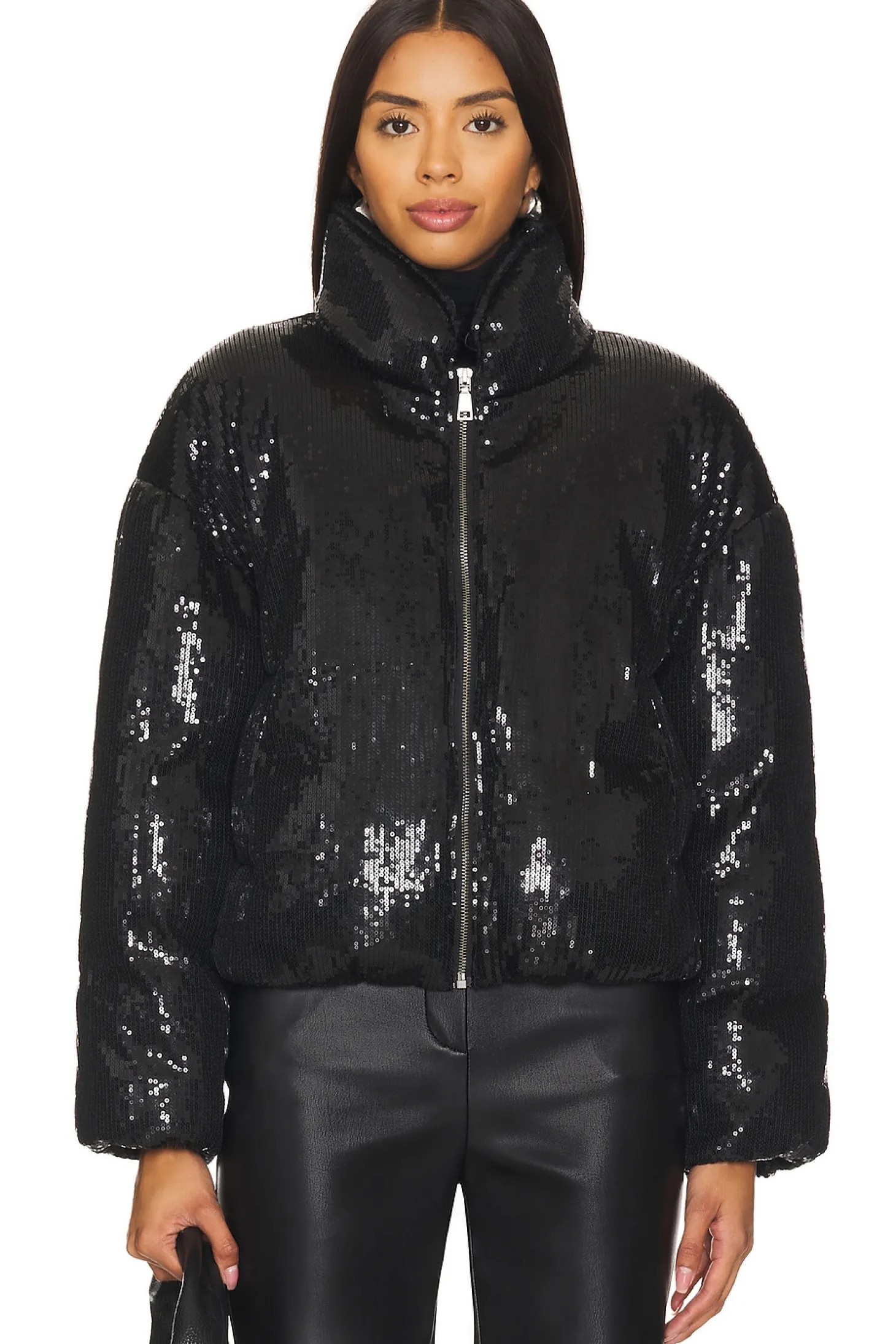 Sequin embellished textile.Imported.Dry clean recommended.Front zipper closure.Side seam pockets.Mockneck styling.Heavyweight padded sequin embellished fabric