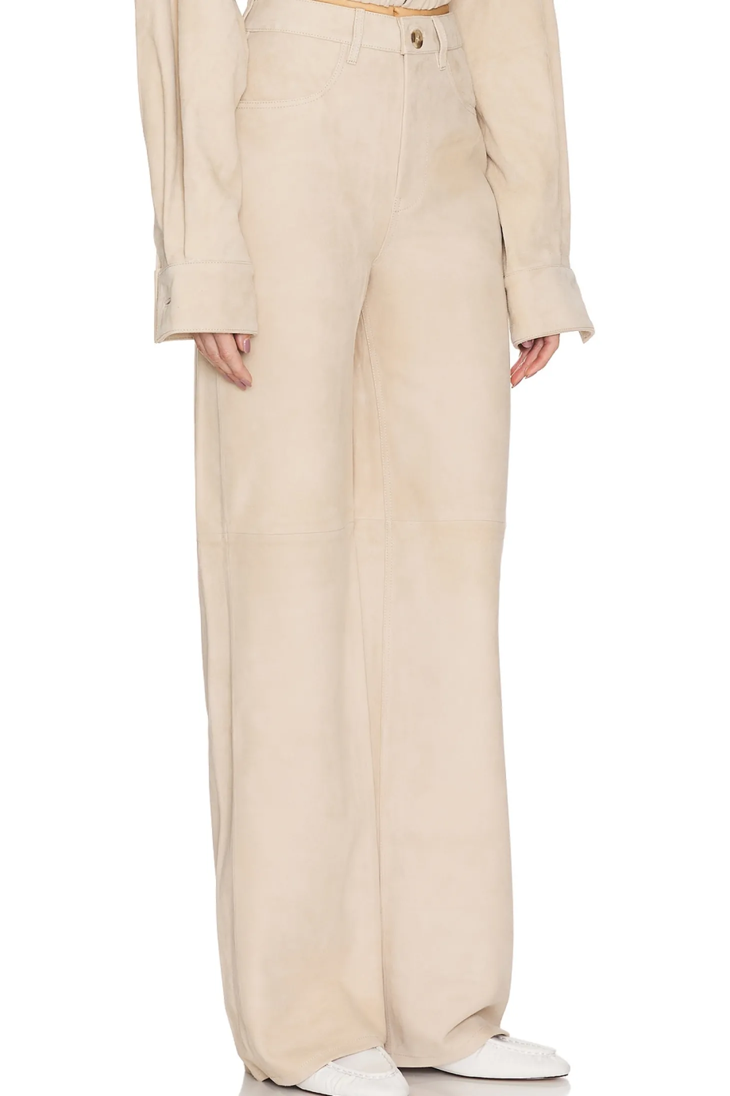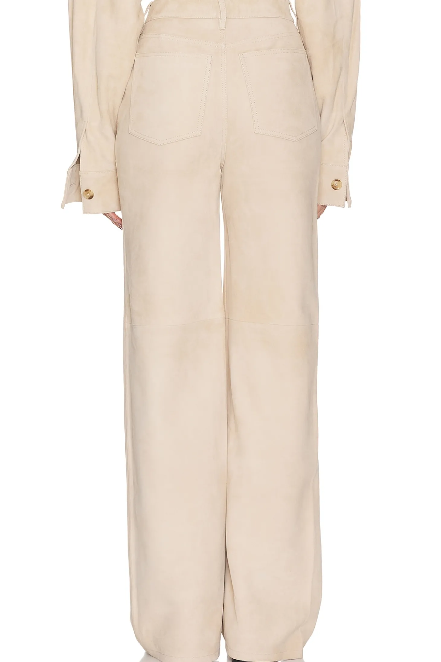 Self: 100% goat suede Lining: 100% polyester.Made in India.Professional leather cleaning only.Zip fly with button closure.4-pocket styling.High-waisted fit.Genuine suede fabric.20" at the knee and 20" at the leg opening