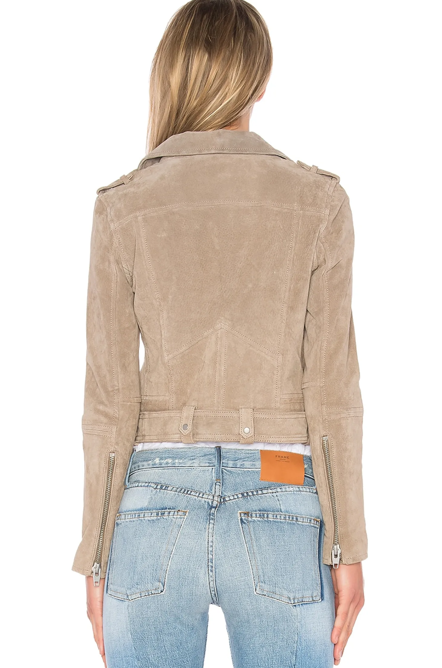 Self: 100% leather Lining: 97% poly 3% spandex.Dry clean recommended.Zip front closure.Shoulder epaulettes.Side zipper pockets.Belted hem with buckle closure.Zippered sleeves
