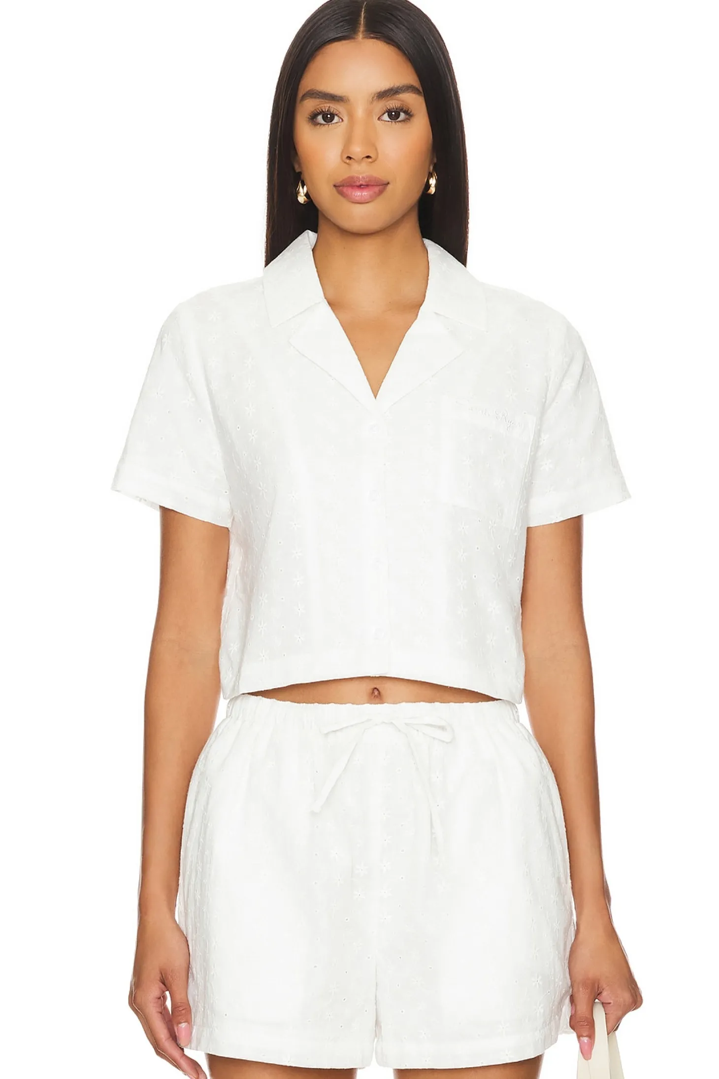 100% cotton.Made in China.Machine wash.Front button closure.Breast pocket with logo detail.Item not sold as set.Poplin fabric with eyelet detail throughout