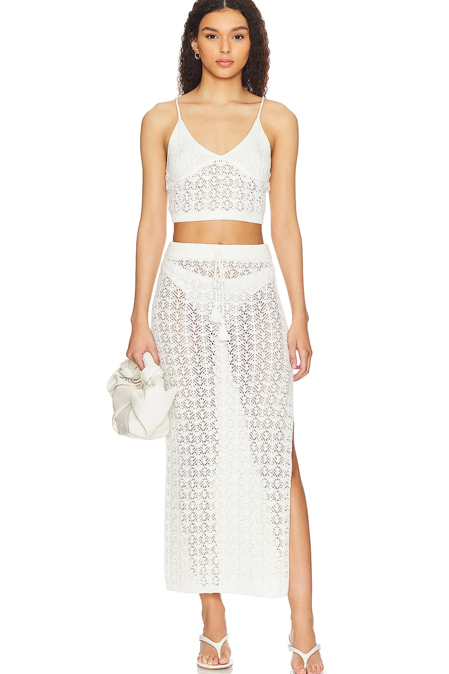 76% acrylic 24% nylon.Made in China.Hand wash.Adjustable shoulder straps.Open knit crochet fabric.Item not sold as a set