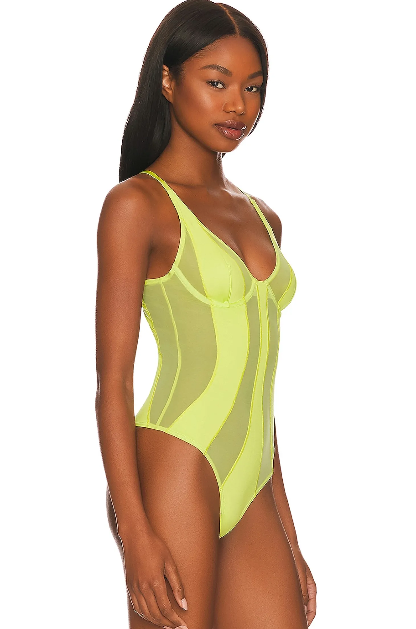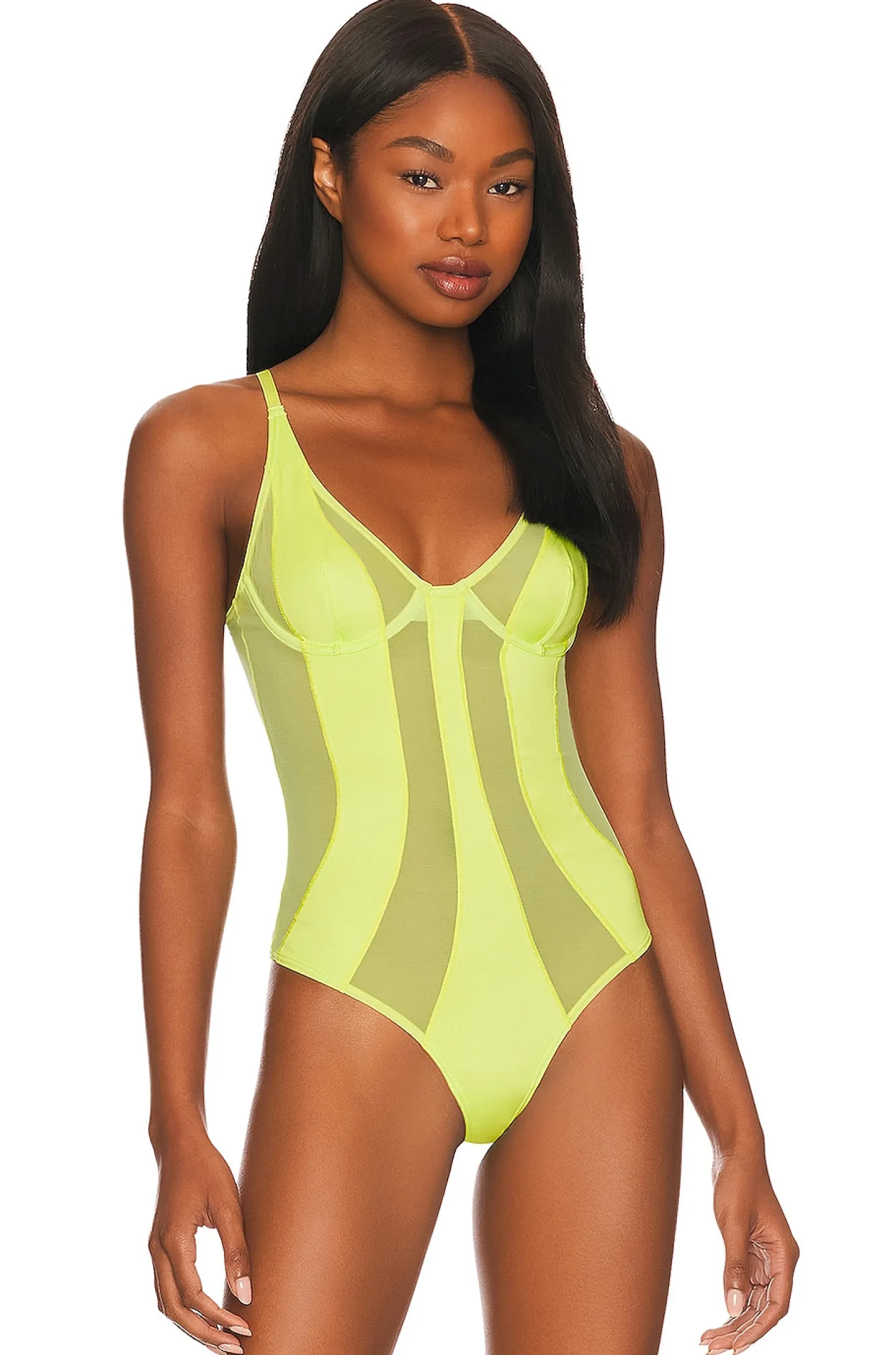 90% polyester 10% spandex.Made in China.Machine wash.Adjustable shoulder straps.Unpadded wired cups.Mesh panels.Gusset hook and eye closure with thong back