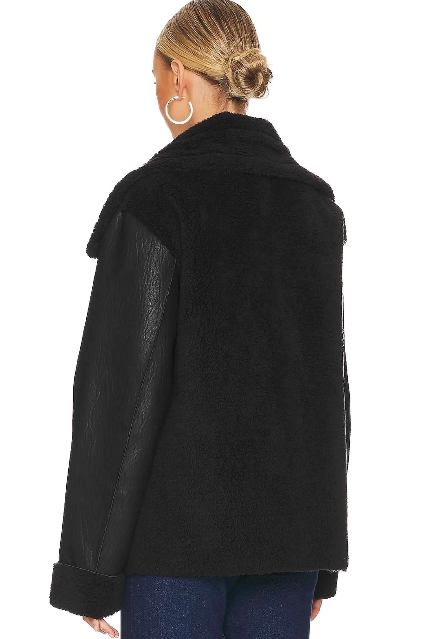 Self: 100% polyester Contrast Fabric: 100% polyurethane Lining: 100% recycled polyester.Made in China.Dry clean only.Front zipper closure.Side slant zipper pockets.Belted collar.Faux fur and faux leather panels
