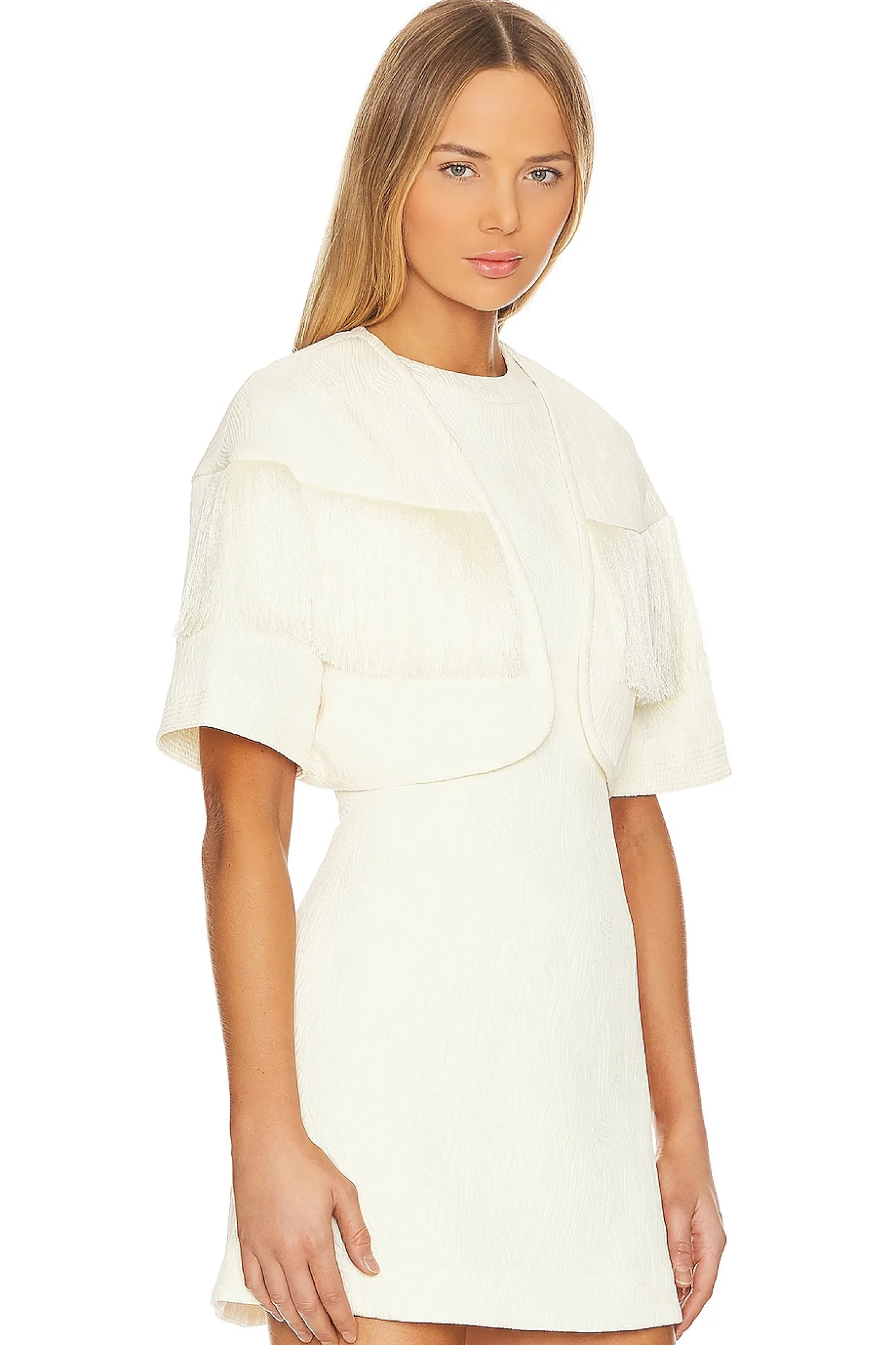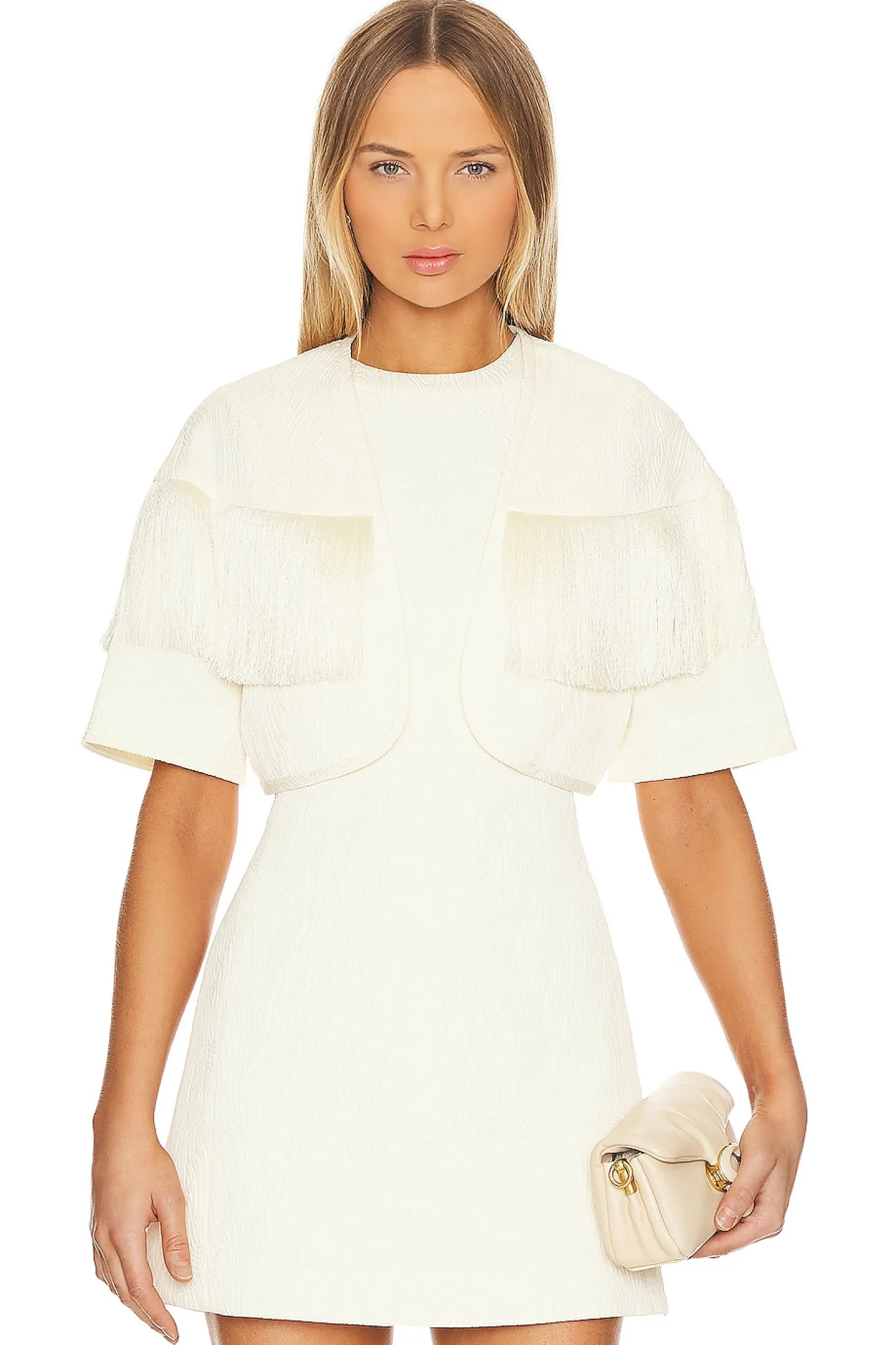 Self: 80% polyester 16% cotton 3% nylon 1% elastane Lining & Fringe: 100% polyester.Made in China.Dry clean only.Open front.Fringe detail at front.Textured jersey fabric.Item not sold as a set