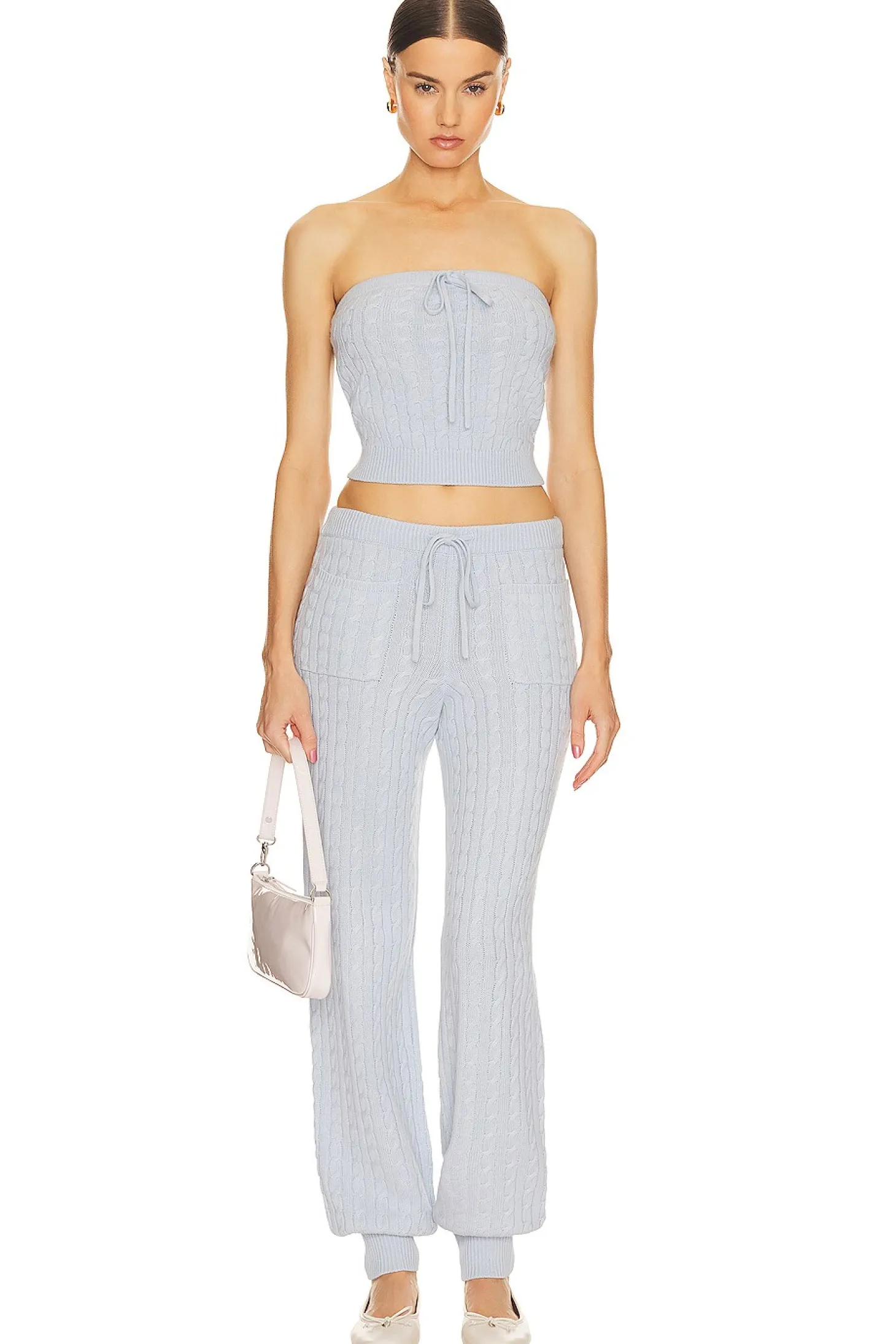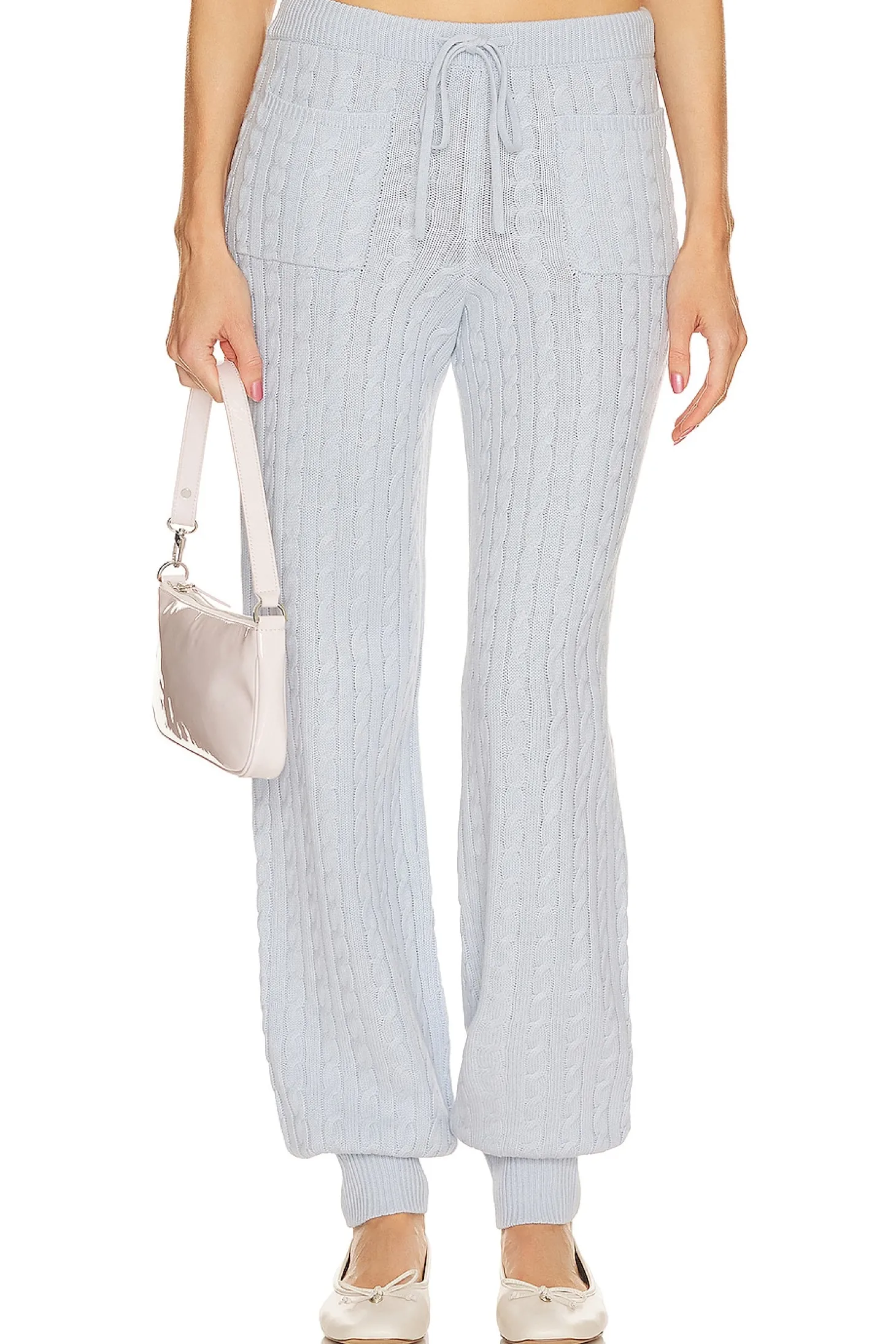 46% merino wool 38% viscose 11% nylon 5% cashmere.Made in China.Hand wash.Elastic drawstring tie.Front slip pockets.Cable knit fabric.17" at the knee narrows to 8" at the leg opening