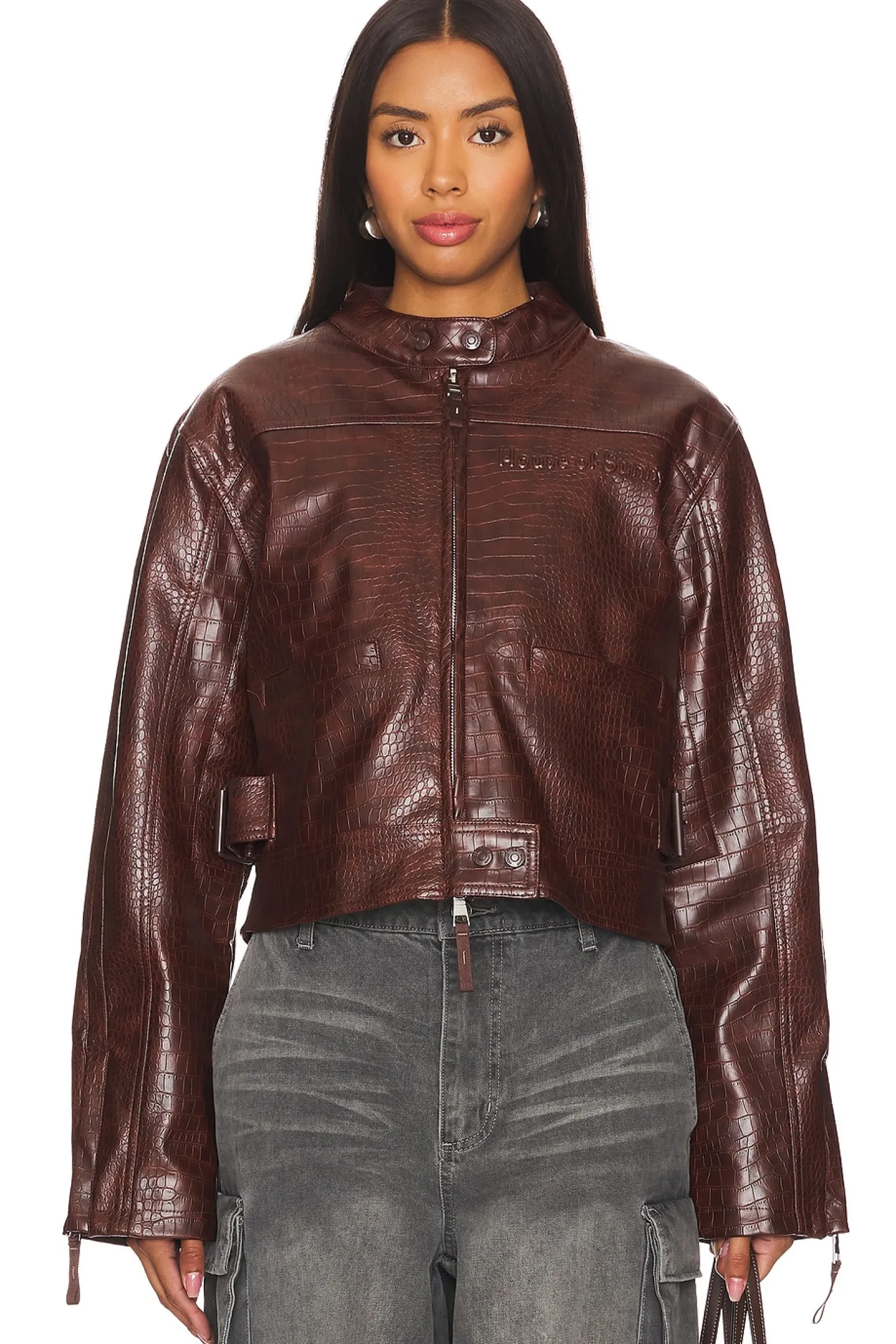 Self: 100% polyurethane Lining: 80% polyester 20% cotton.Made in China.Spot clean.Front zip closure.Croc embossed faux leather fabric