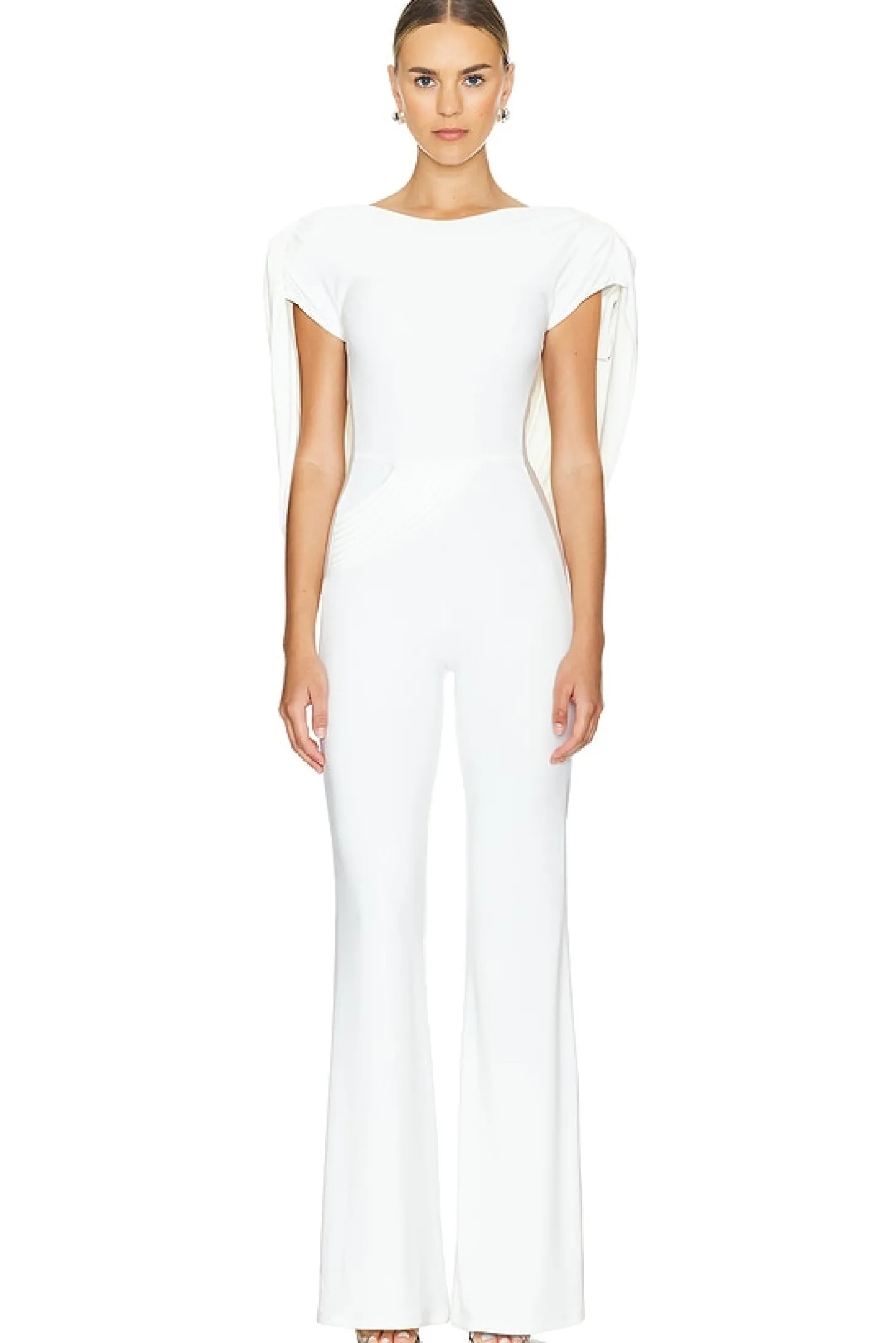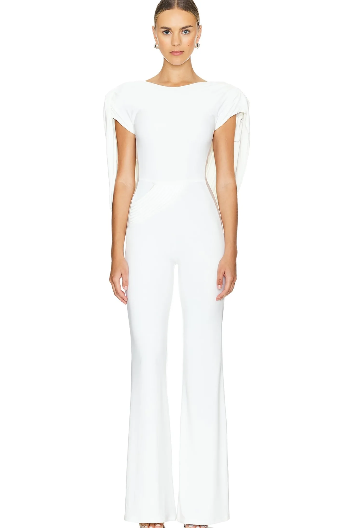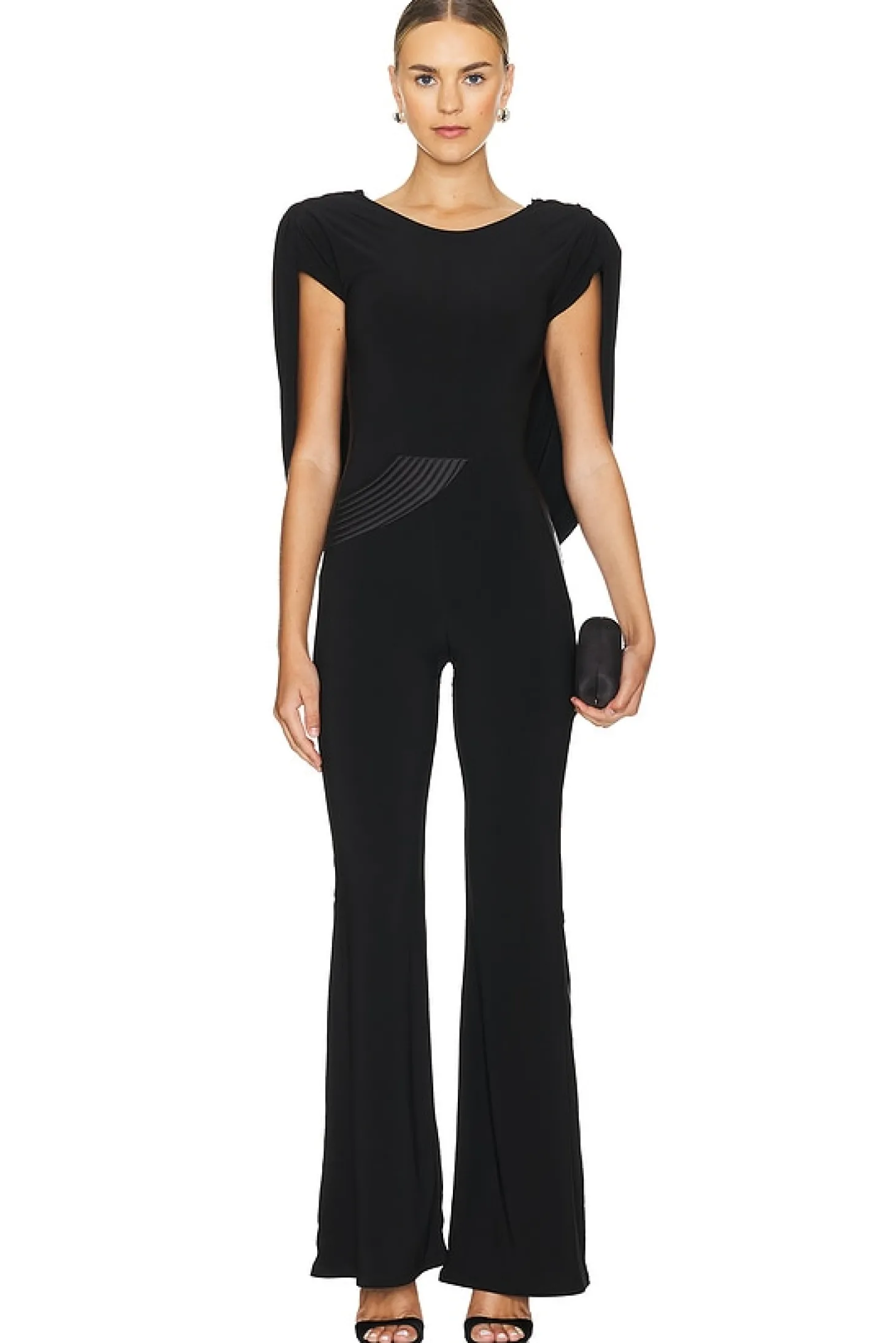 92% polyester 8% spandex.Made in China.Hand wash.Hidden side zipper closure.Padded shoulders.Draped back
