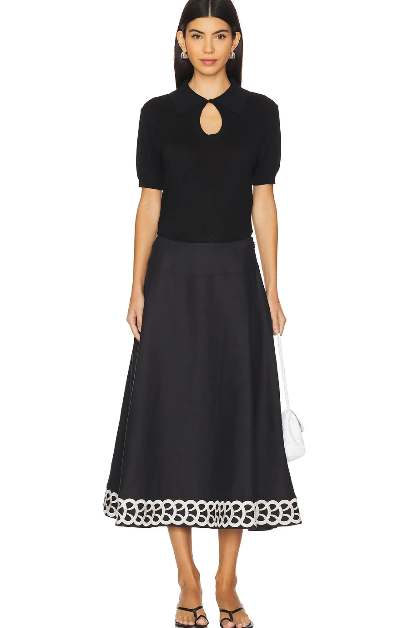 60% lyocell 32% wool 8% silk.Made in China.Hand wash.Front singular button loop closure and cut-out design.Light-weight knit fabric