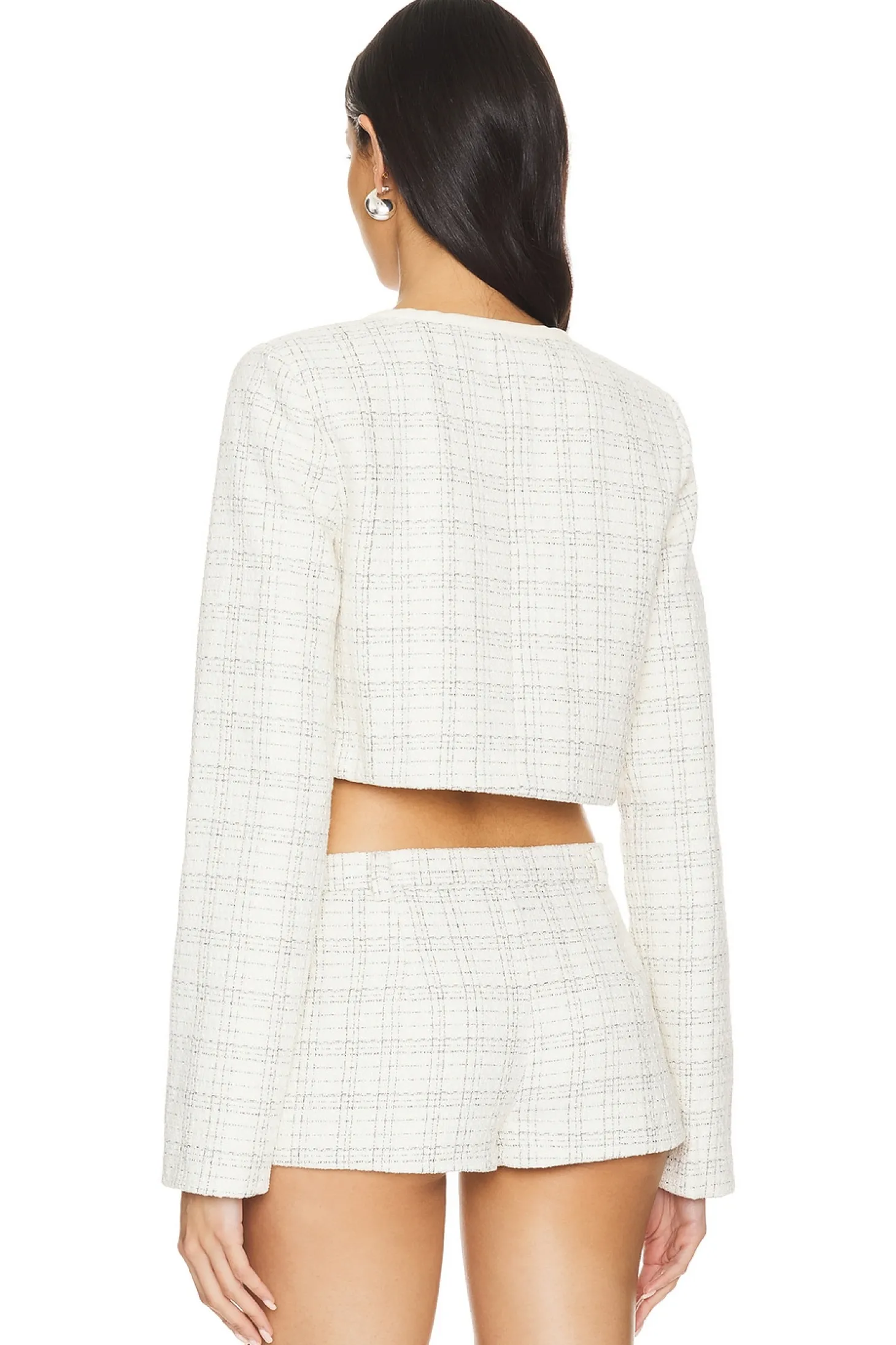 Self: 100% polyester Contrast: 55% viscose 45% polyurethane Lining: 97% polyurethane 3% elastane.Made in China.Dry clean only.Front button closure.Nonfunctional pocket detail.Includes shoulder pads.Item not sold as set.Midweight tweed fabric