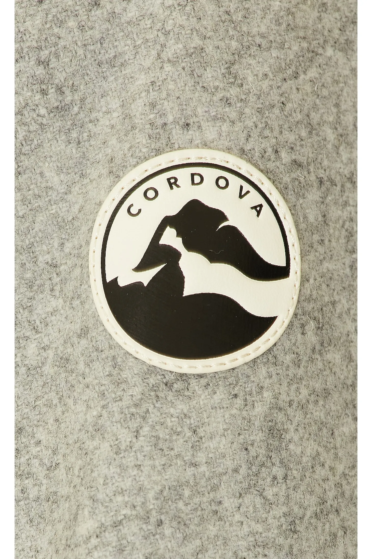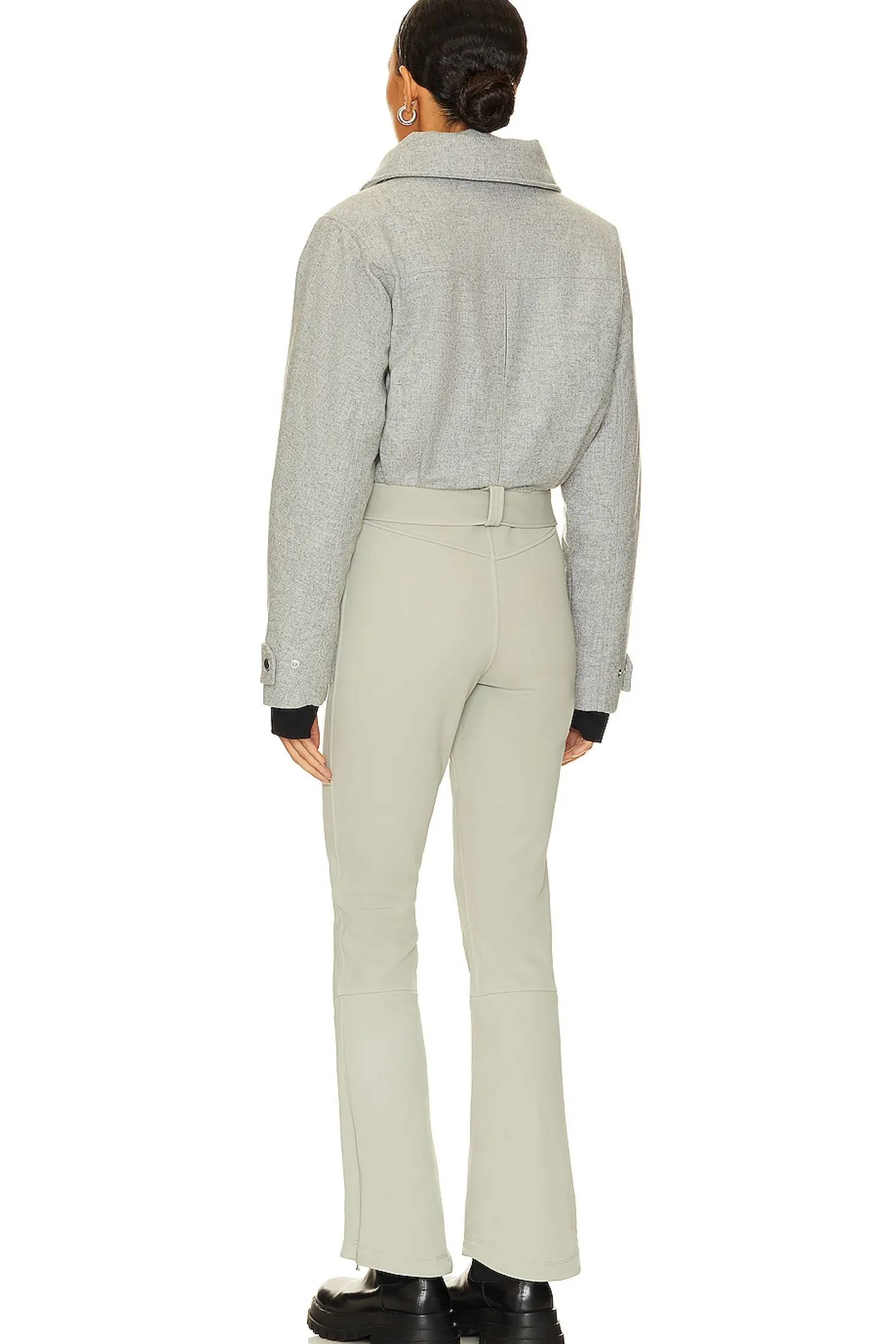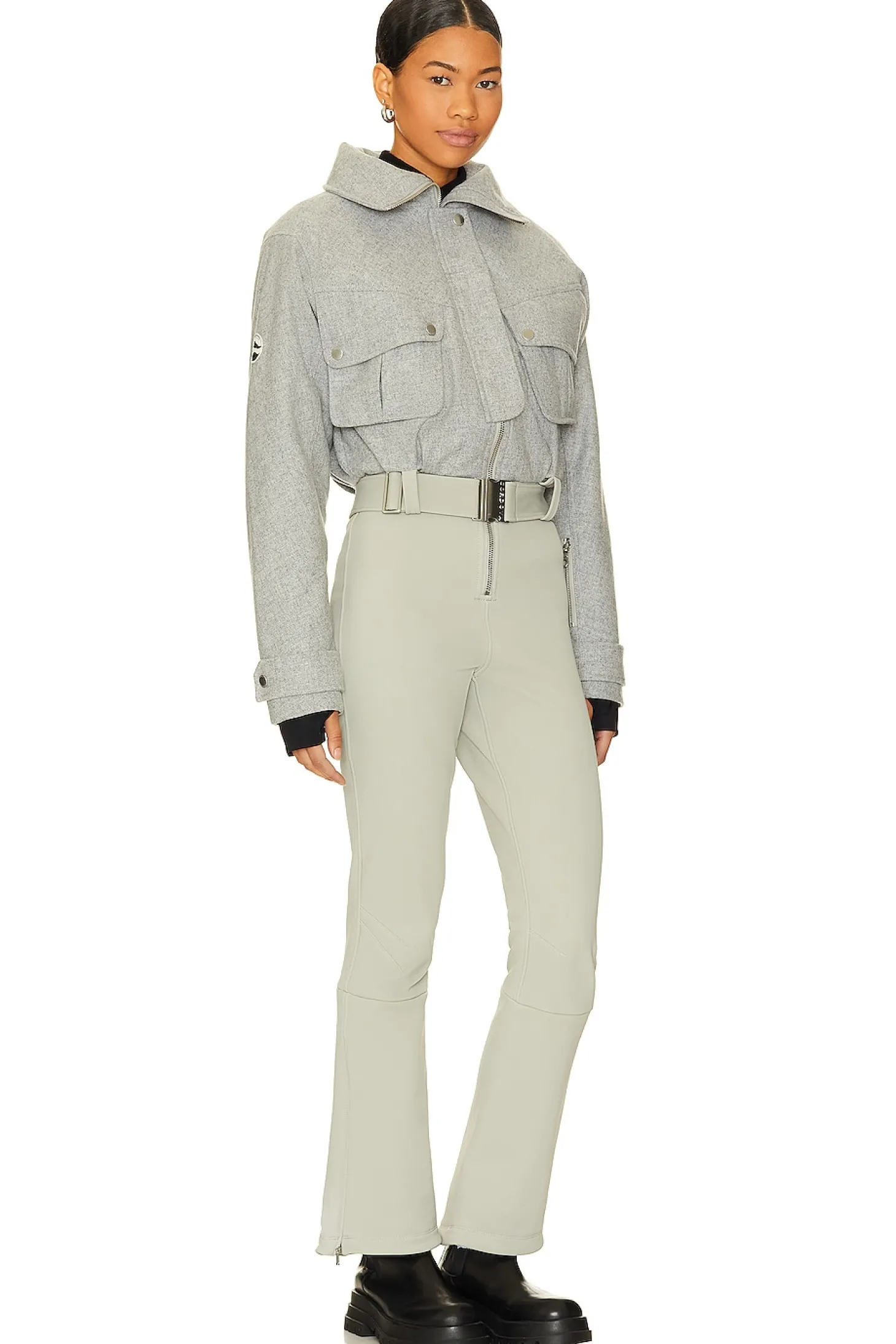 Self 1: 70% wool 30% polyamide Self 2: 58% polyamide 32% polyester 10% elastane Lining: 100% polyamide.Imported.Machine wash.Exposed front zipper closure.Two breast button pockets and one sleeve zipper pocket One interior zipper pocket.Fleece pant lining Snow catchers at hem.Melton fabric upper with neoprene pant Detachable belt