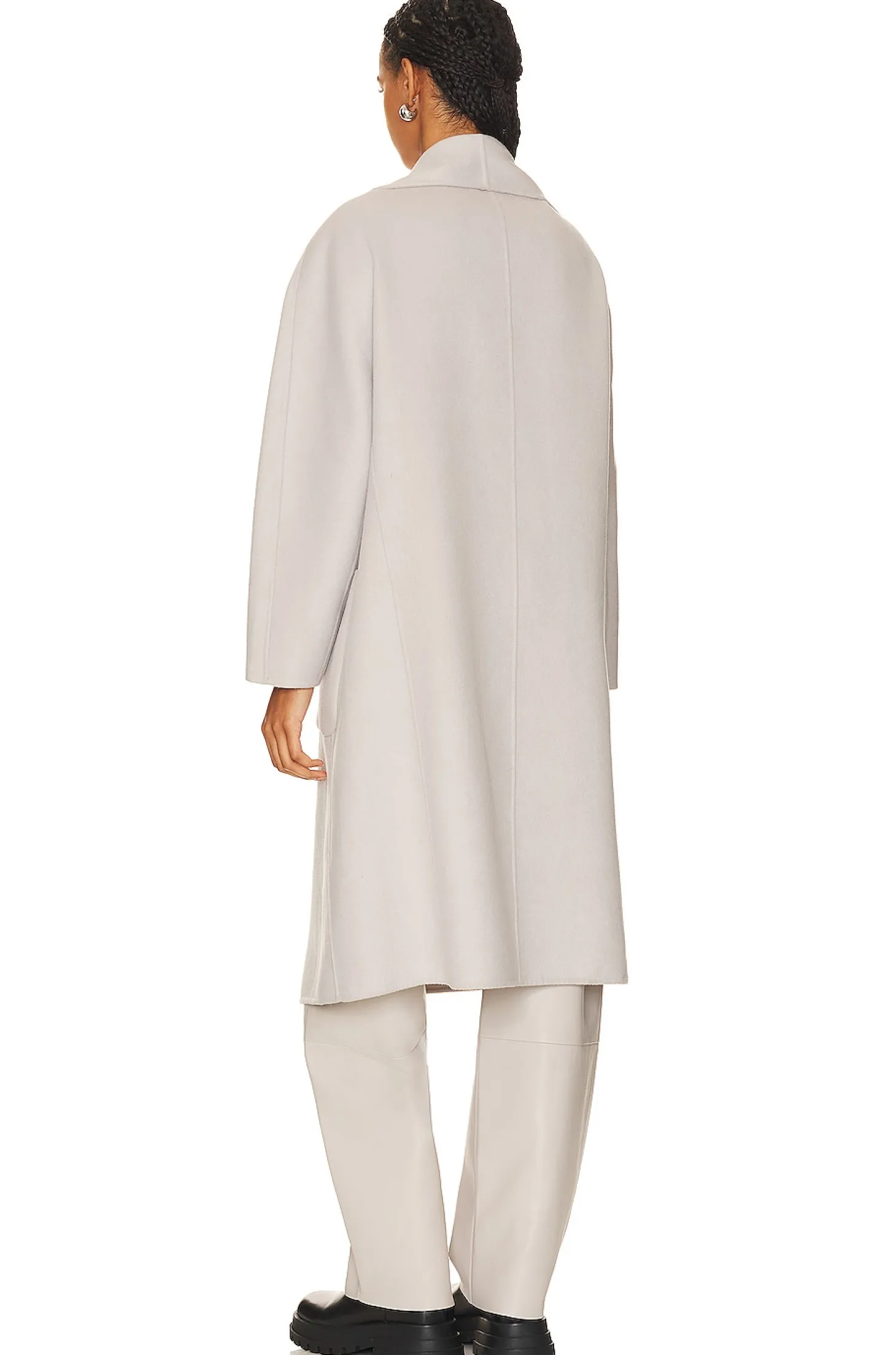 55% wool 45% polyester.Made in China.Dry clean only.Side slip pockets.Drop shoulders.Midweight fabric
