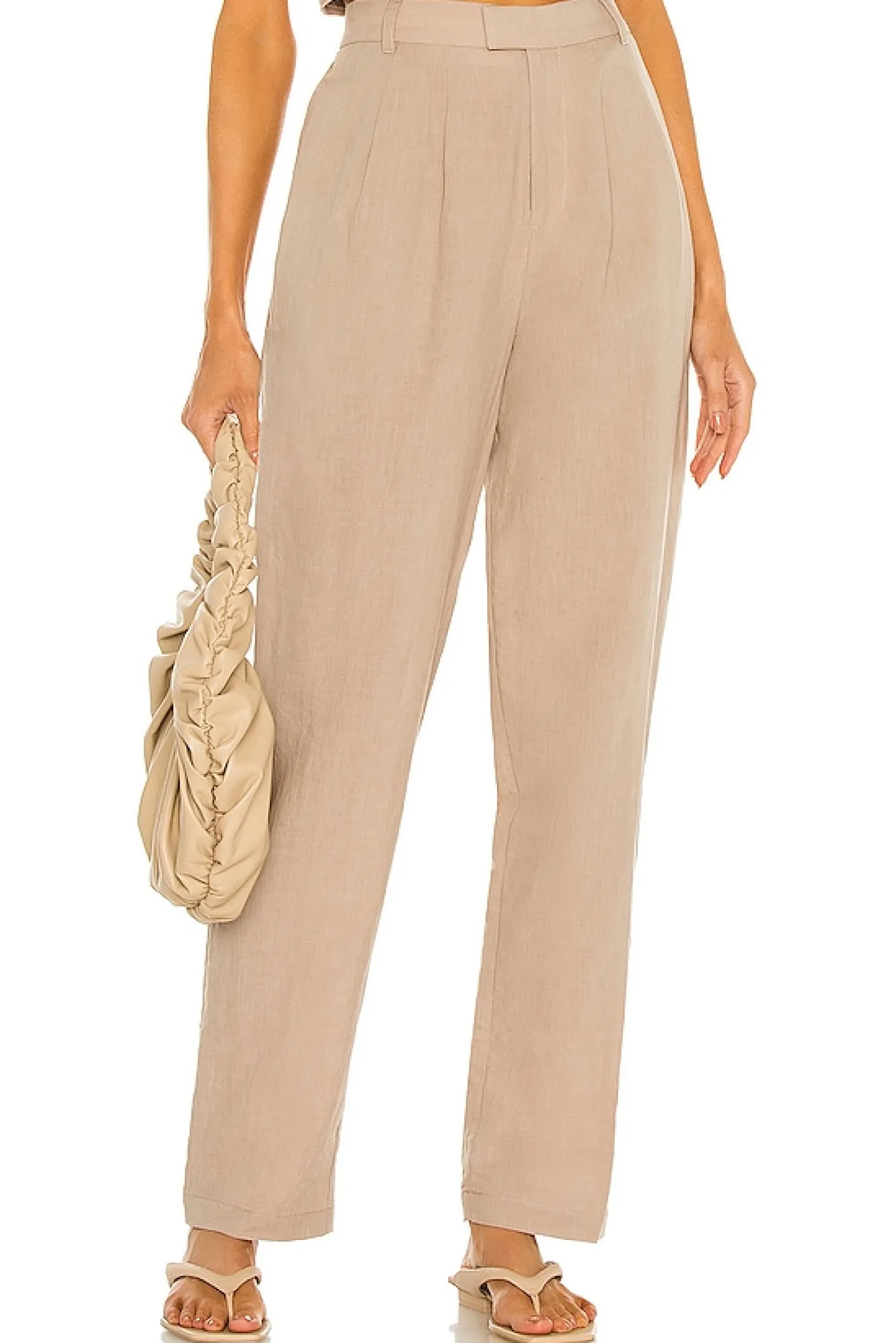 Self: 70% linen 30% cotton Lining: 100% cotton.Made in China.Hand wash.Zip fly with hook and bar closure.Side seam pockets.Lightweight linen fabric.Item not sold as set.16" at the knee narrows to 12" at the leg opening