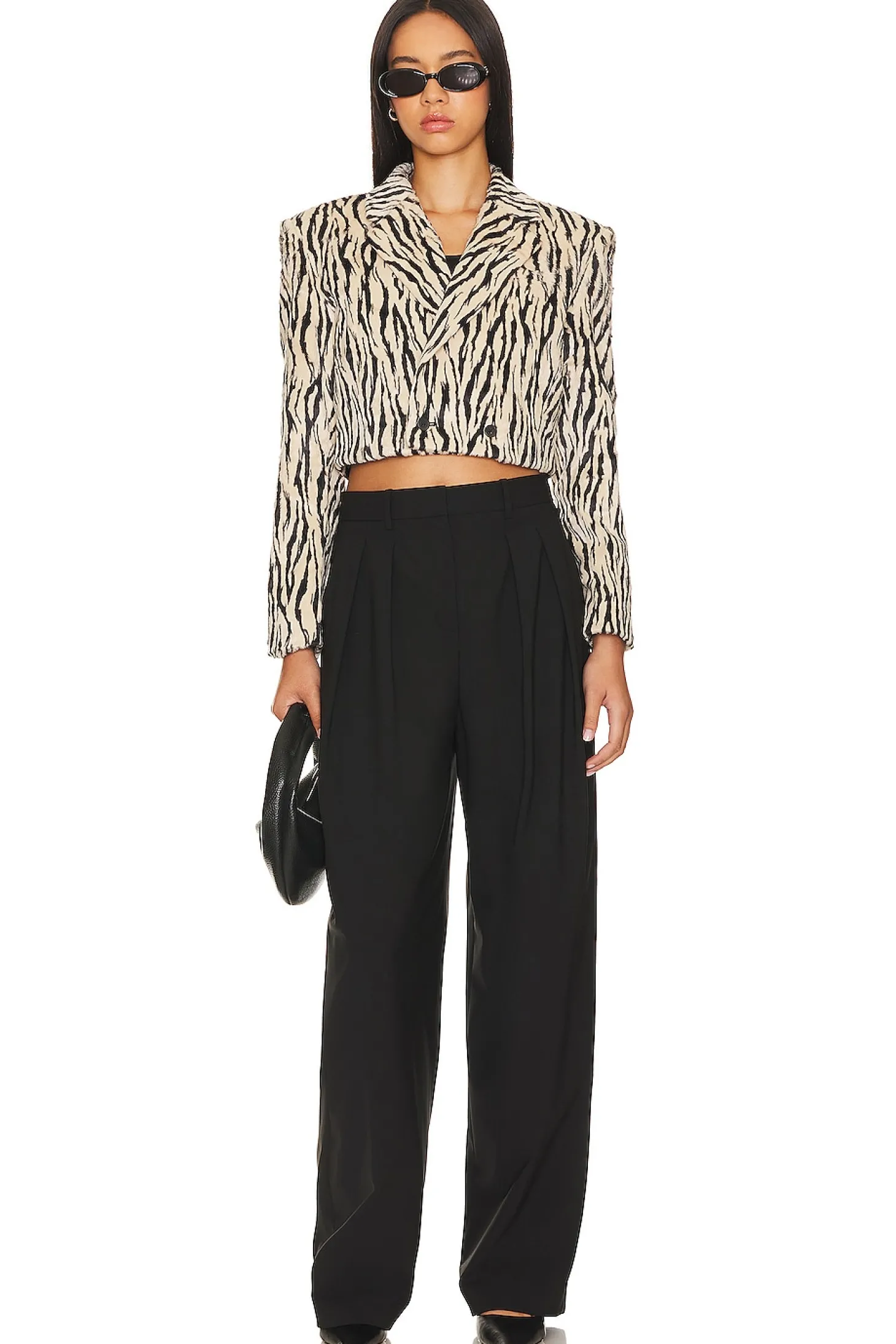 Self: 45% cotton 36% viscose 19% polyester Lining: 100% polyester.Made in China.Dry clean only.Singular front button closure.Padded shoulders.Soft faux fur fabric