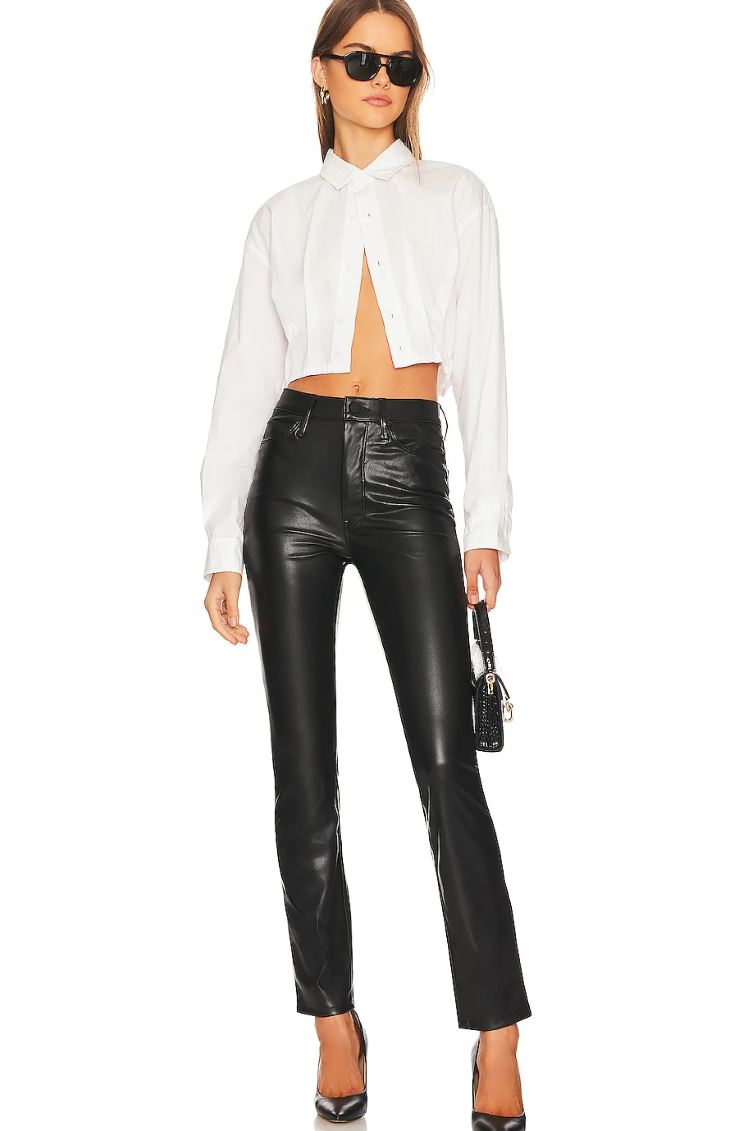 Self: 100% polyurethane Lining: 100% polyester.Made in USA.Hand wash.Zip fly with button closure.5-pocket styling.Faux leather fabric.13" at the knee and 13" at the leg opening