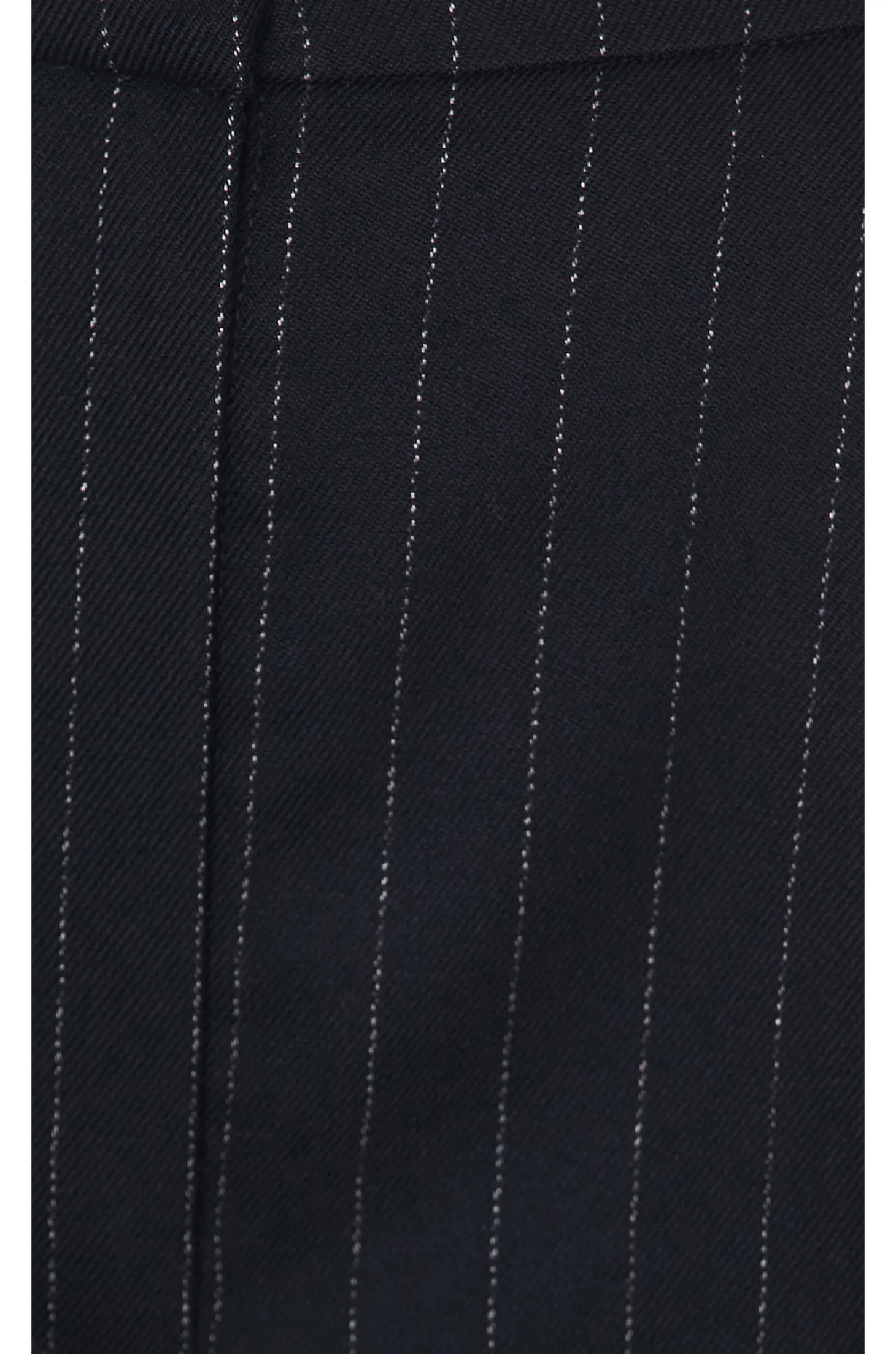Self: 65% polyester 33% rayon 2% elastane Lining: 100% cotton.Made in China.Hand wash.Zip fly with hook and bar closure.Side slant and back welt pockets.Jersey fabric with pinstripe design.20" at the knee and 20" at the leg opening