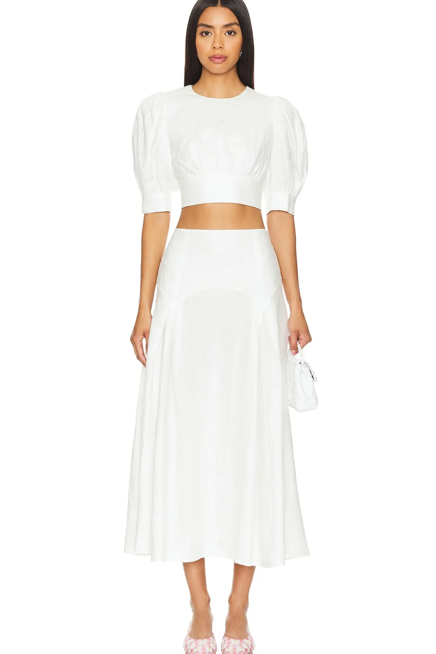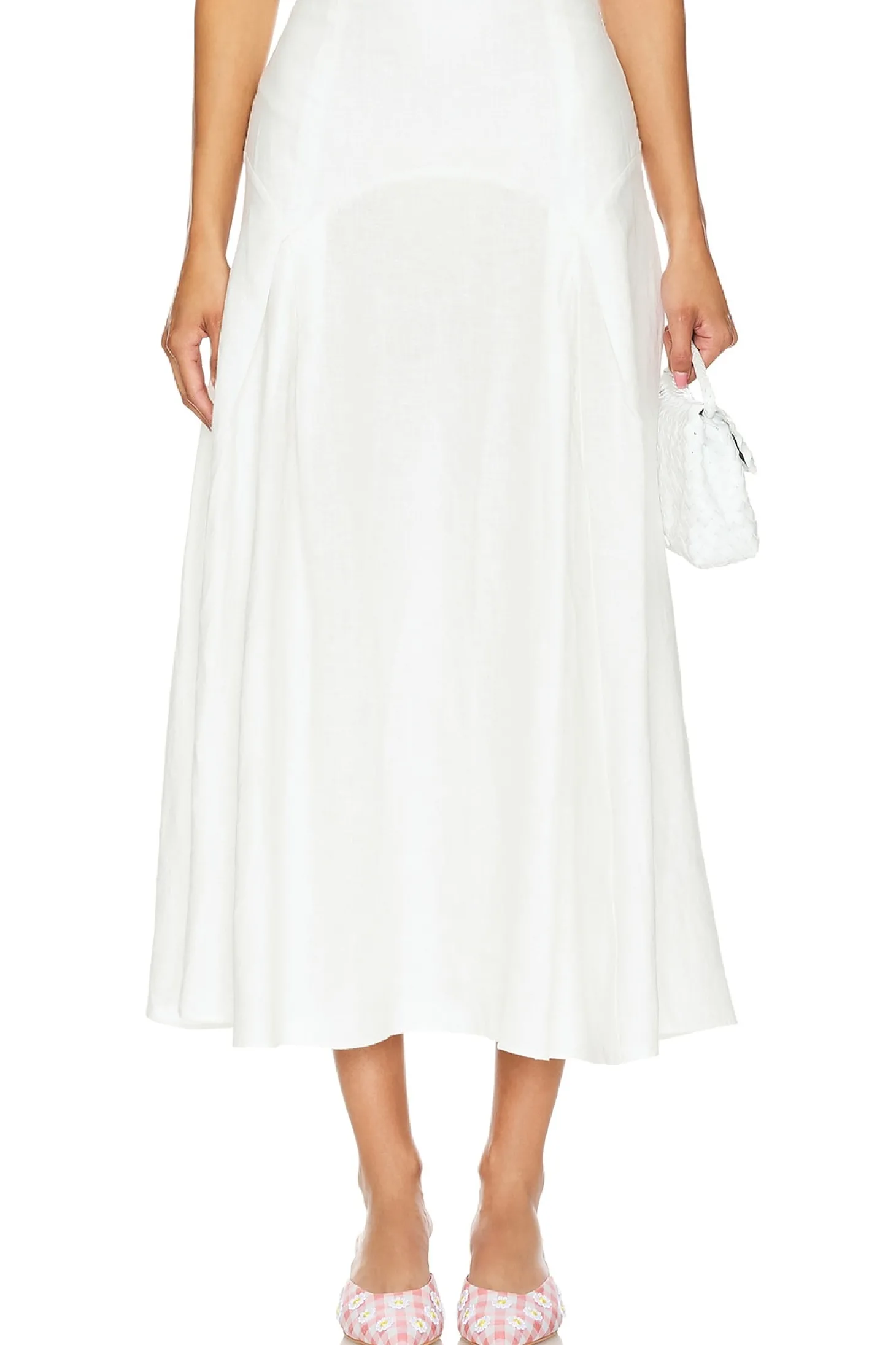Self: 100% linen Lining: 100% cotton.Made in China.Hand wash.Unlined.Hidden side zipper closure.Linen fabric.Item not sold as set.Skirt measures approx 35" in length