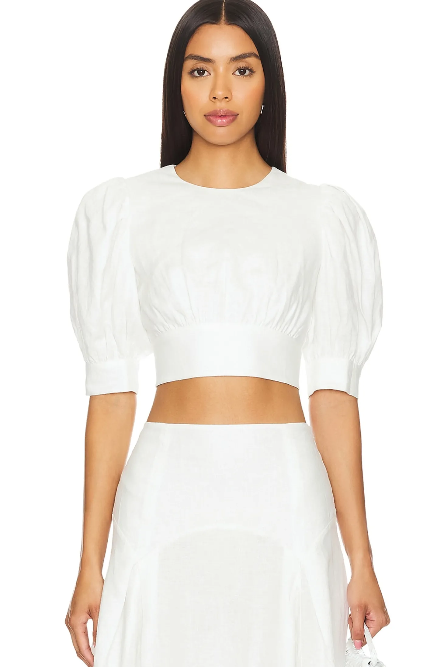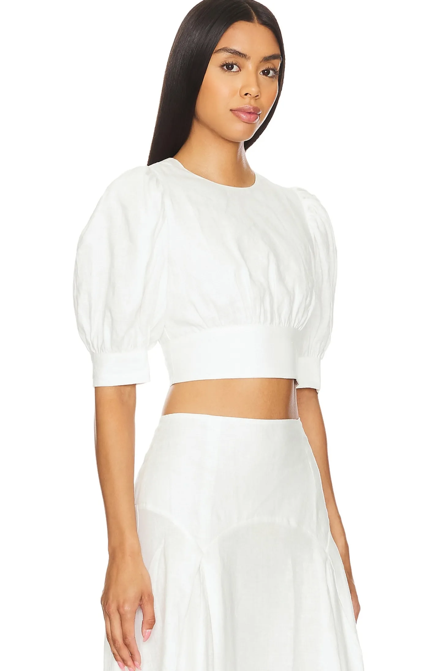 Self: 100% linen Lining: 100% cotton.Made in China.Hand wash.Hook and eye clasp closure at neck with tie-up at back.Open cut-out design at back.Fitted at cuffs.Linen fabric Item not sold as a set