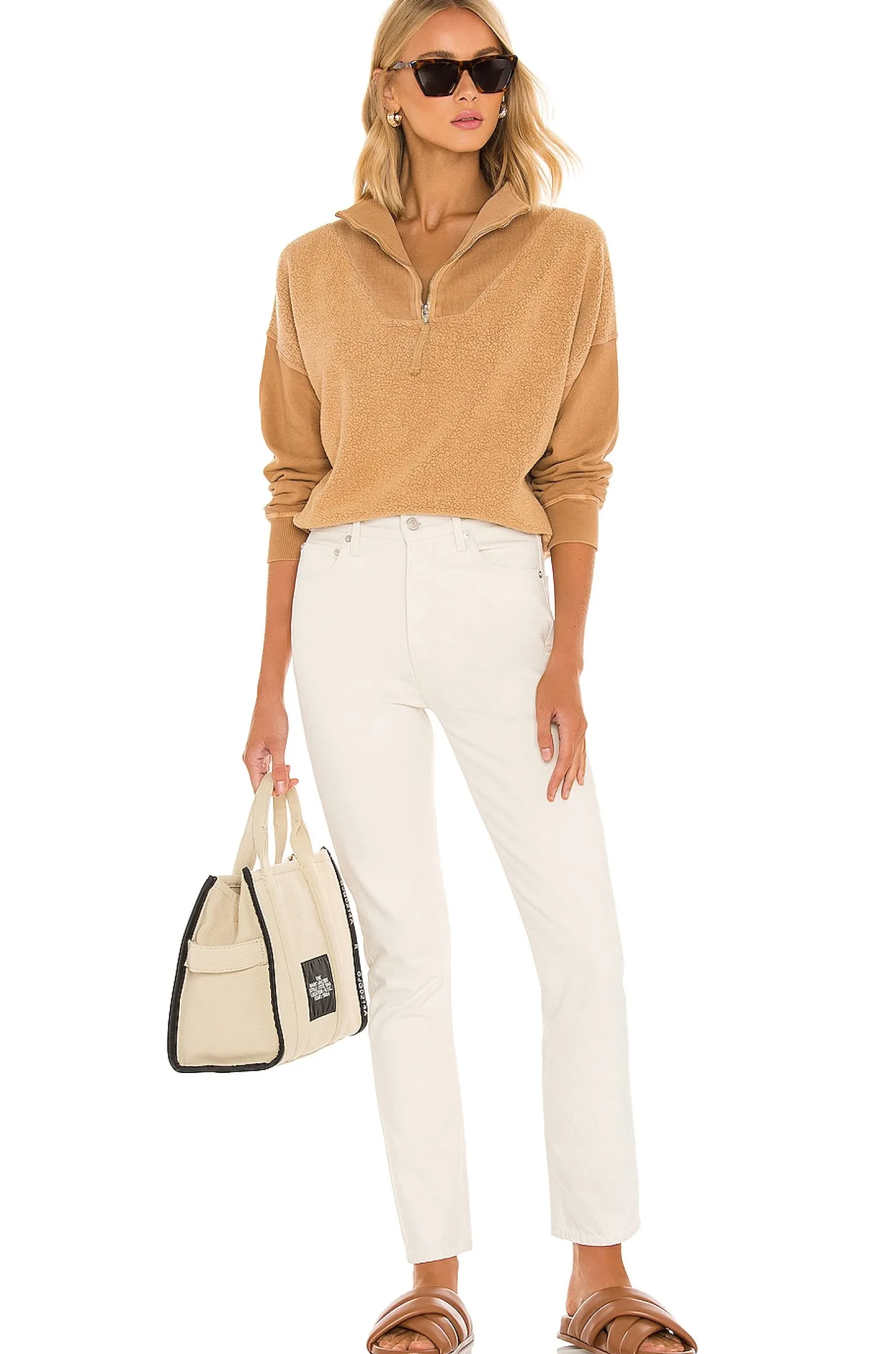 Self: 70% cotton 30% poly Contrast Fabric: 100% cotton.Made in USA.Machine wash.Partial front zipper closure.Fleece fabric with banded hem