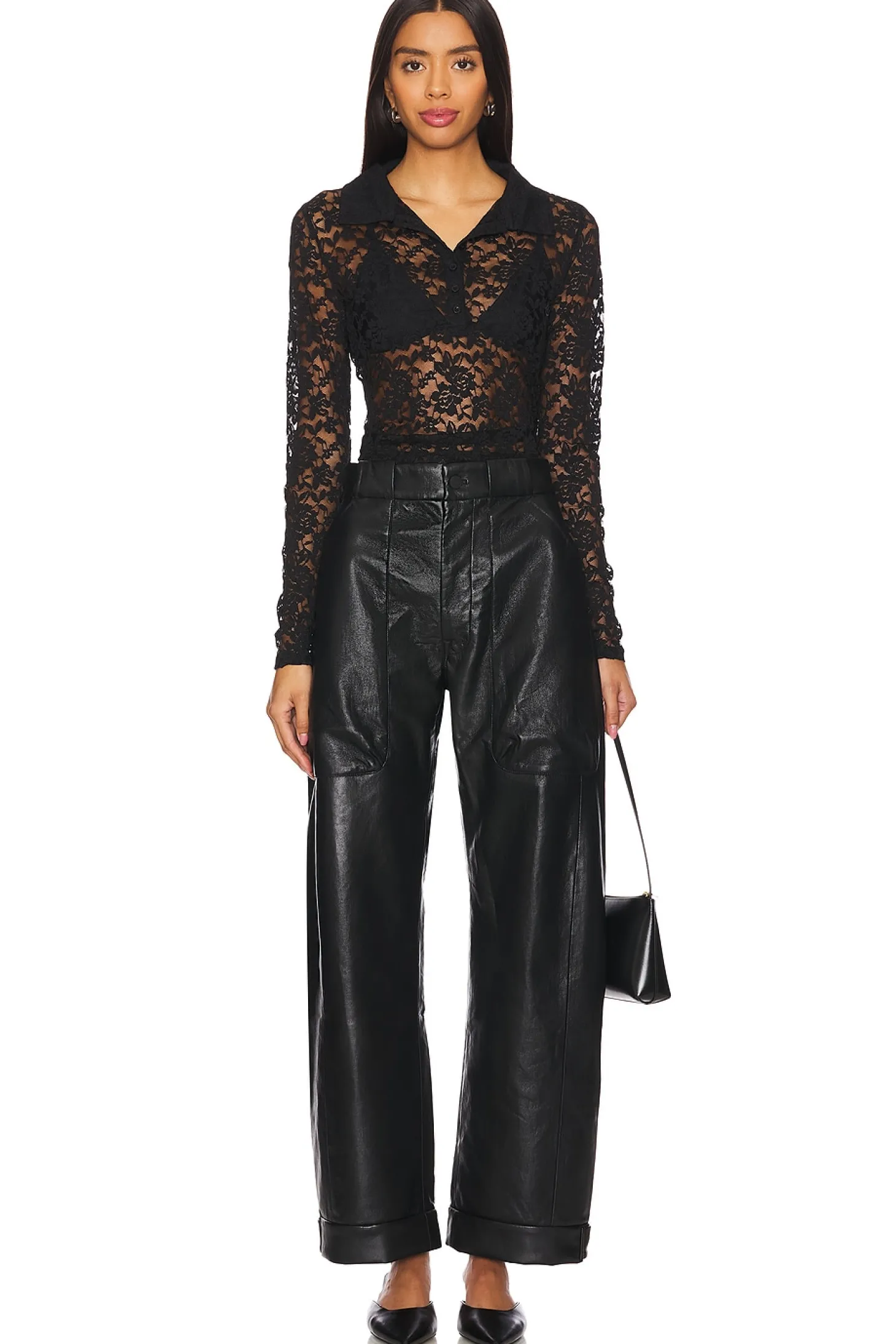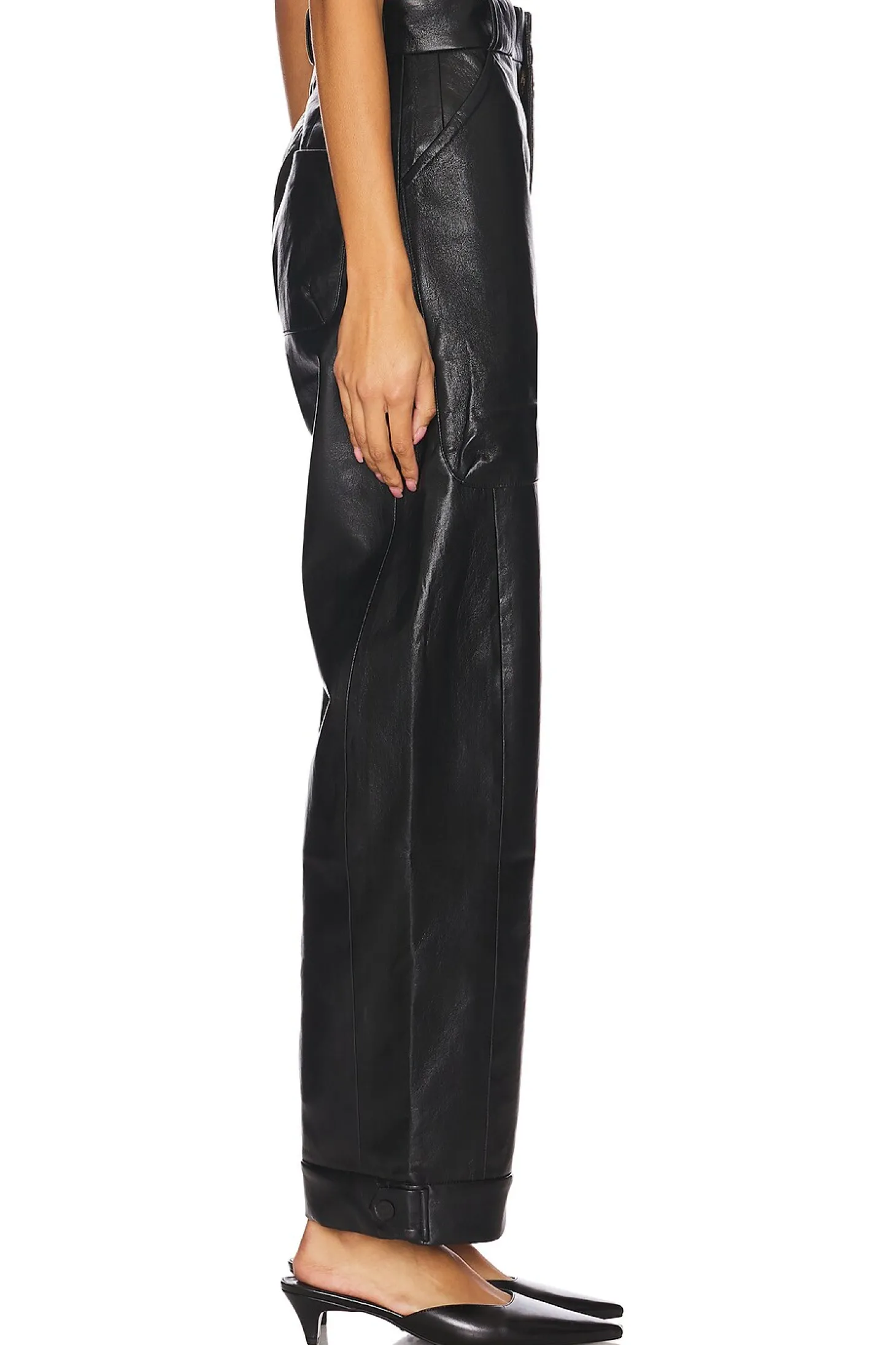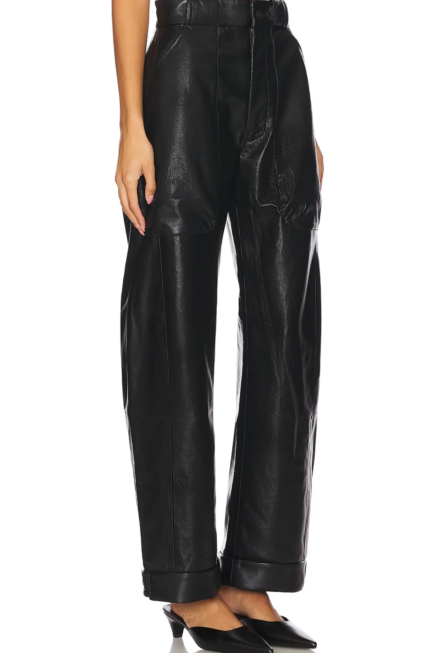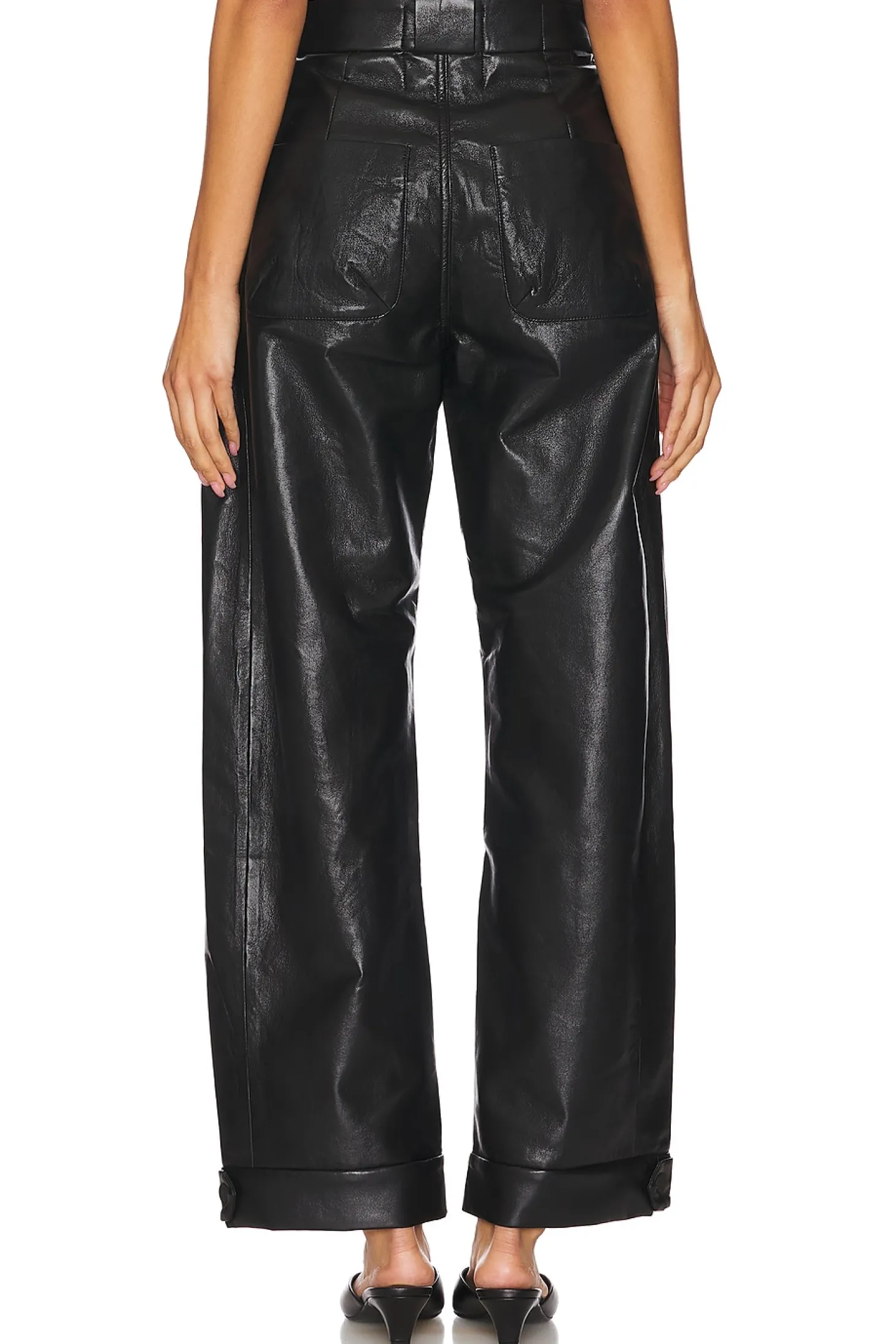 Self 1: 100% polyurethane Self 2: 60% recycled leather 40% polyester.Made in China.Dry clean only.Fly zip with button closure.4-pocket styling.Midweight leather fabric.22" at the knee narrows to 18" at the leg opening
