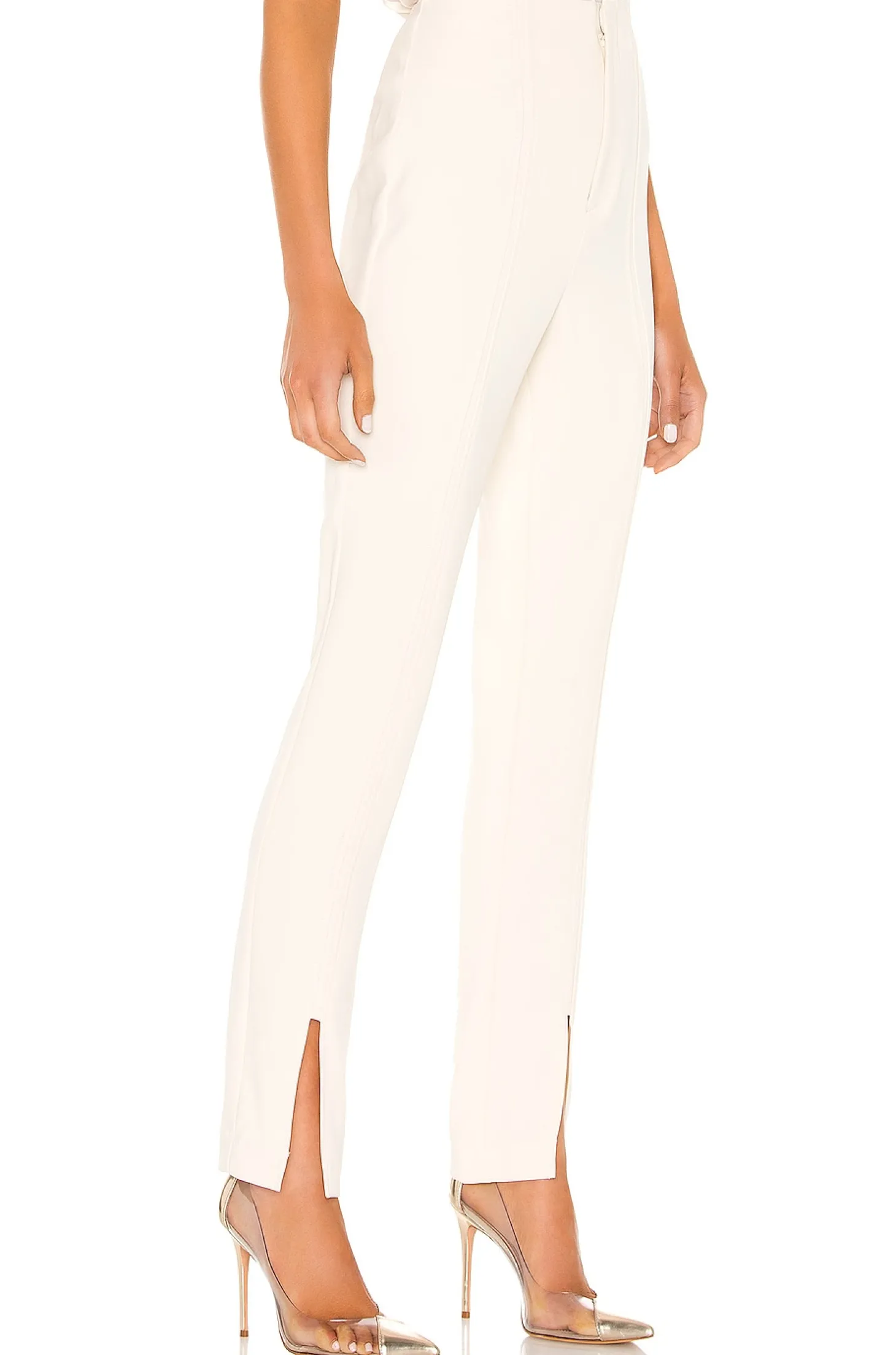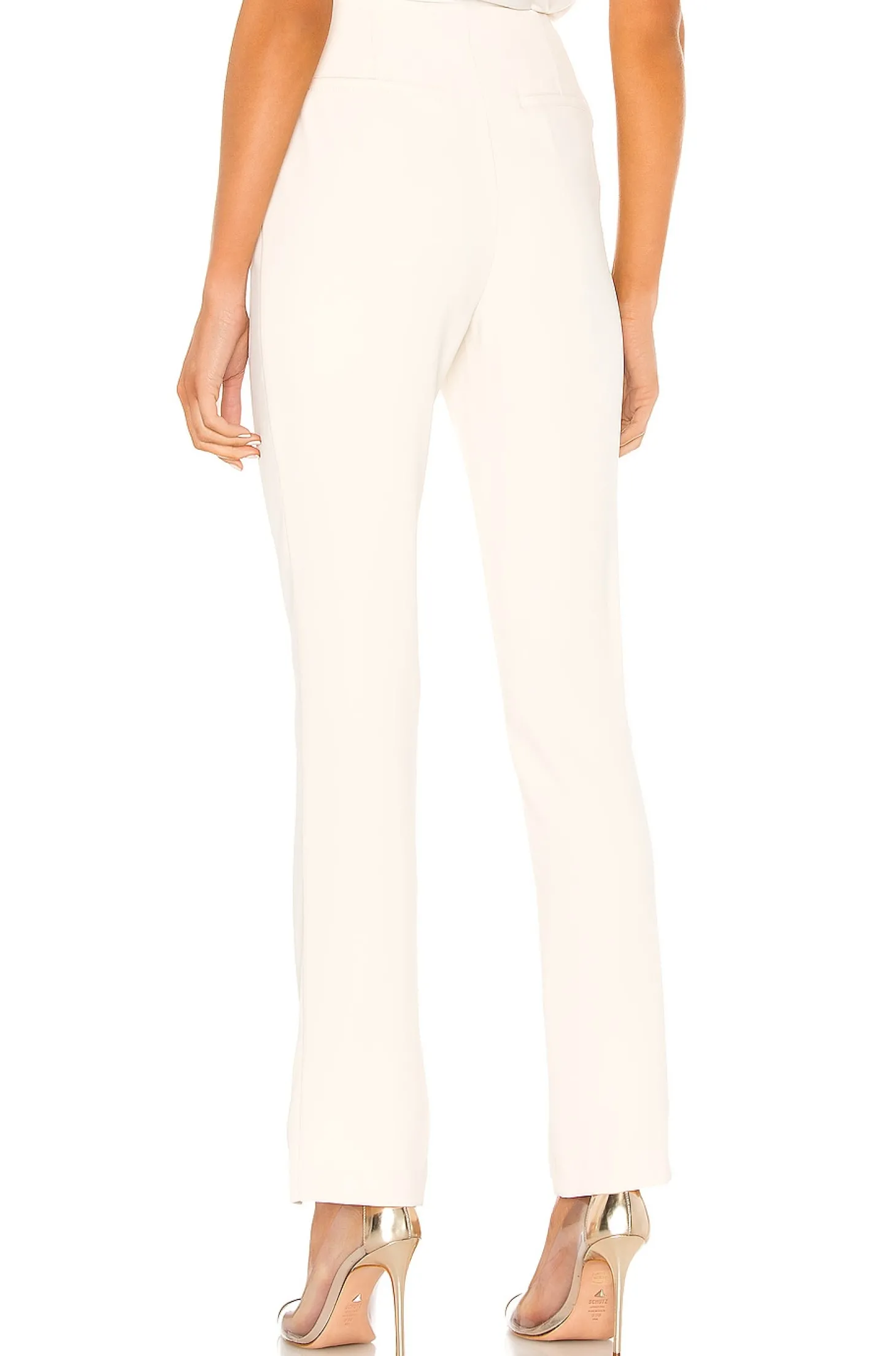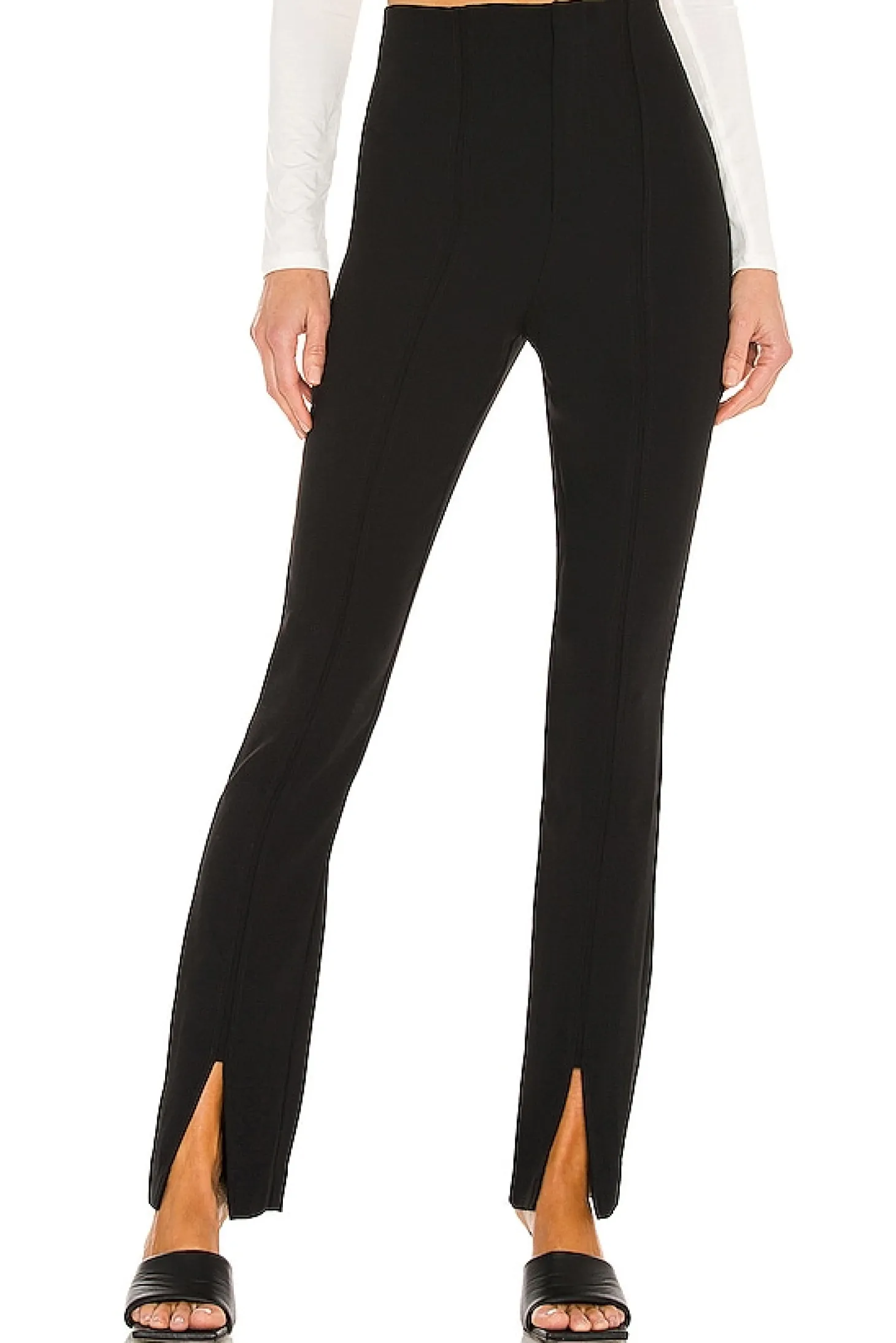 Self: 100% poly Combo: 55% poly 45% viscose.Zip fly with hook and bar closure.Front pintuck seam with split hem.Crepe fabric.14" at the knee narrows to 12" at the leg opening.Imported