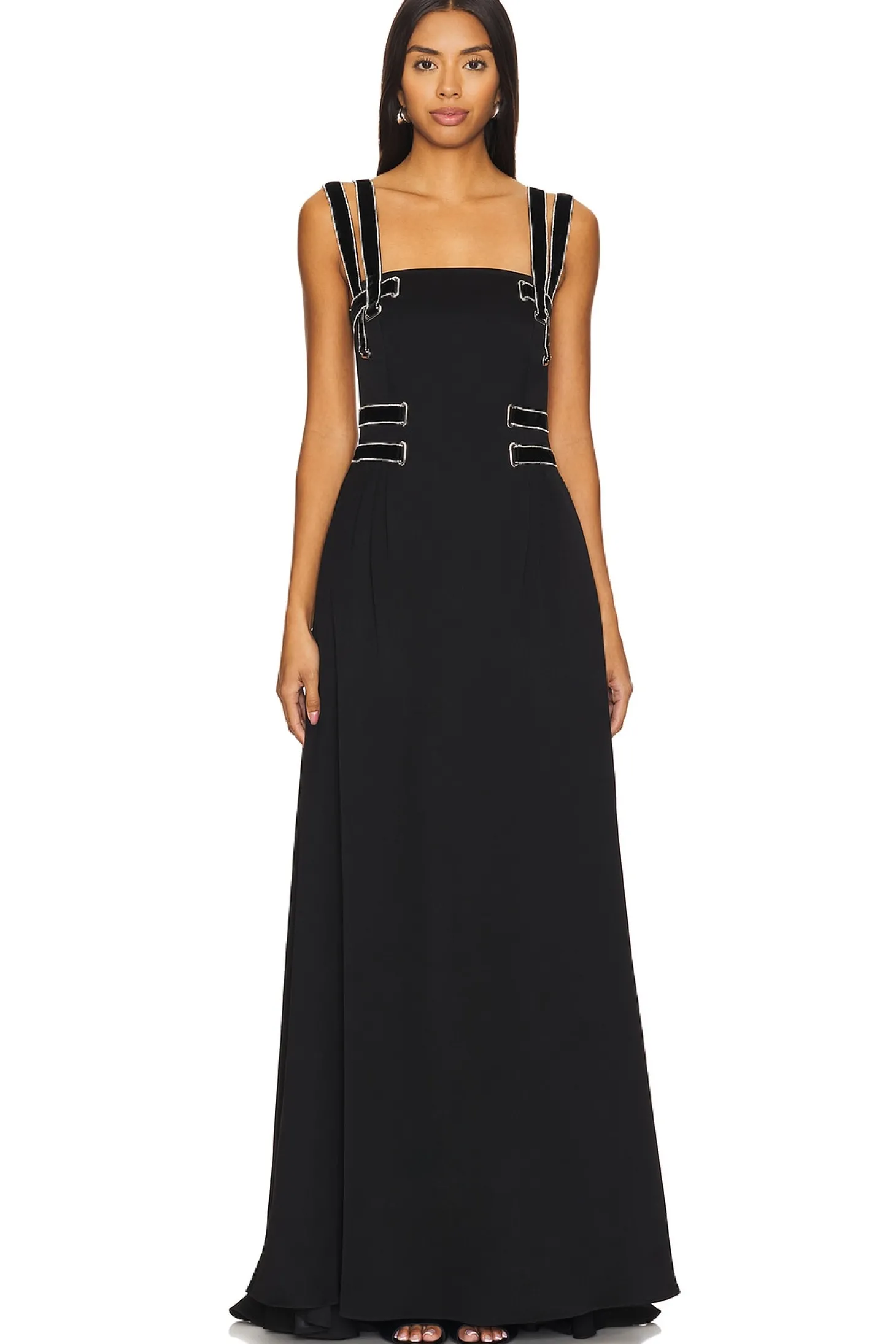 100% polyester.Made in United Arab Emirates.Dry clean only.Fully lined.Hidden back zipper closure.Crystal embellished velour fabric strappy design.Side seam pockets Heavyweight satin fabric