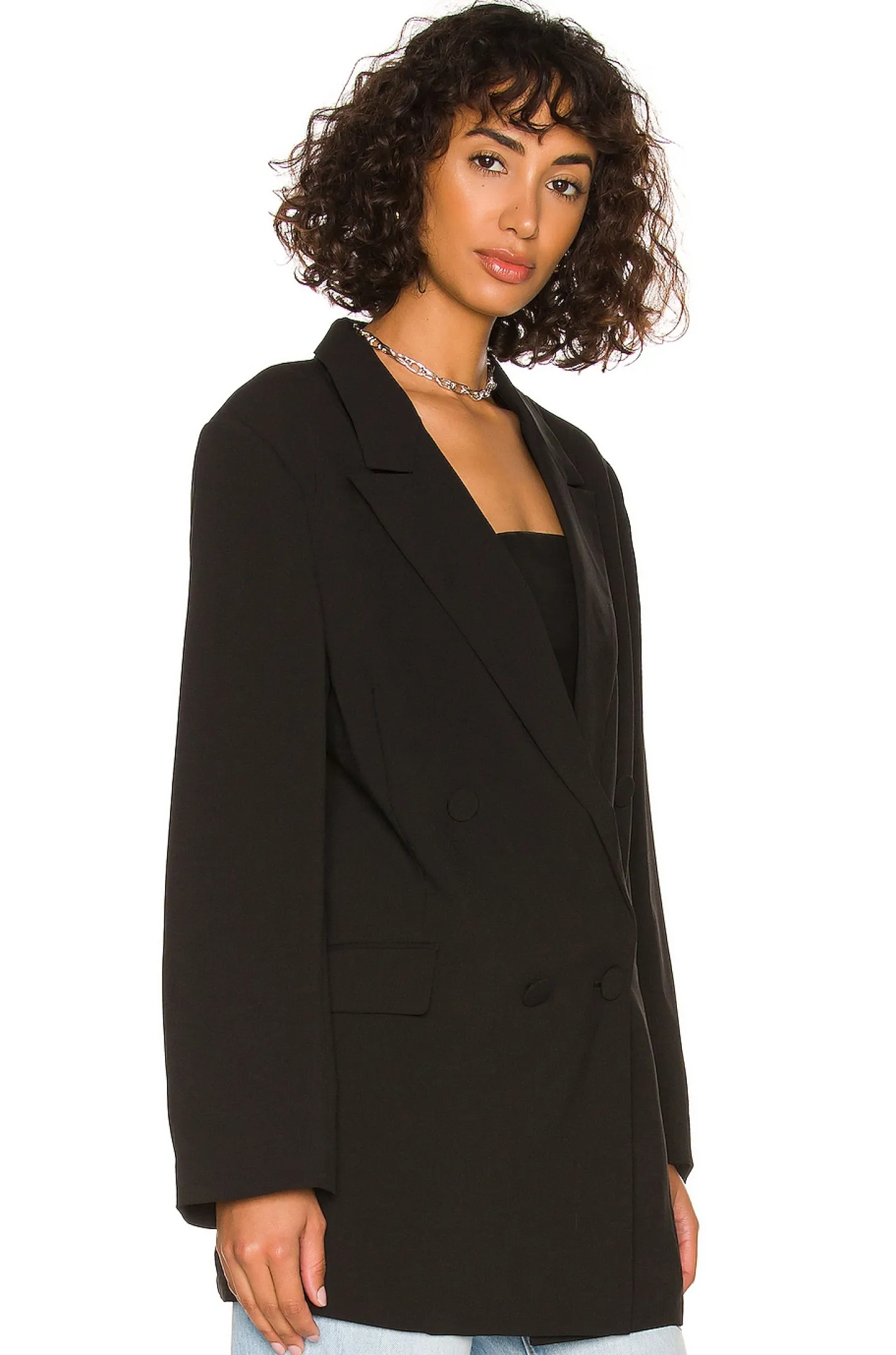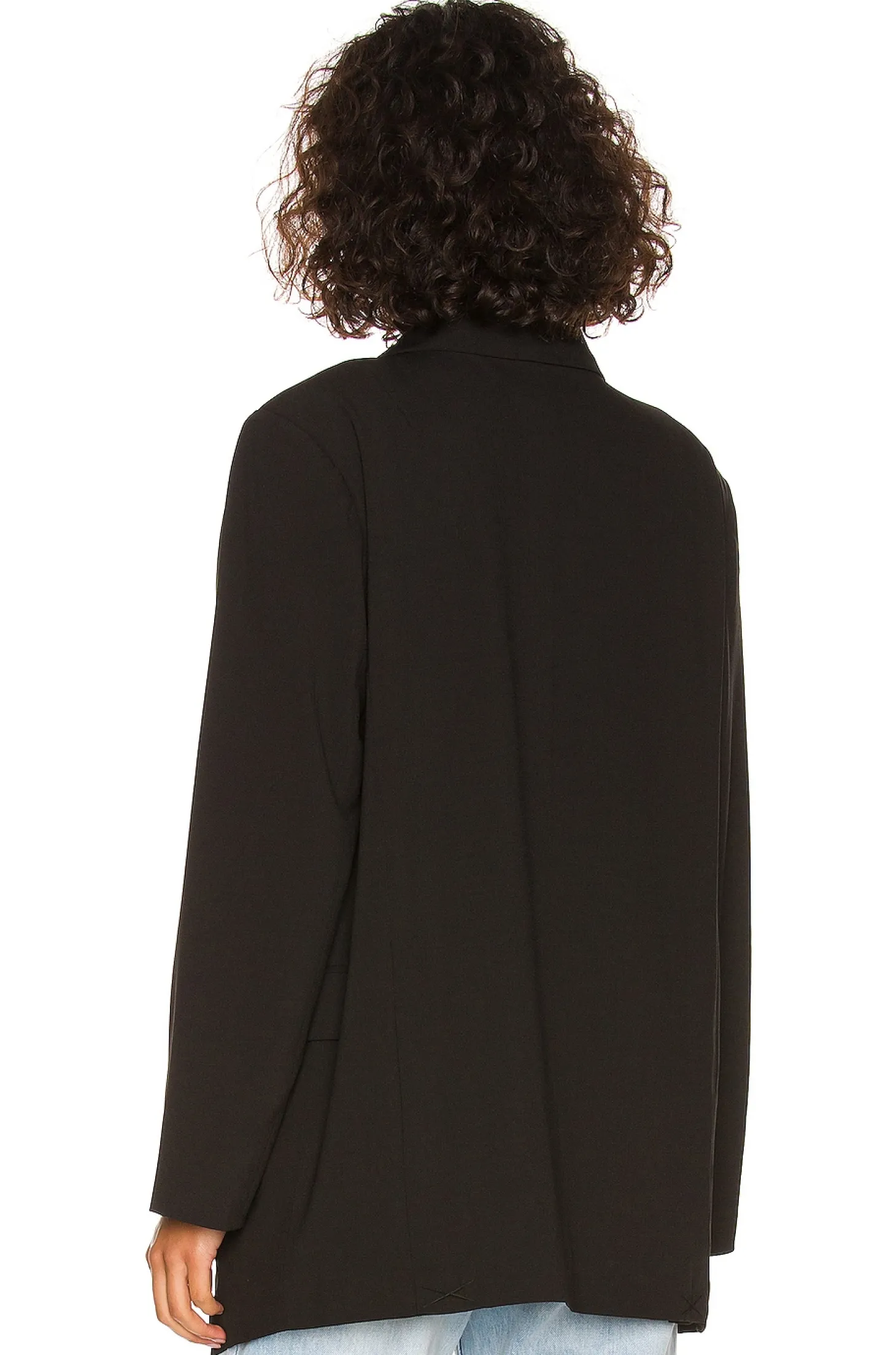 Self: 97% poly 3% elastane Lining: 98% poly 2% elastane.Made in China.Hand wash.Double breasted front button closure.Lightly padded shoulders.Side flap pockets.Crepe fabric