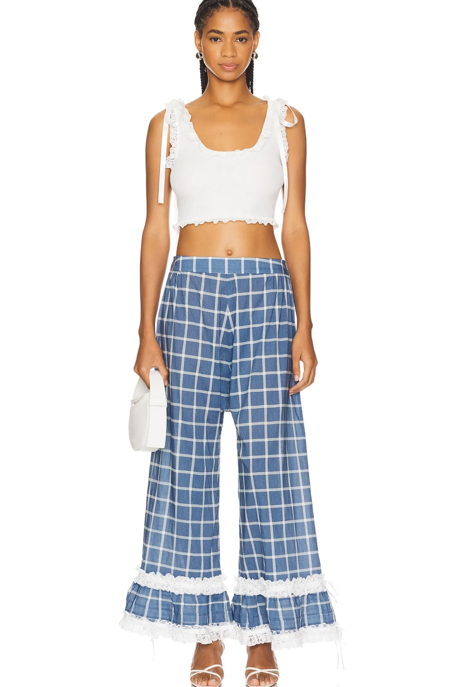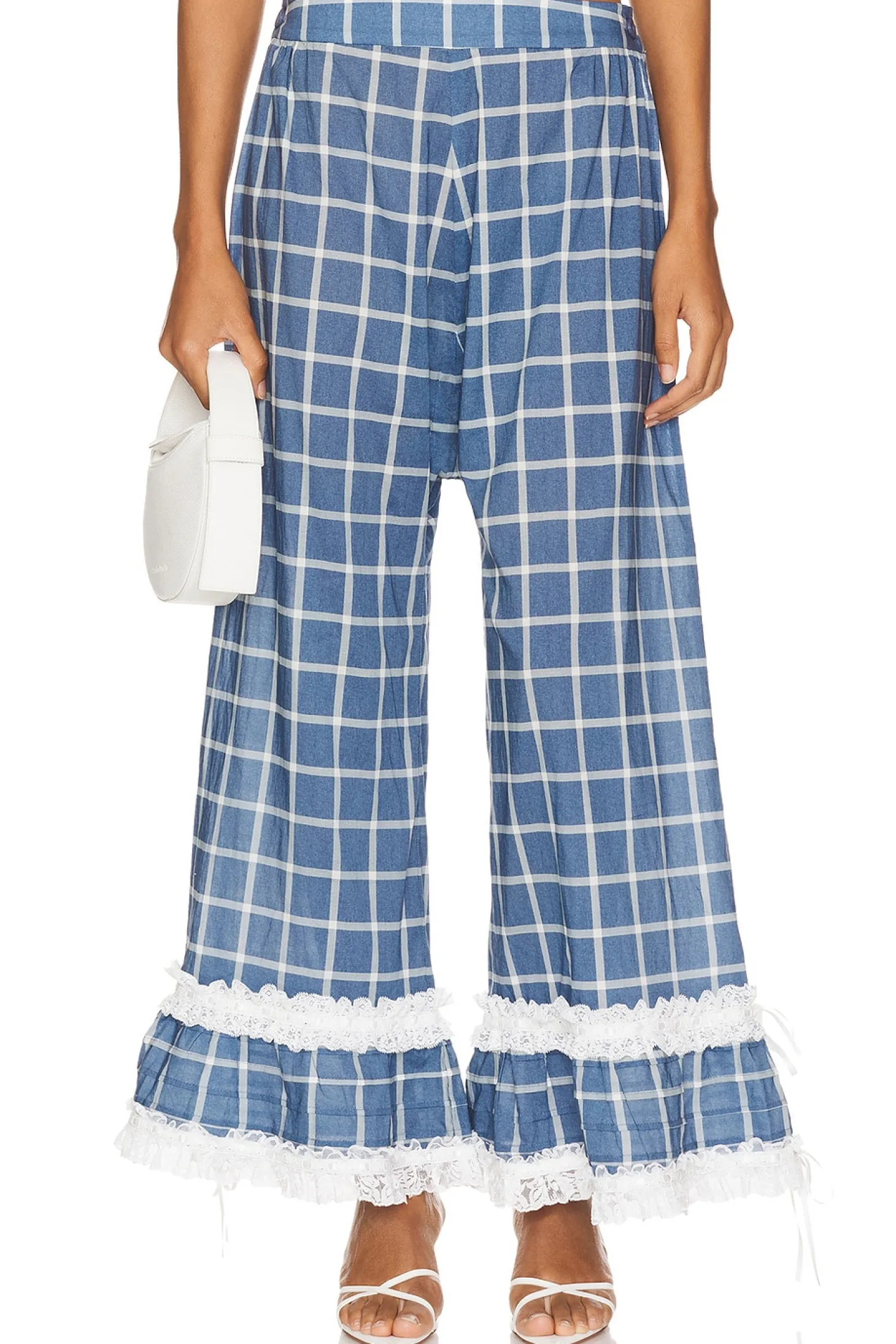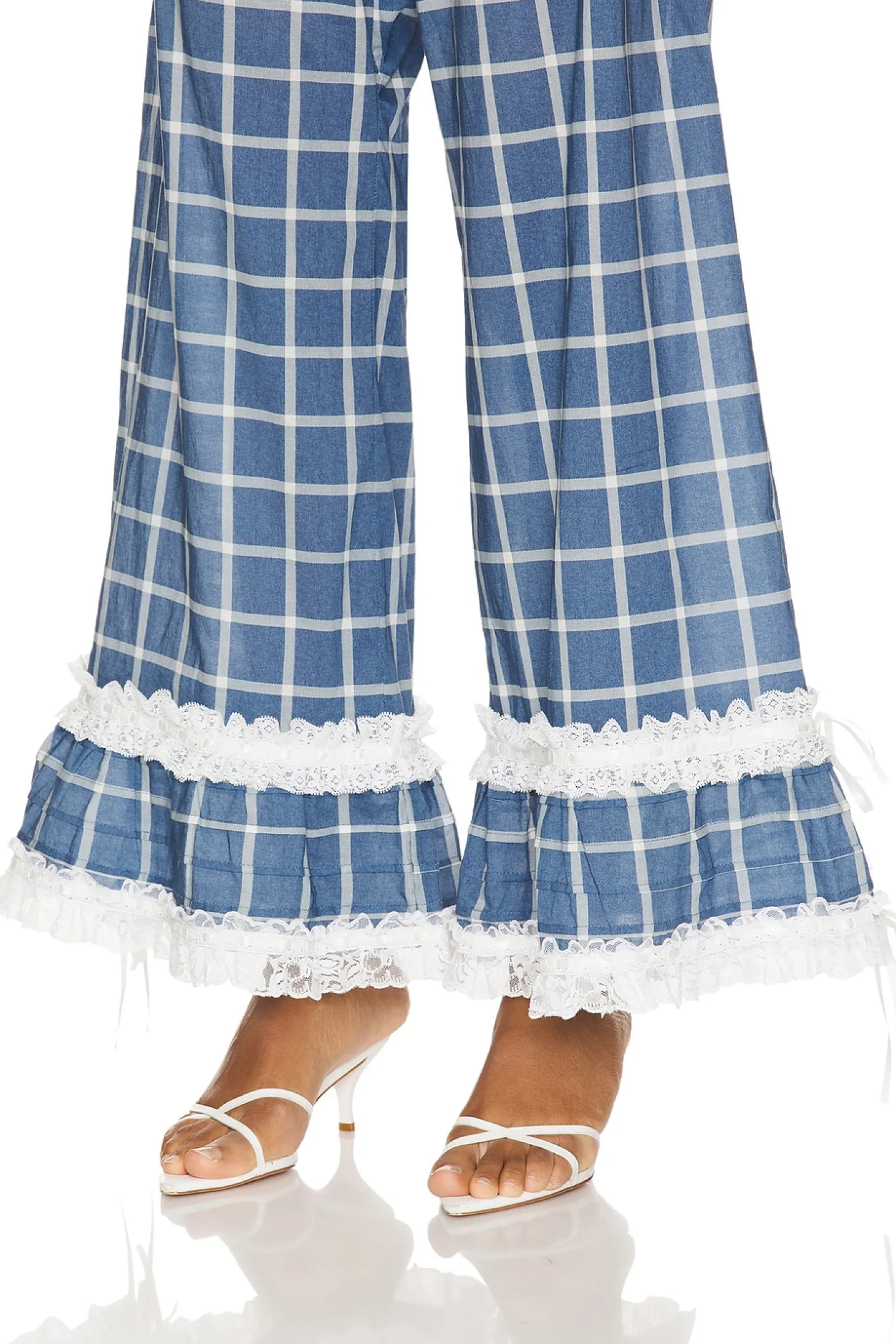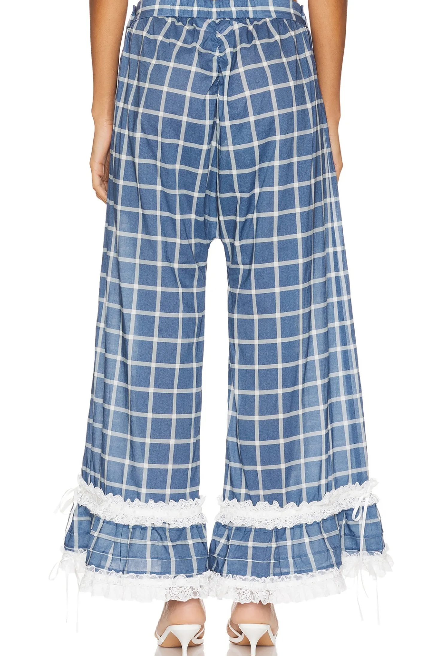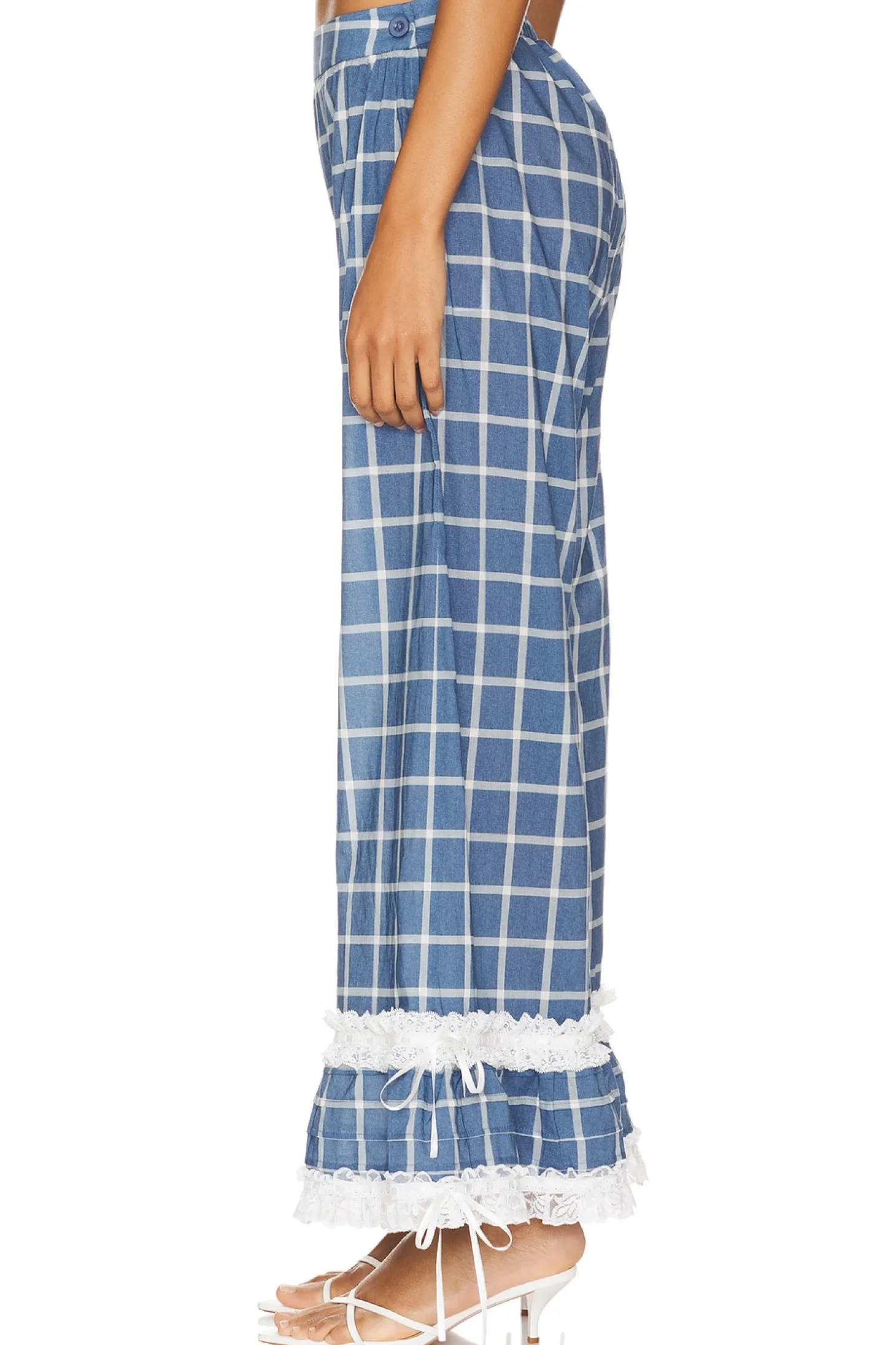 100% cotton.Made in China.Machine wash.Pull-on styling with side button closures.Lace trim at hem with satin bow accents.Poplin fabric.Item not sold as set.23" at the knee breaks to 35" at the leg opening