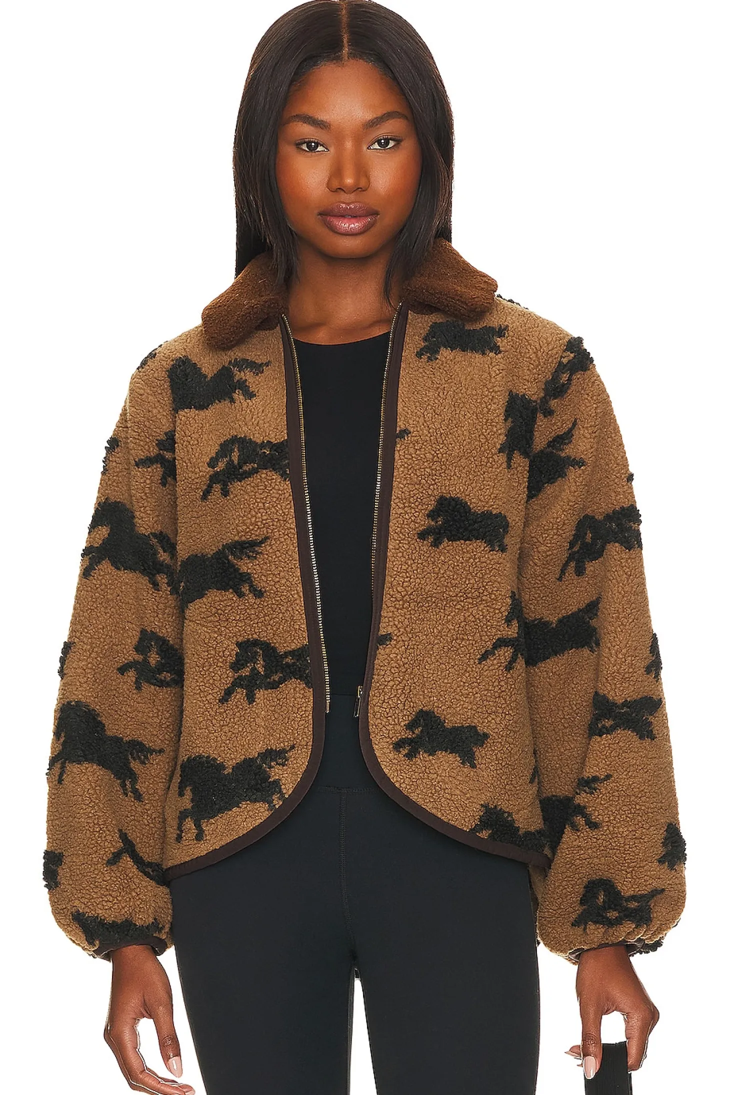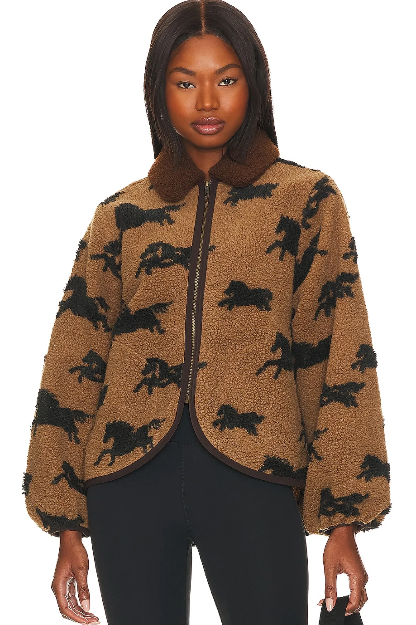 100% polyester.Made in China.Dry clean only.Front zipper closure.Side slant pockets.Curved hem.Curled fleece fabric with contrast trim