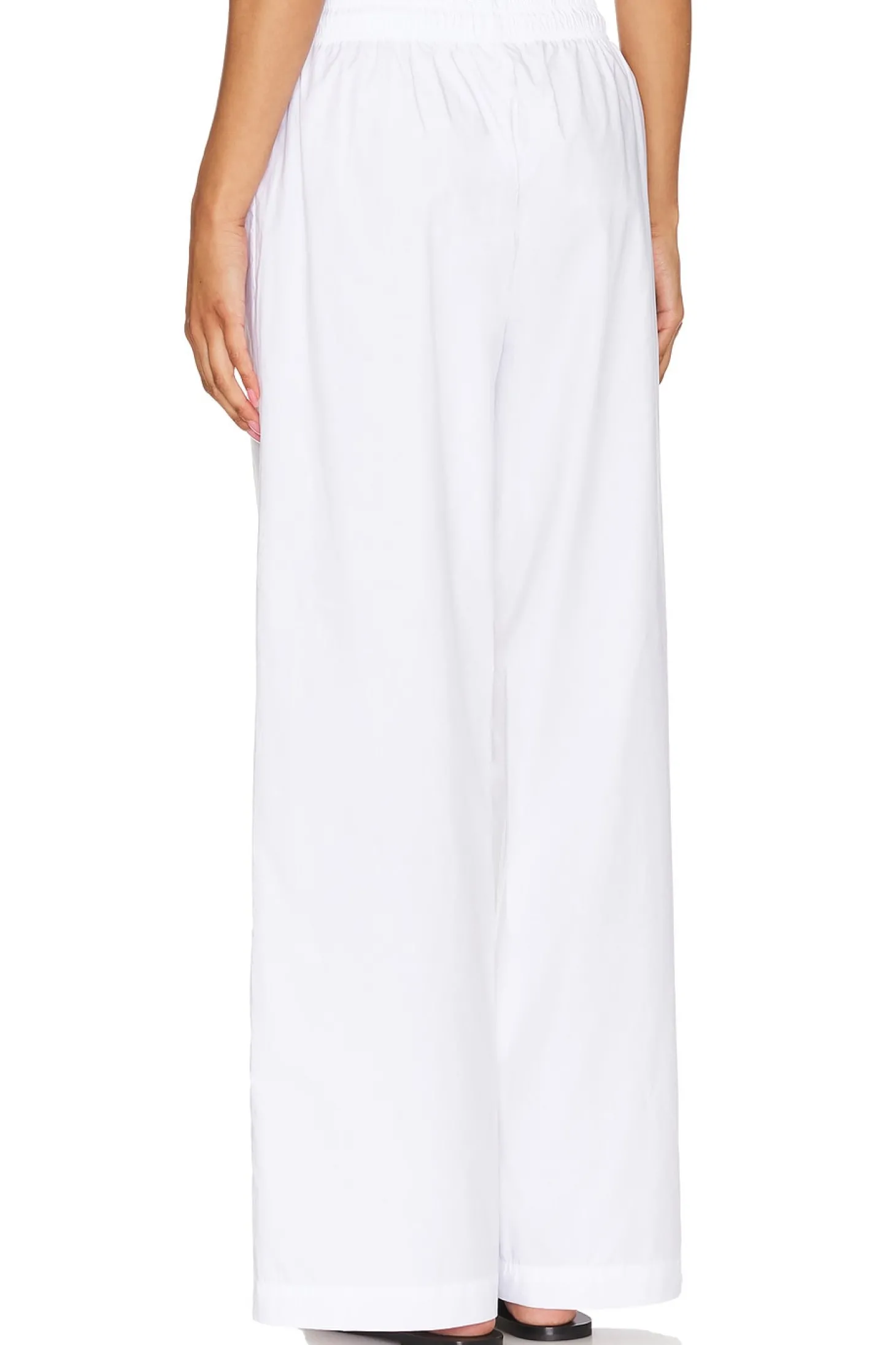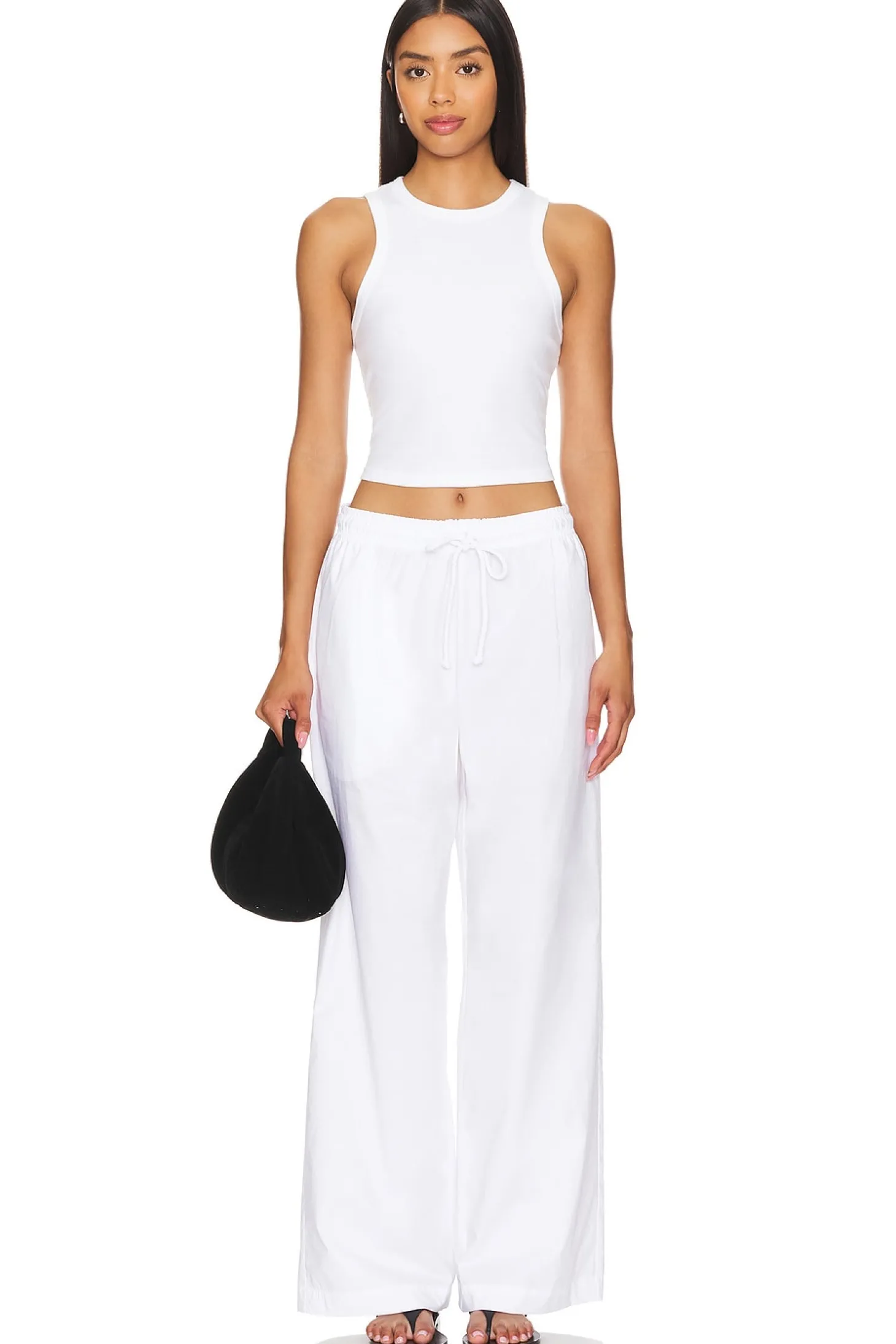 100% linen.Made in USA.Machine wash.Elastic waistband with drawstring.Side pockets.25" at the knee narrows to 24" at the leg opening