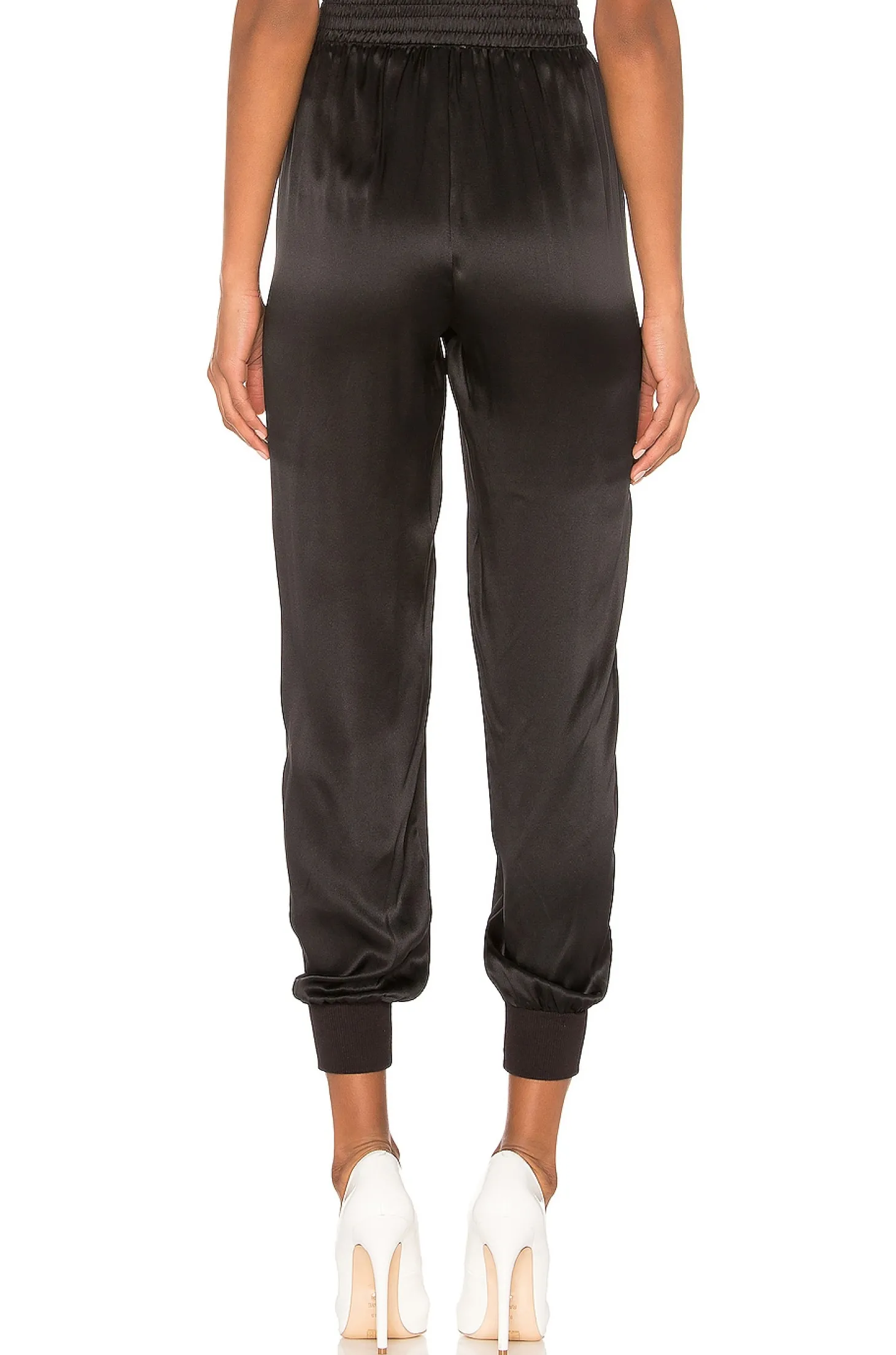 Self: 92% silk 8% spandex Rib: 95% cotton 5% spandex.Made in China.Dry clean only.Elasticized waist.Side slant pockets.Satin finish with ribbed knit cuffs.18" at the knee narrows to 8" at the leg opening