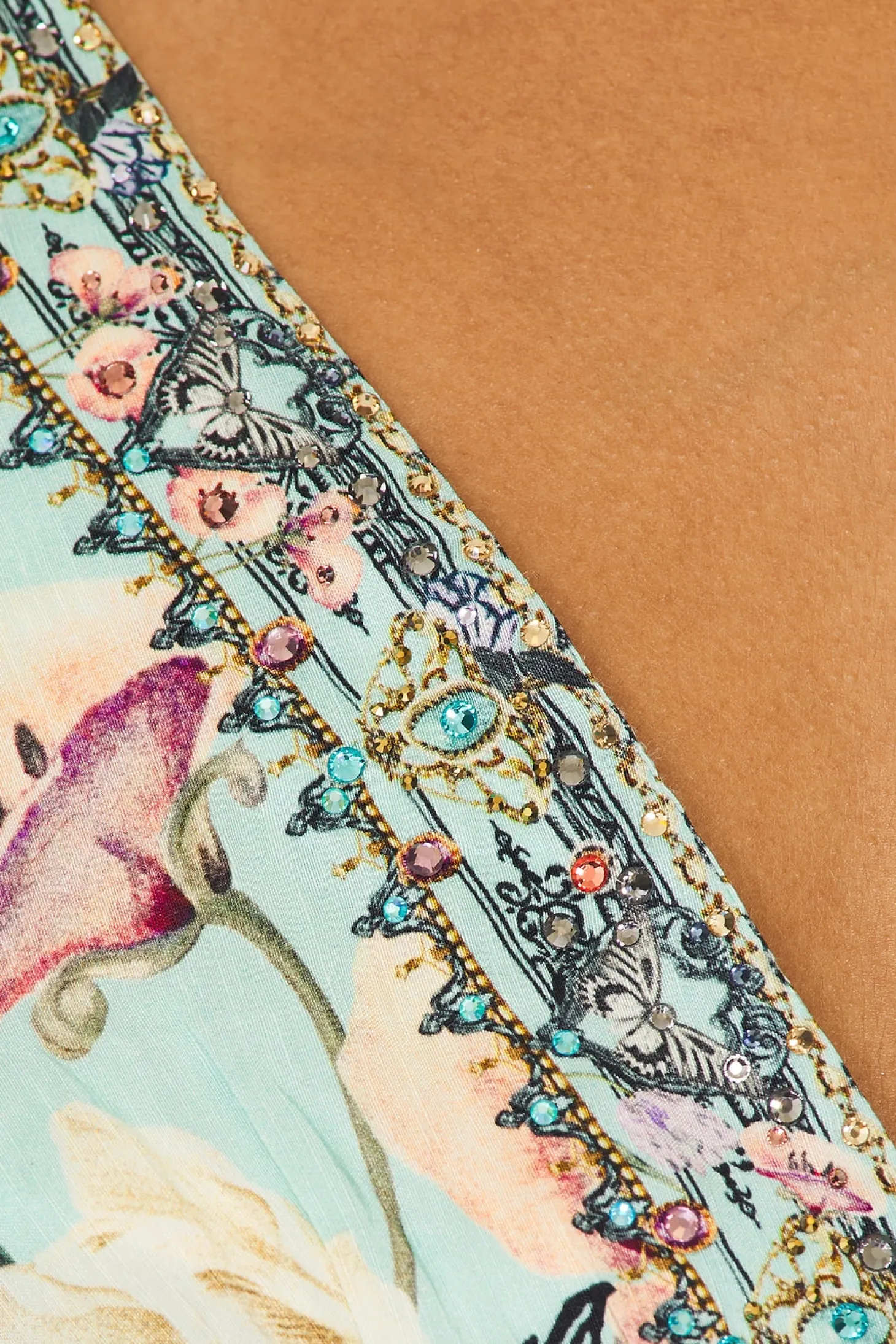 80% linen 20% silk.Made in India.Dry clean only.Unlined.Pull-on styling with adjustable shoulder straps.Linen fabric with stone embellished neckline and waist