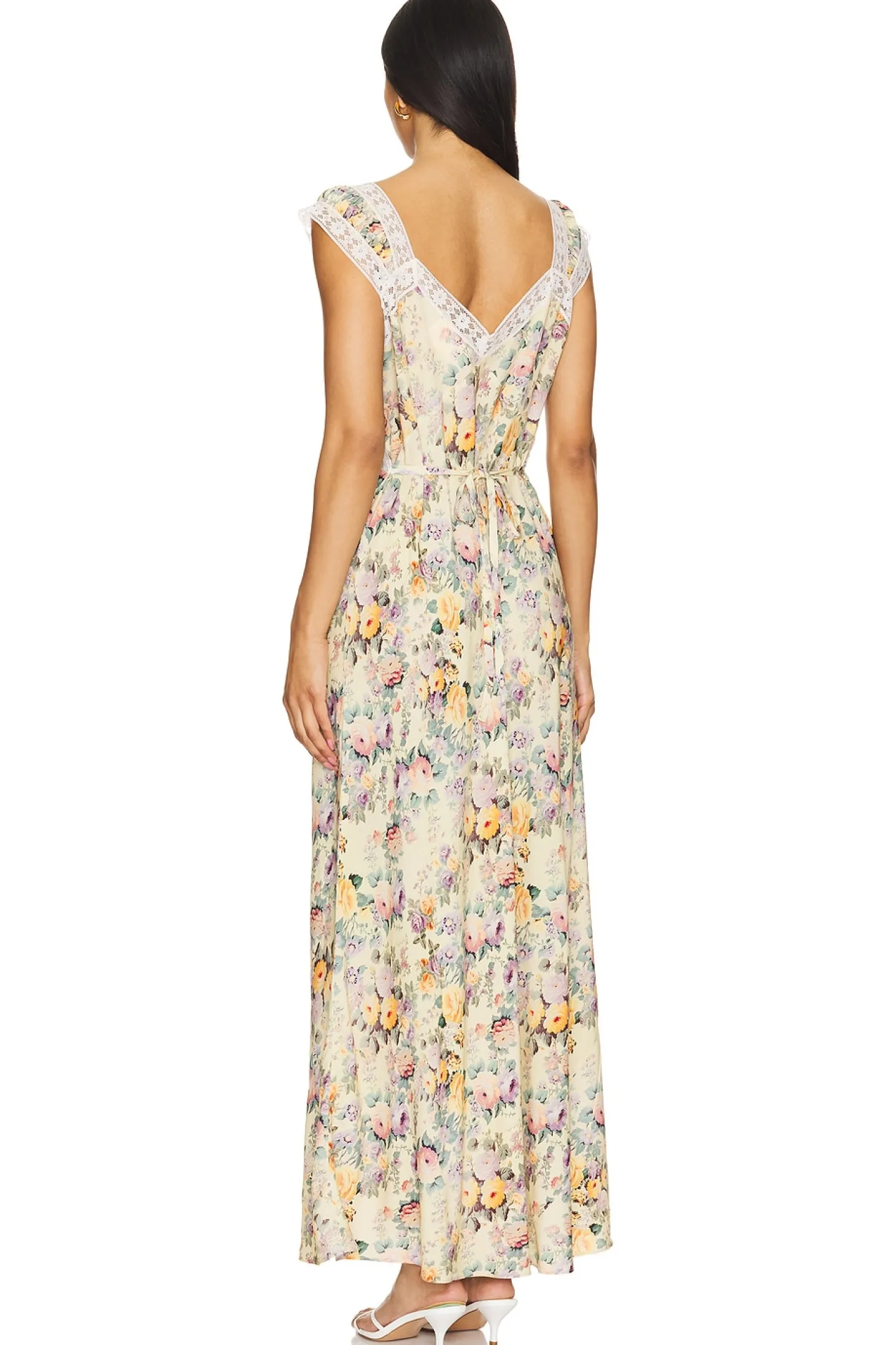 100% rayon.Made in China.Machine wash.Unlined.Pull-on styling.Waist tie accents.Lightweight satin fabric with floral lace trim