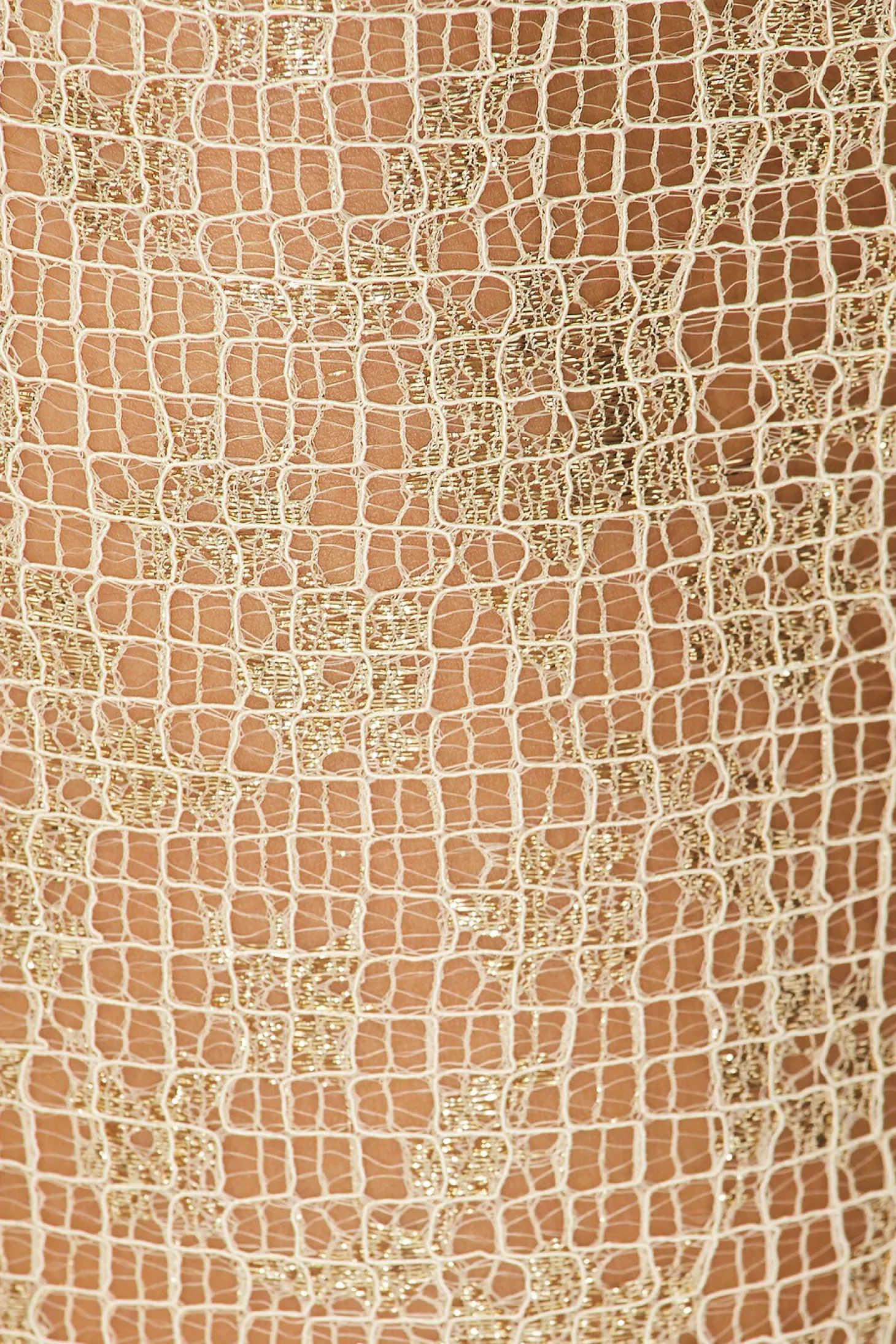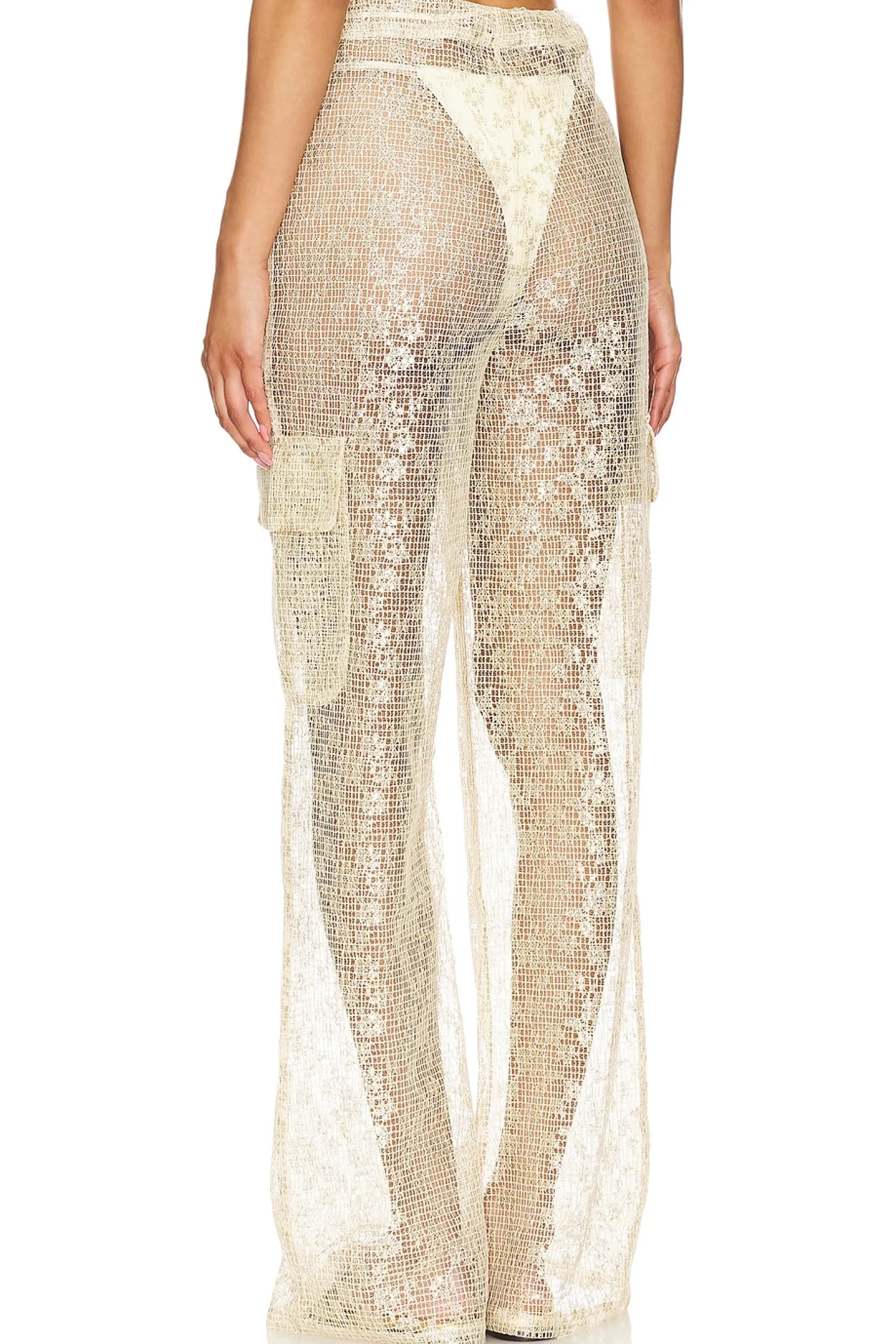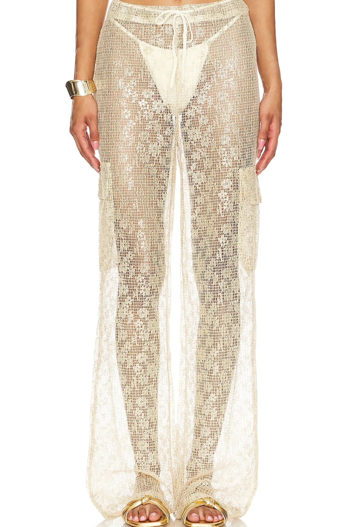 91% nylon 9% metallic fibers.Made in China.Hand wash.Drawstring waistband.Cargo pockets.Garment is intentionally sheer, undergarments will show through. Please note undergarment not included.Crochet knit fabric with metallic threading.22" at the knee and 22" at the leg opening