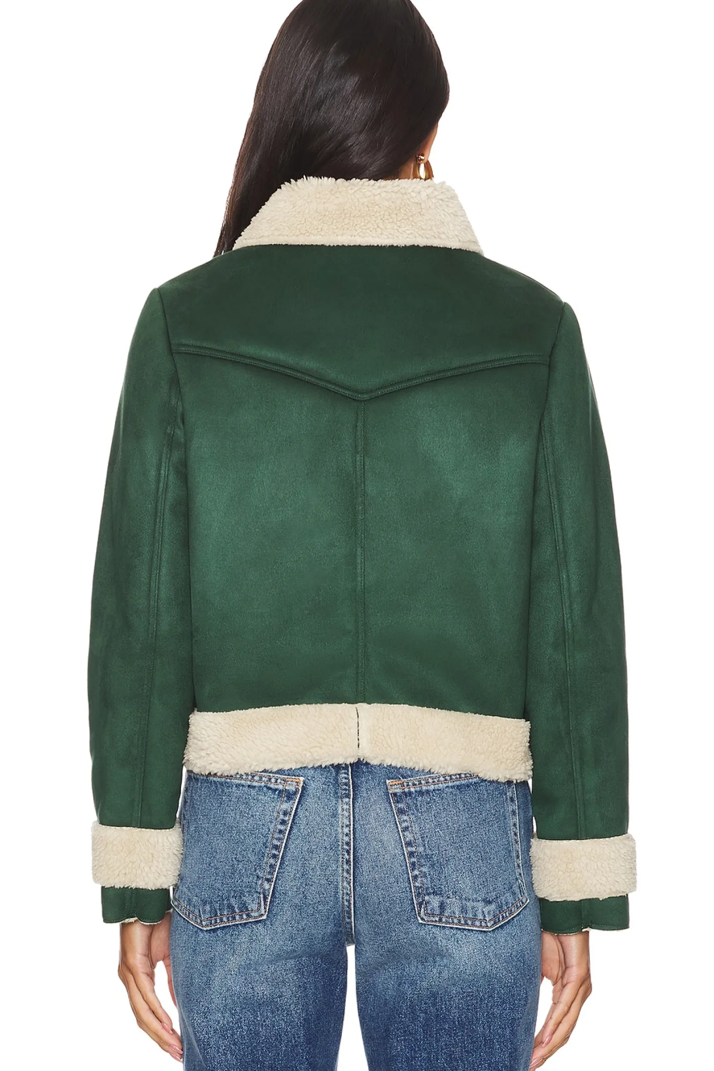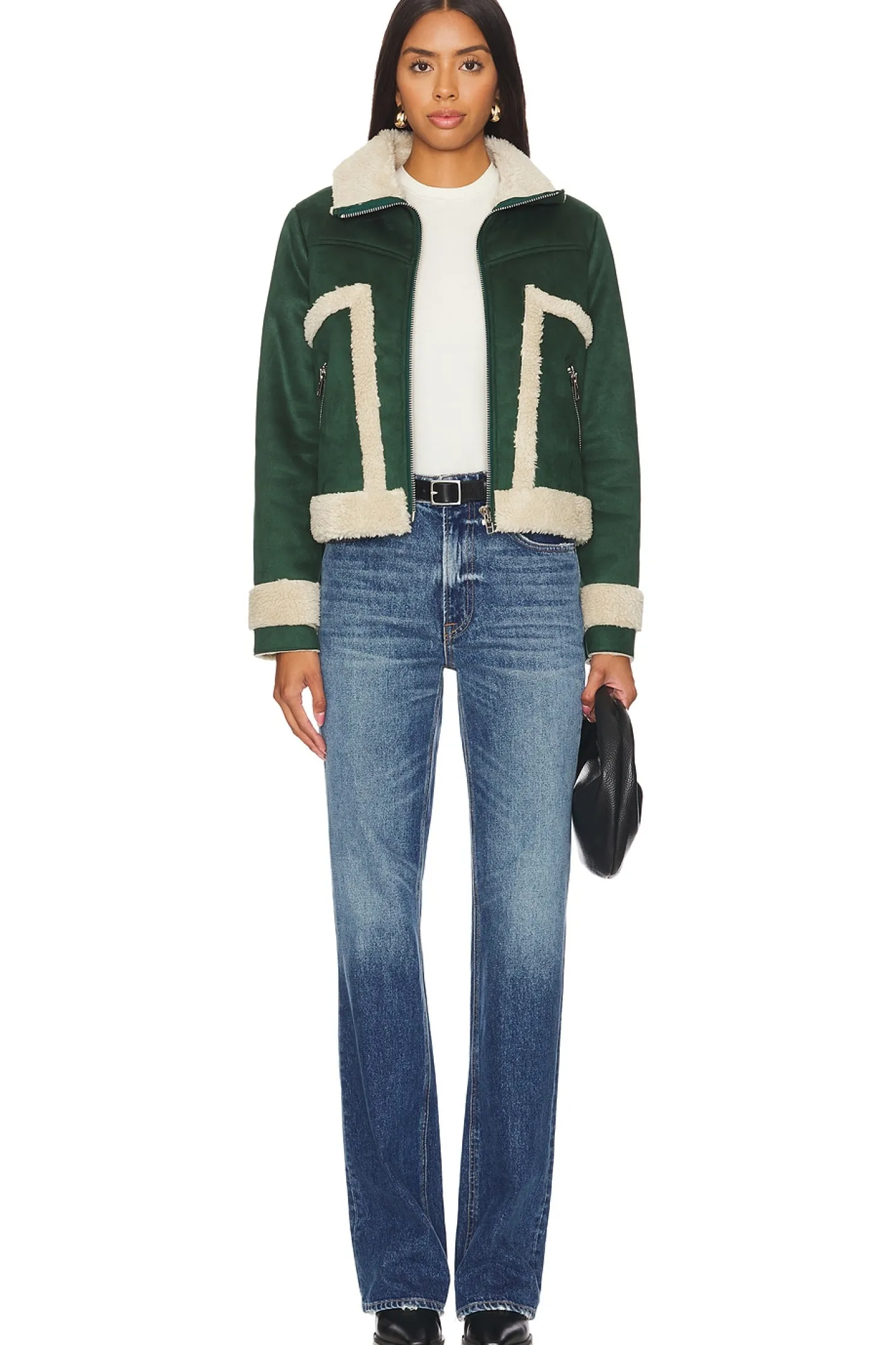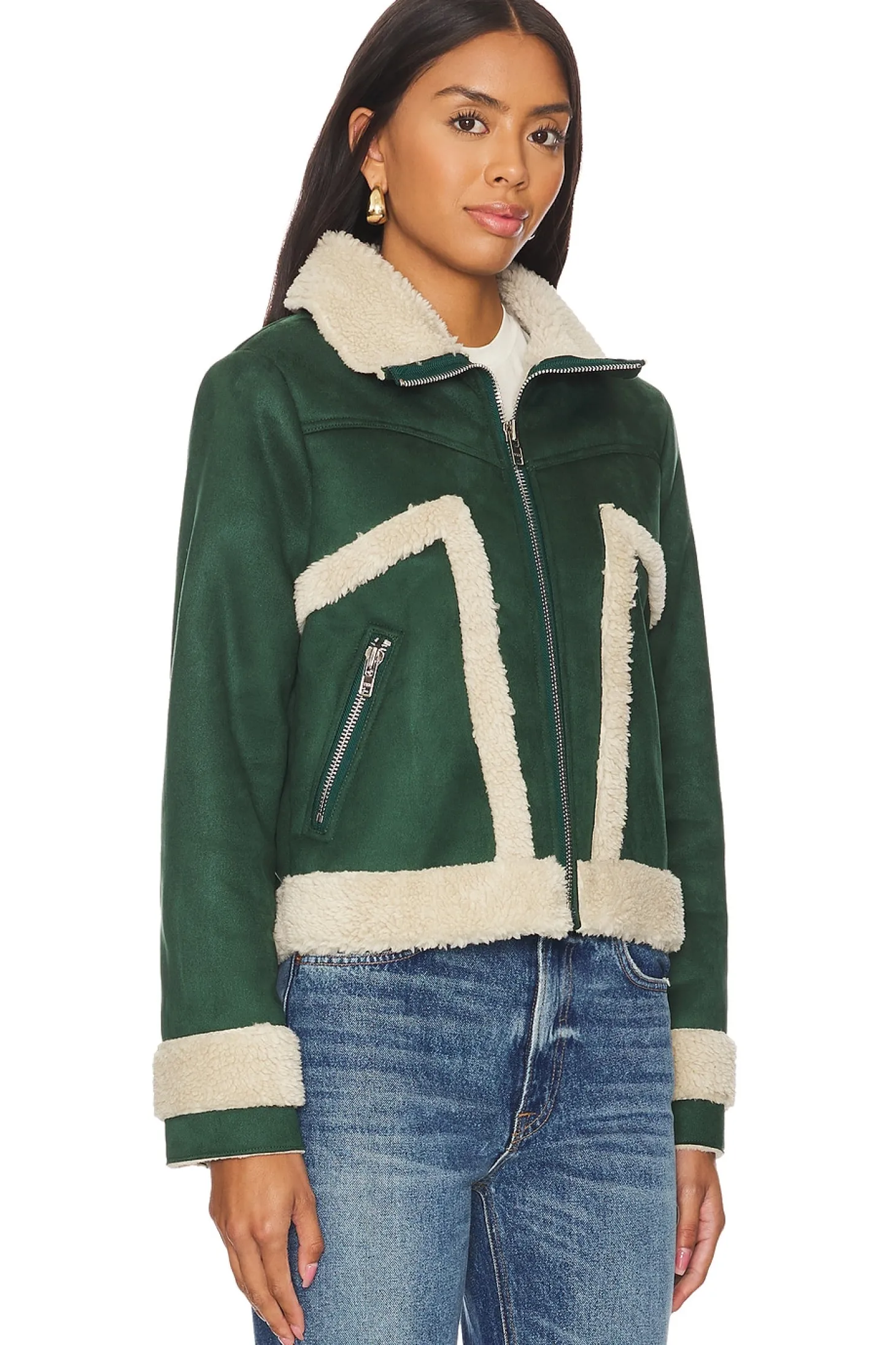 90% polyester 10% elastane Lining: 100% acrylic.Made in China.Dry clean only.Exposed front zipper closure.Side pockets with zipper closure.Faux suede fabric with sherpa accent