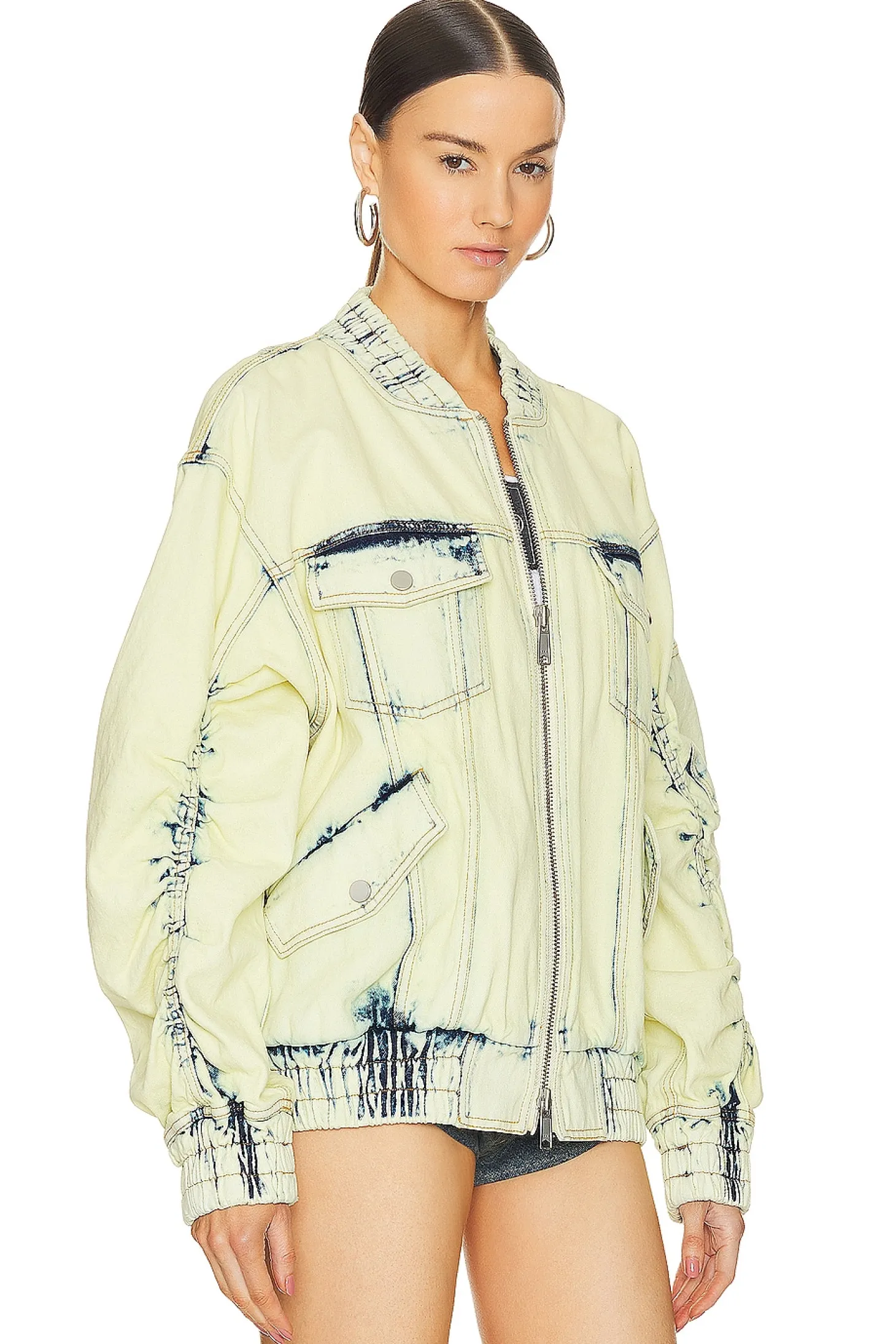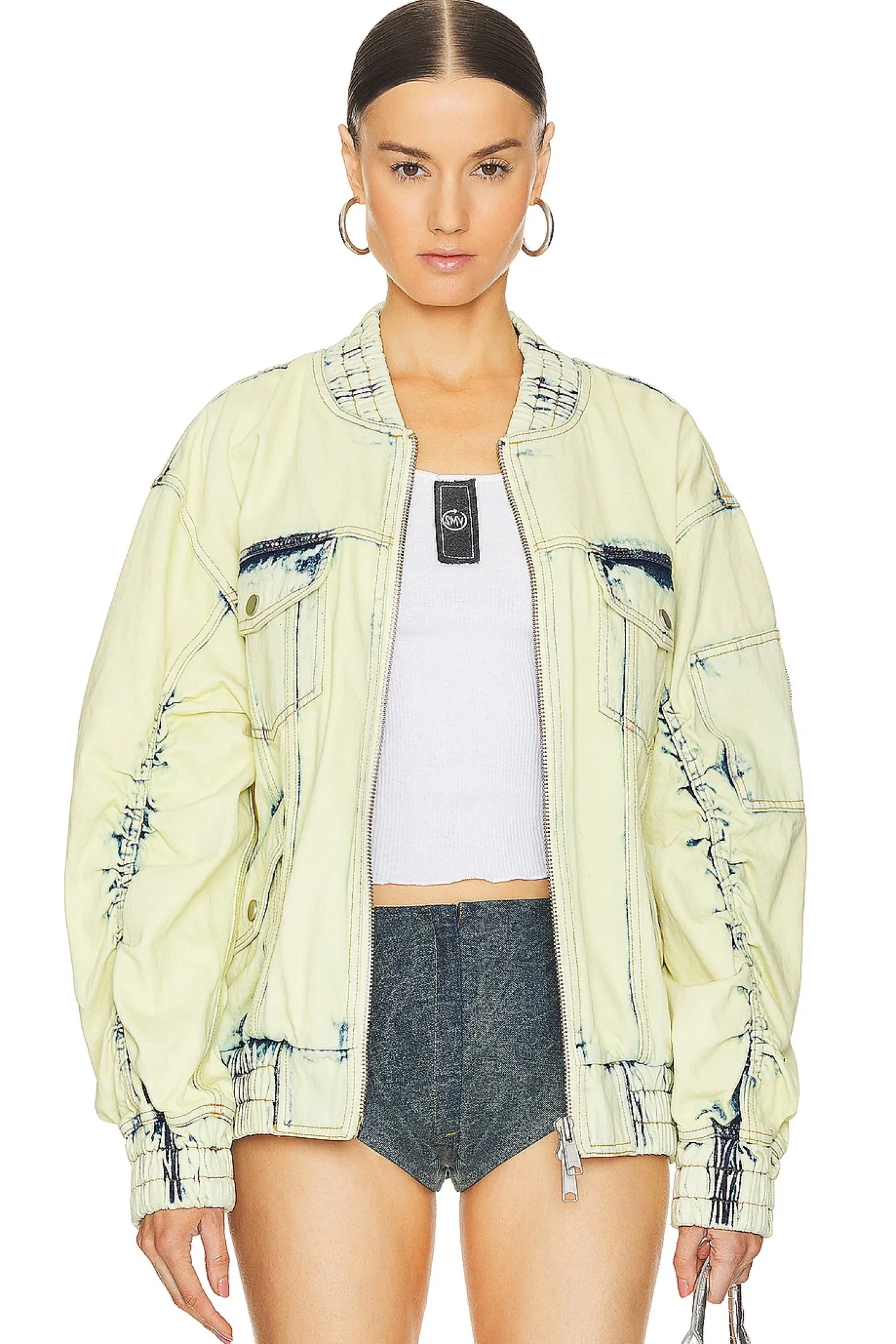 100% cotton.Made in China.Dry clean only.Front zipper closure.4-pocket design.Smocked cuffs.Midweight denim fabric