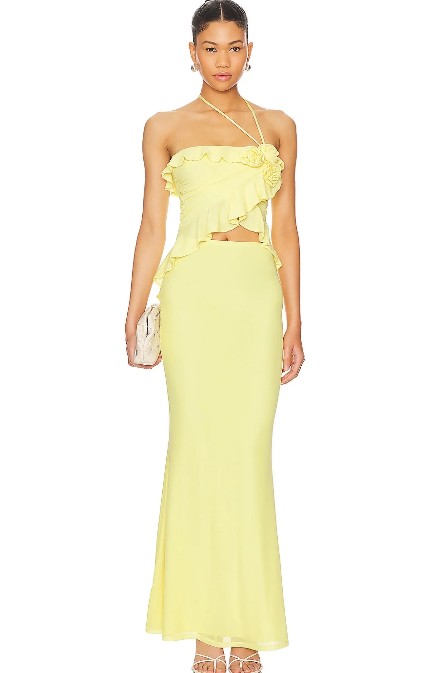 95% polyester 5% spandex.Made in China.Hand wash.Asymmetric halter strap with tie closure.Surplice hem with hanging fabric detail.Mesh jersey fabric with ruffled trims.Added floral detail at neckline.Item not sold as a set.AFRM's Thom Halter Top features an asymmetrical ruffle detail. This style pairs well with its matching bottom, the Tegan Skirt.