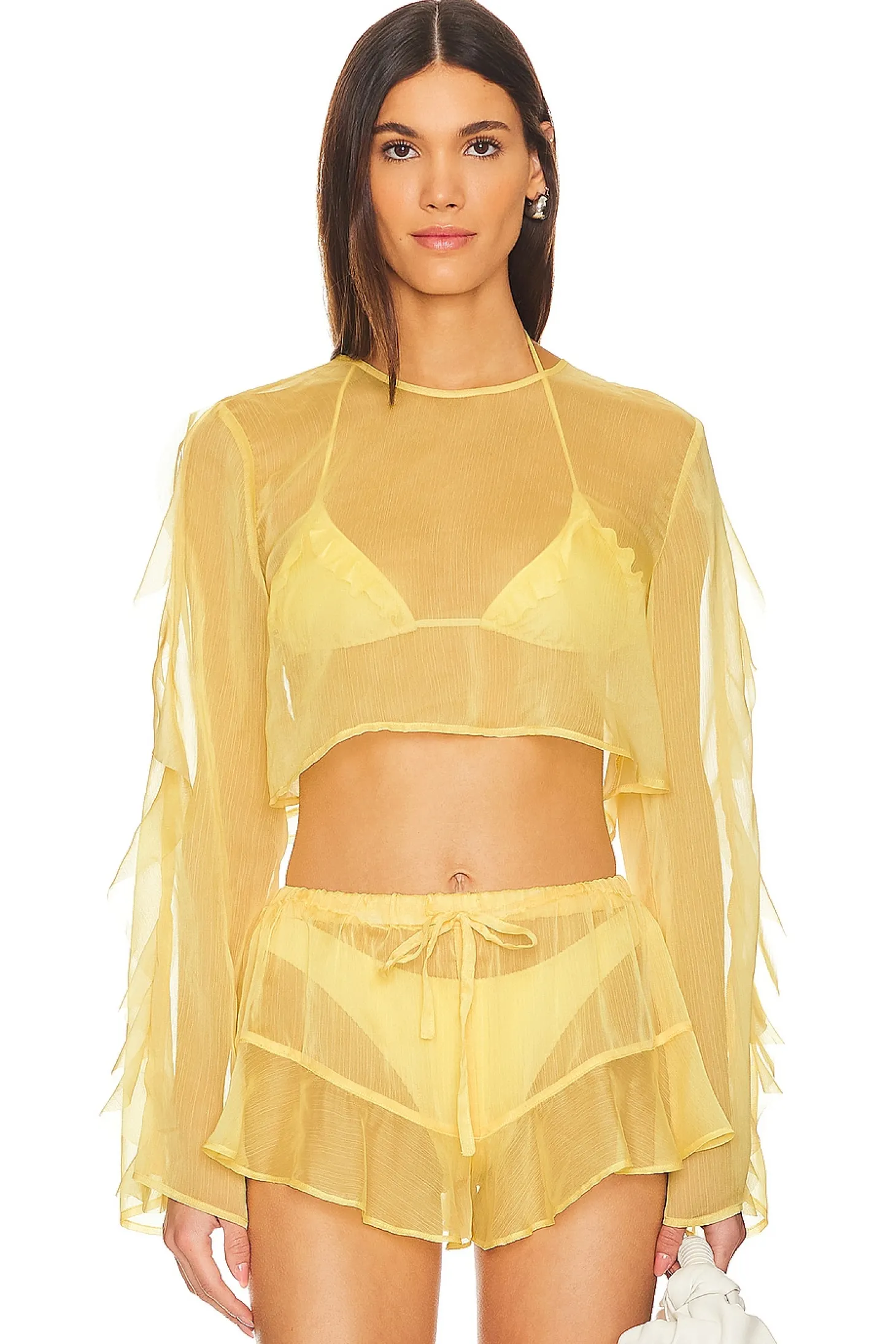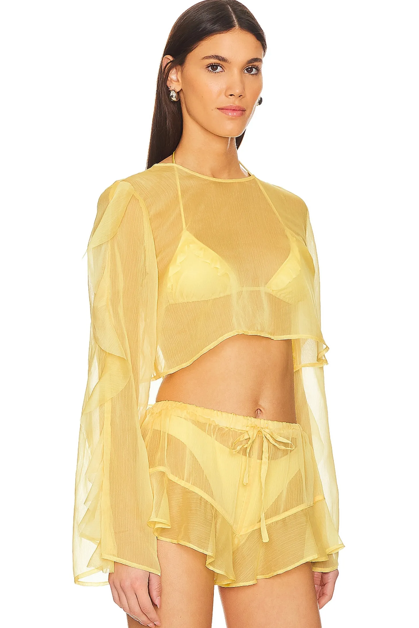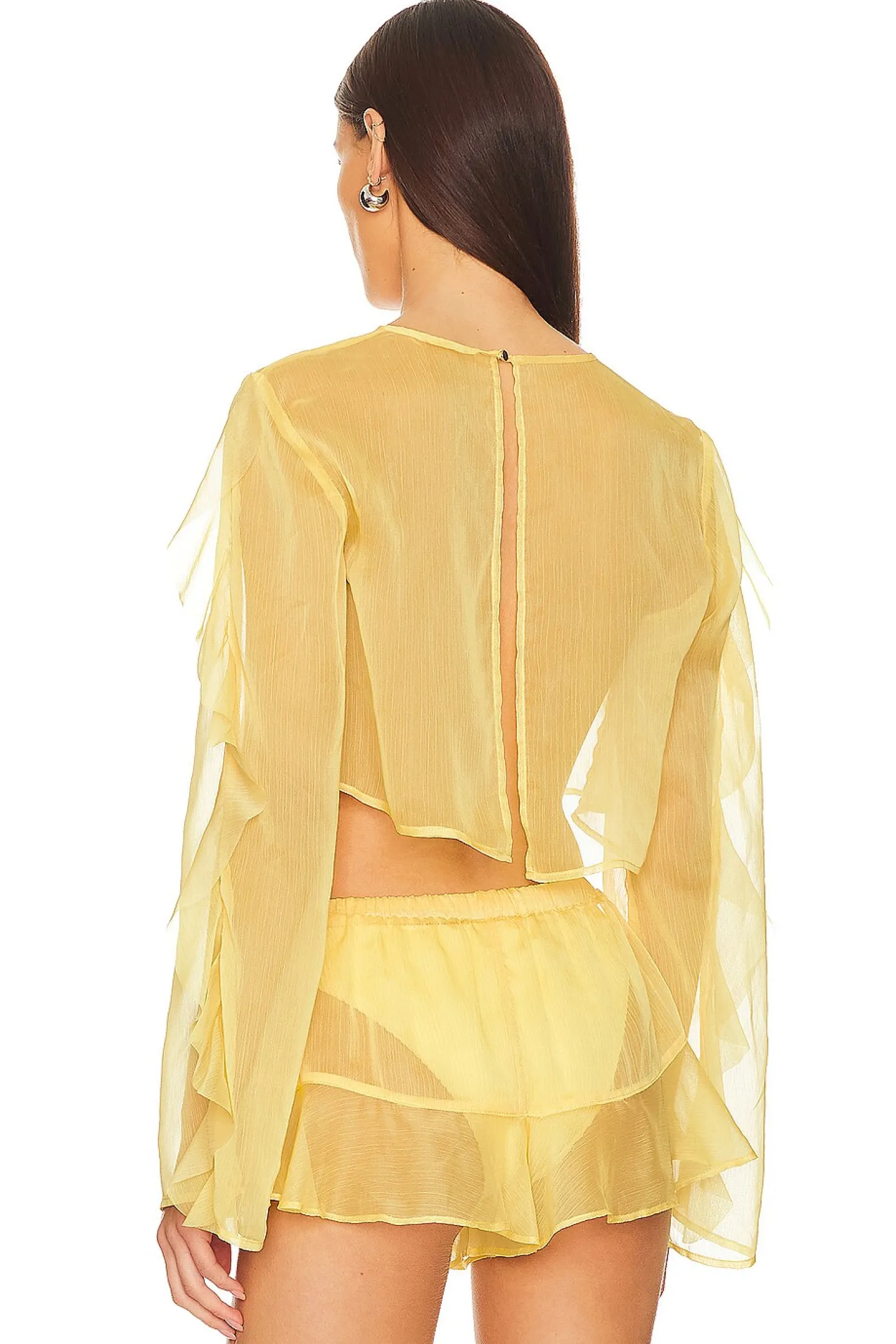 100% polyester.Made in China.Hand wash cold.Ruffle detail at sleeves.Lightweight chiffon fabric.Item not sold as a set