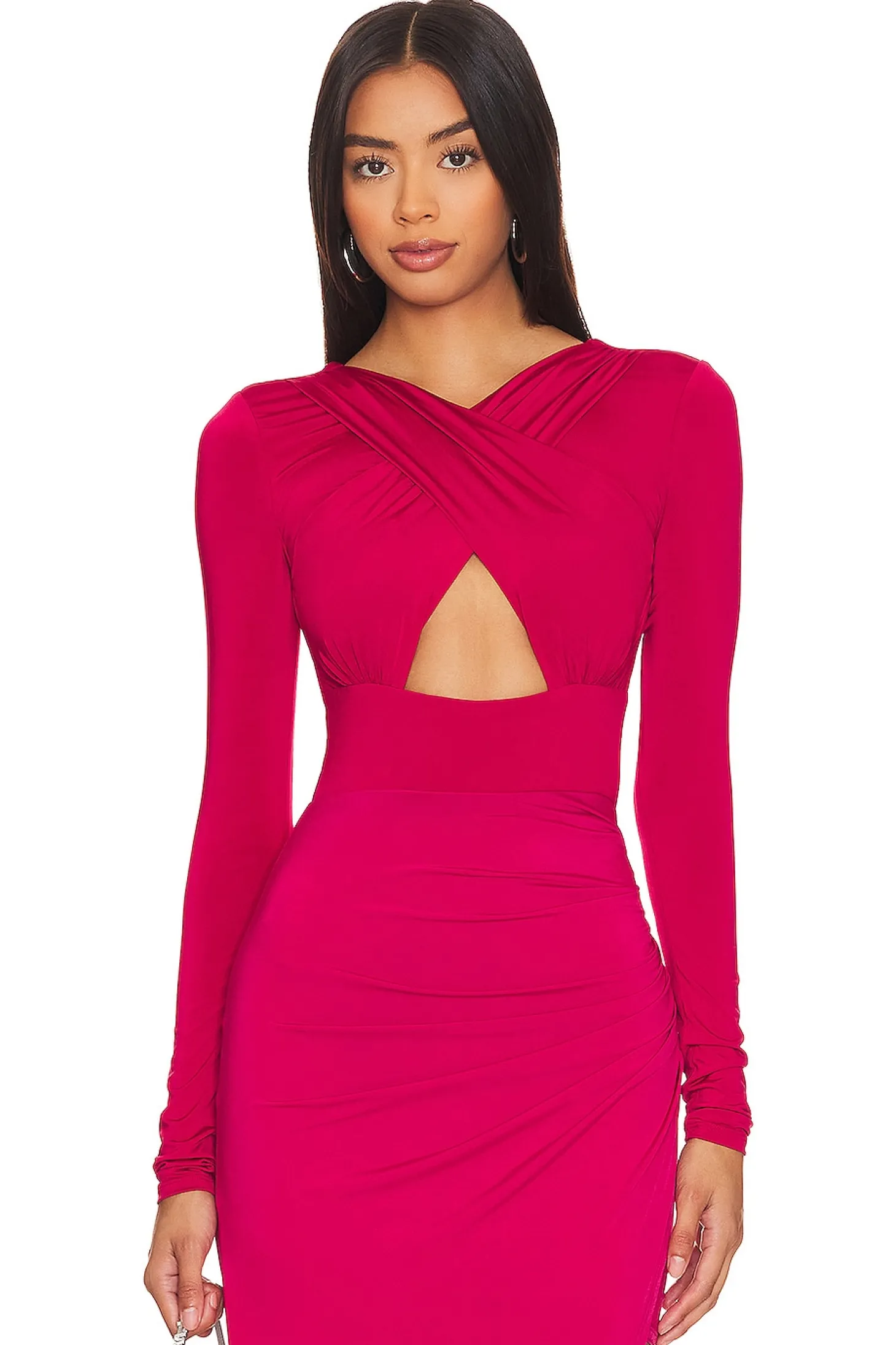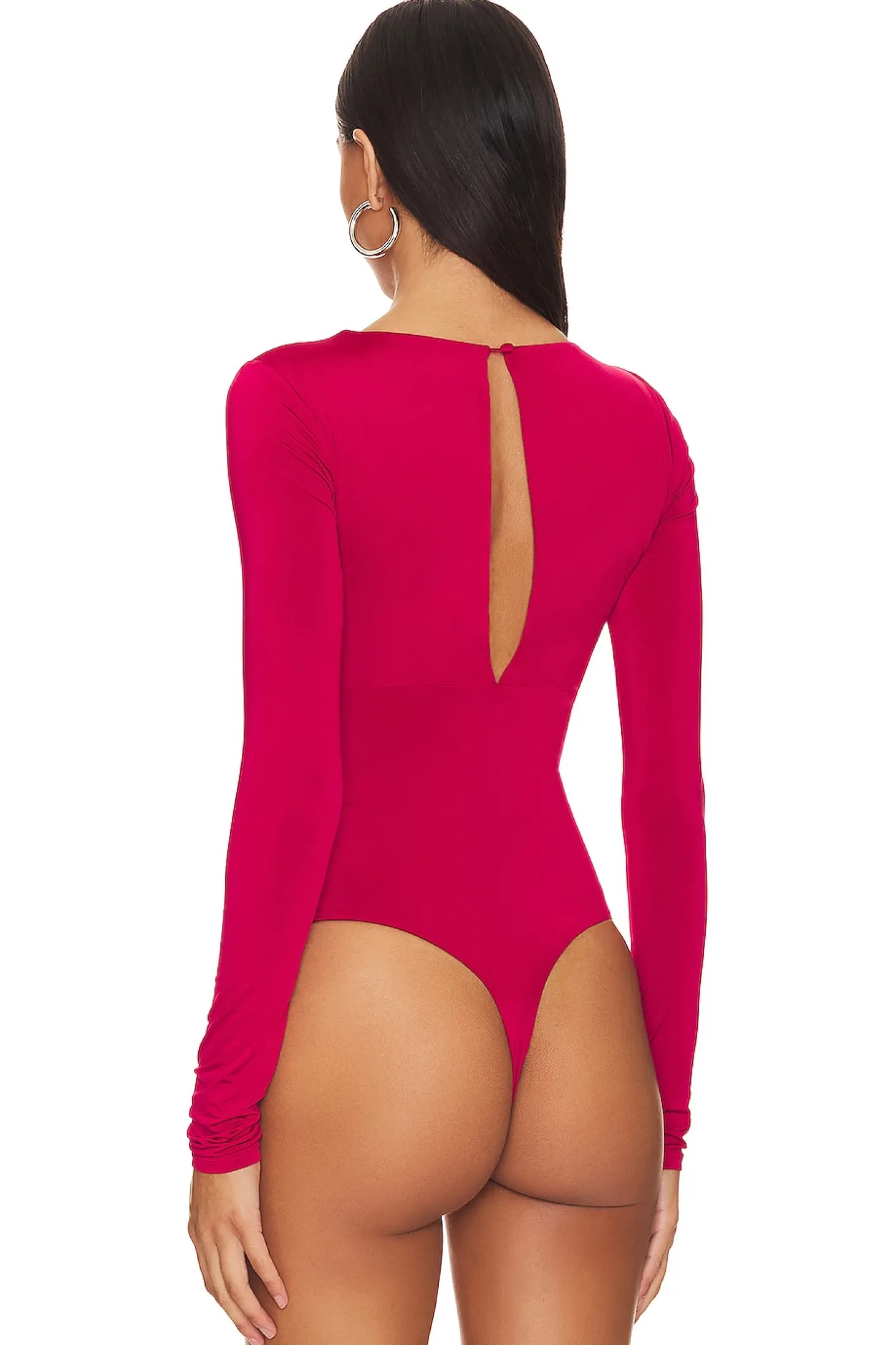 Make a statement with the Tigre Bodysuit in Dark Red. Made from high-shine jersey fabric, it features bold front and back cut-outs that exude feminine confidence. Radiating in a vibrant hue, this bodysuit promises to turn heads and elevate your night-out ensemble..93% polyester 7% elastane.Made in China.Hand wash.Gusset snap button closure with back keyhole closure.High shine jersey fabric with front and back cut-outs