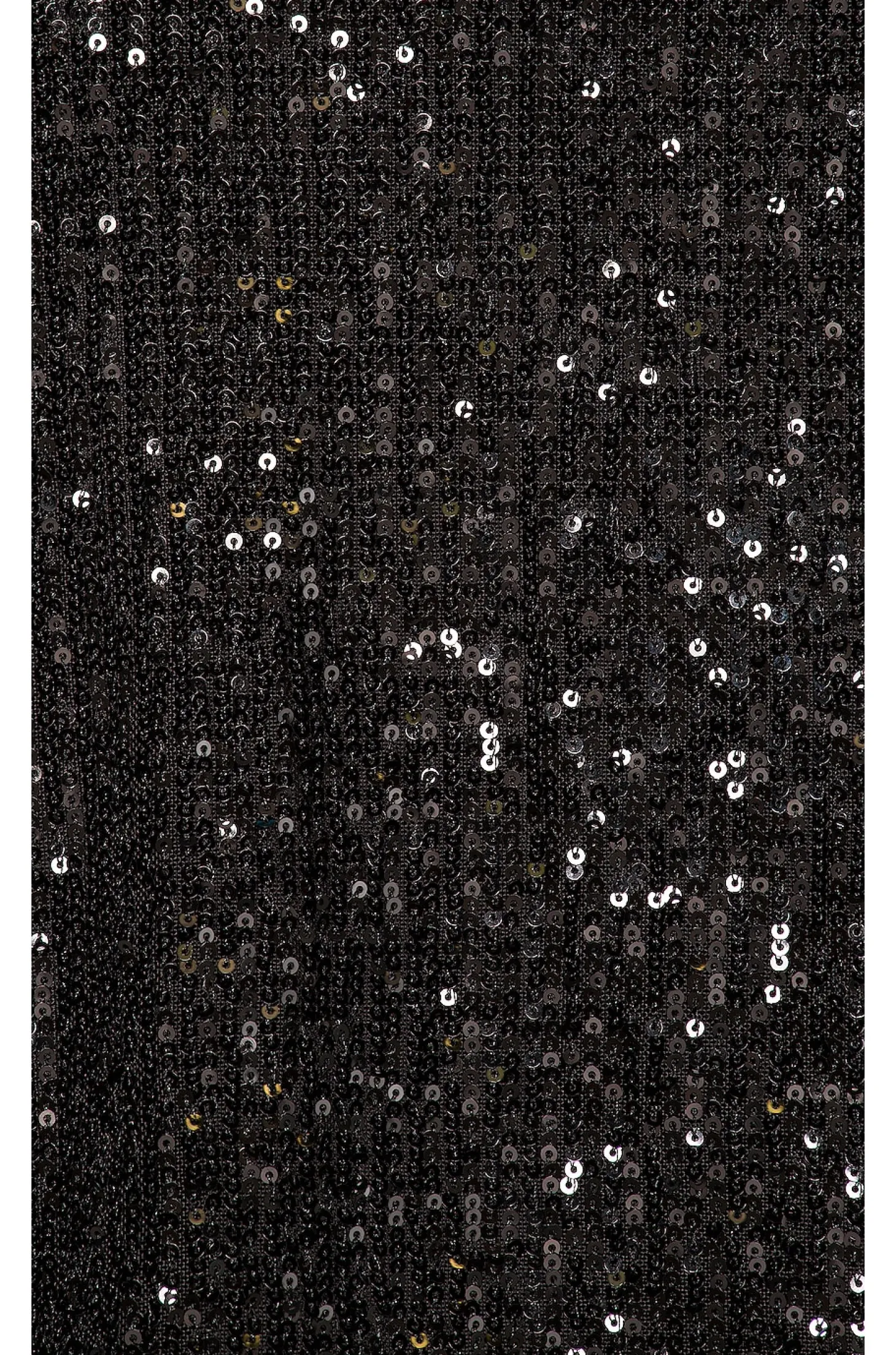 Self: 95% poly 5% spandex ground with PET sequins Lining: 90% poly 10% spandex.Made in China.Hand wash.Fully lined.Hidden back zipper closure.Halterneck styling with crisscross back tie closure Optional matching waist tie.Tonal sequin embellishments throughout