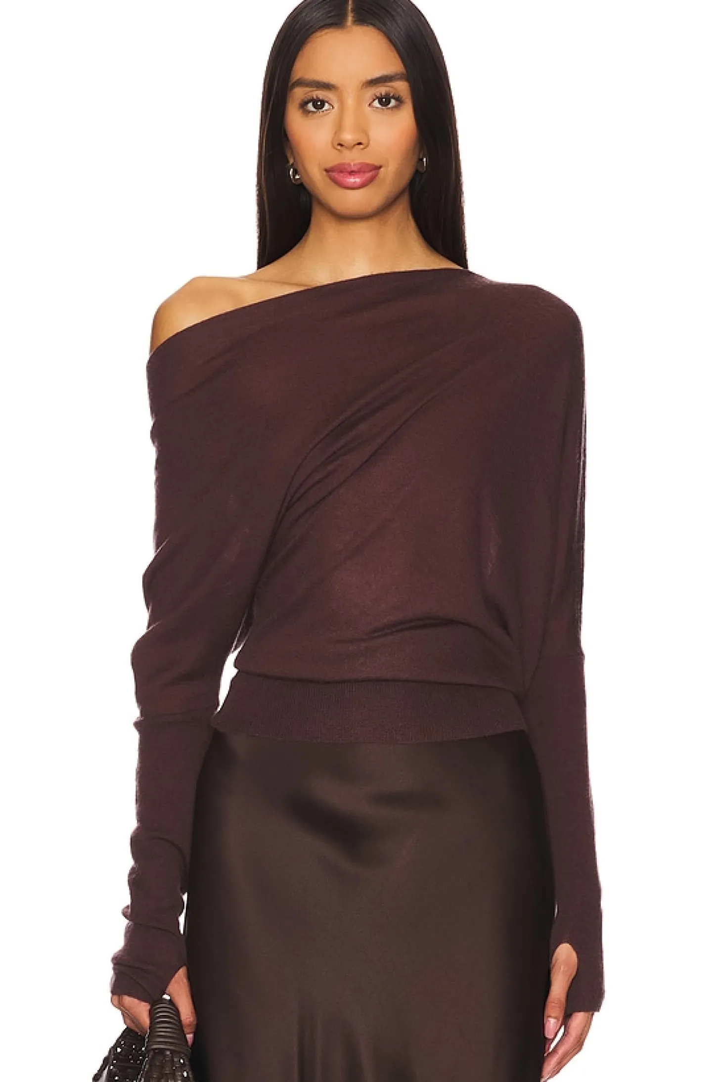 90% Wool 10% Cashmere.Made in China.Hand wash.Pull-on styling.One shoulder styling with draped fabric Lightweight knit fabric with thumbhole design.Garment is made with a semi-sheer fabric, undergarments can show through Item not sold as a set