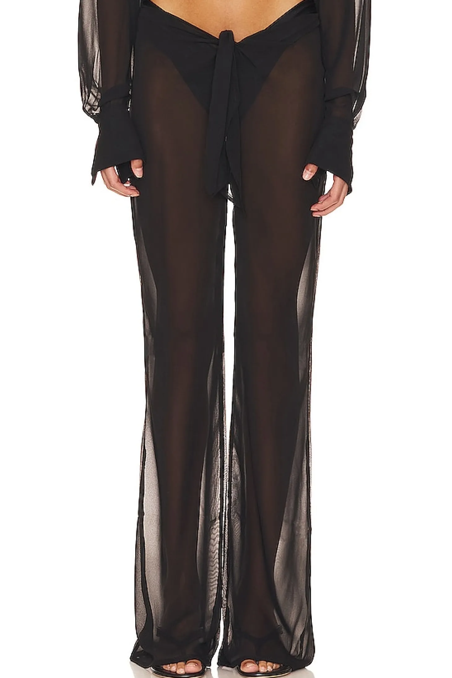 100% polyester.Made in Thailand.Hand wash.Front tie closure.Lightweight sheer chiffon fabric.Item not sold as a set.20" at the knee breaks to 24" at the leg opening
