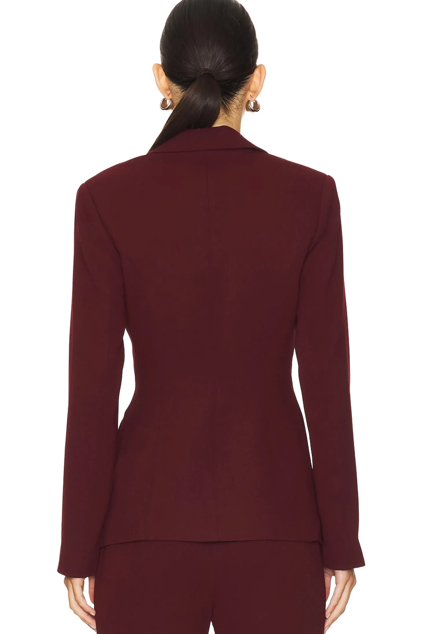 Self: 60% polyester 40% acetate Lining: 97% polyester 3% spandex.Made in China.Hand wash.Frog knot closure.Front flap pockets.Padded shoulders.Crepe fabric.Item not sold as set