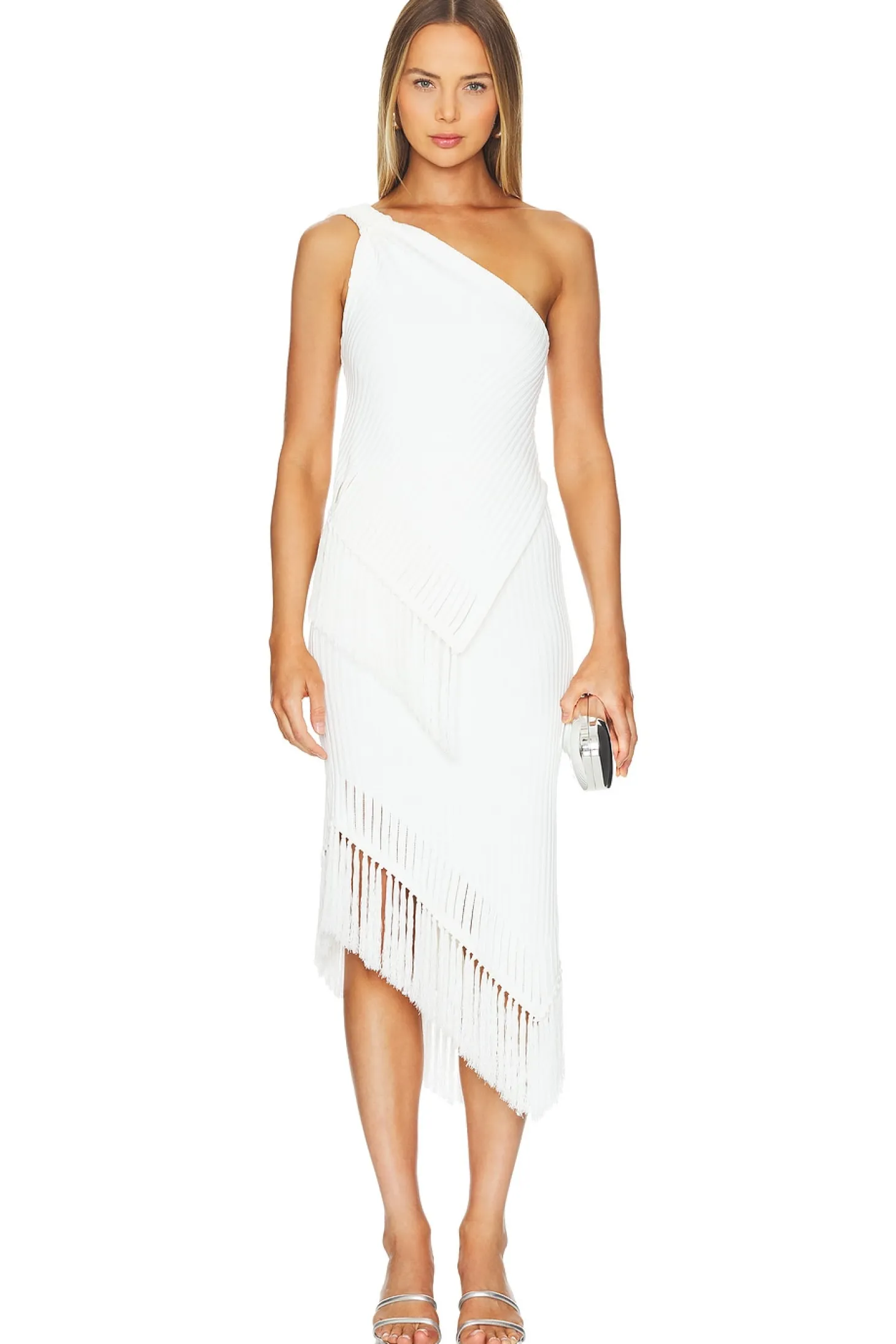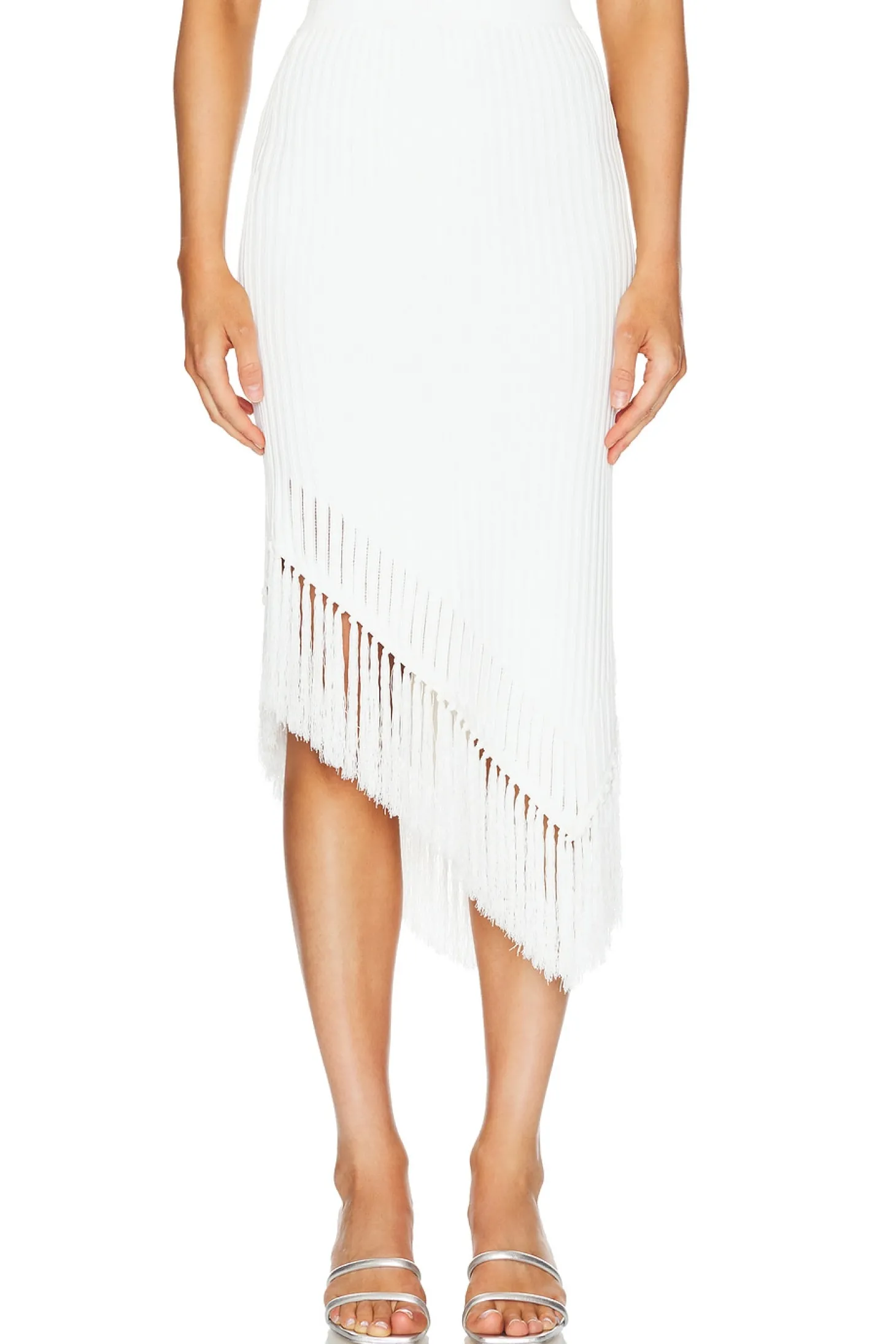 60% viscose 40% nylon.Made in China.Hand wash.Unlined.Elastic waistband.Rib knit fabric with cut-out trim and fringe hem.Waist to shortest hem measures approx 25" and to longest hem approx 35" in length