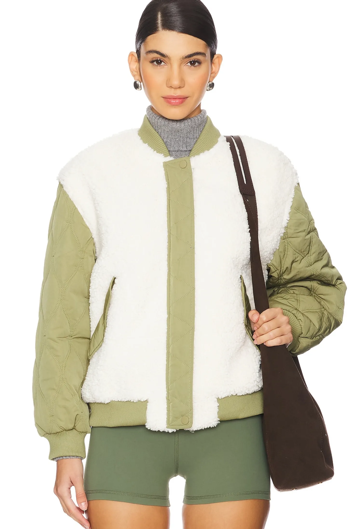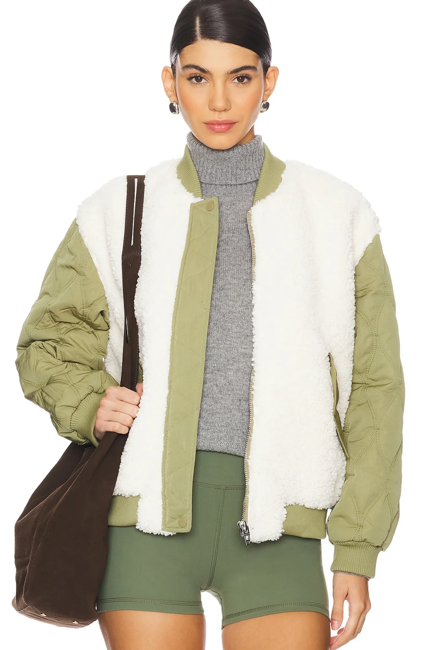 Self: 100% polyester Lining: 97% polyester 3% cotton.Made in China.Dry clean only.Hidden front zipper closure.Side flap pockets with button snap closure.Twill fabric at sleeves.Faux fur at front and back