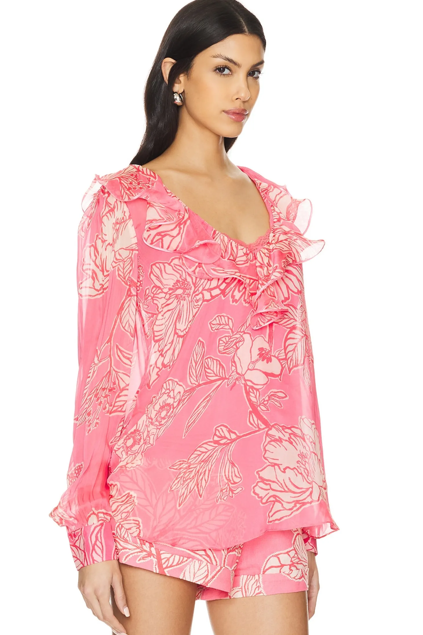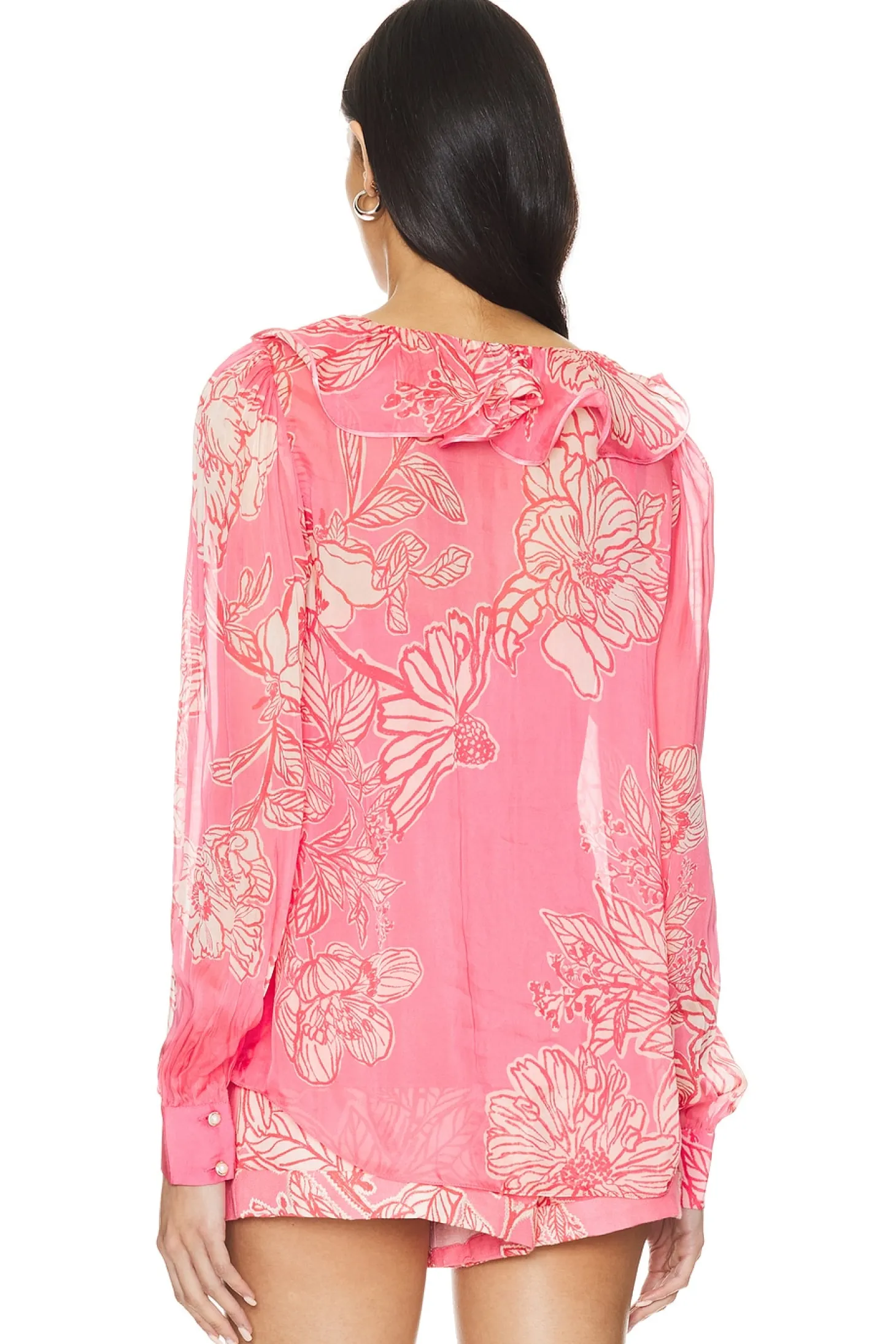 Self: 100% viscose Lining: 88% nylon 12% lycra.Made in India.Dry clean only.Pull-on styling.Buttoned cuffs.Includes slip lining.Lightweight chiffon fabric