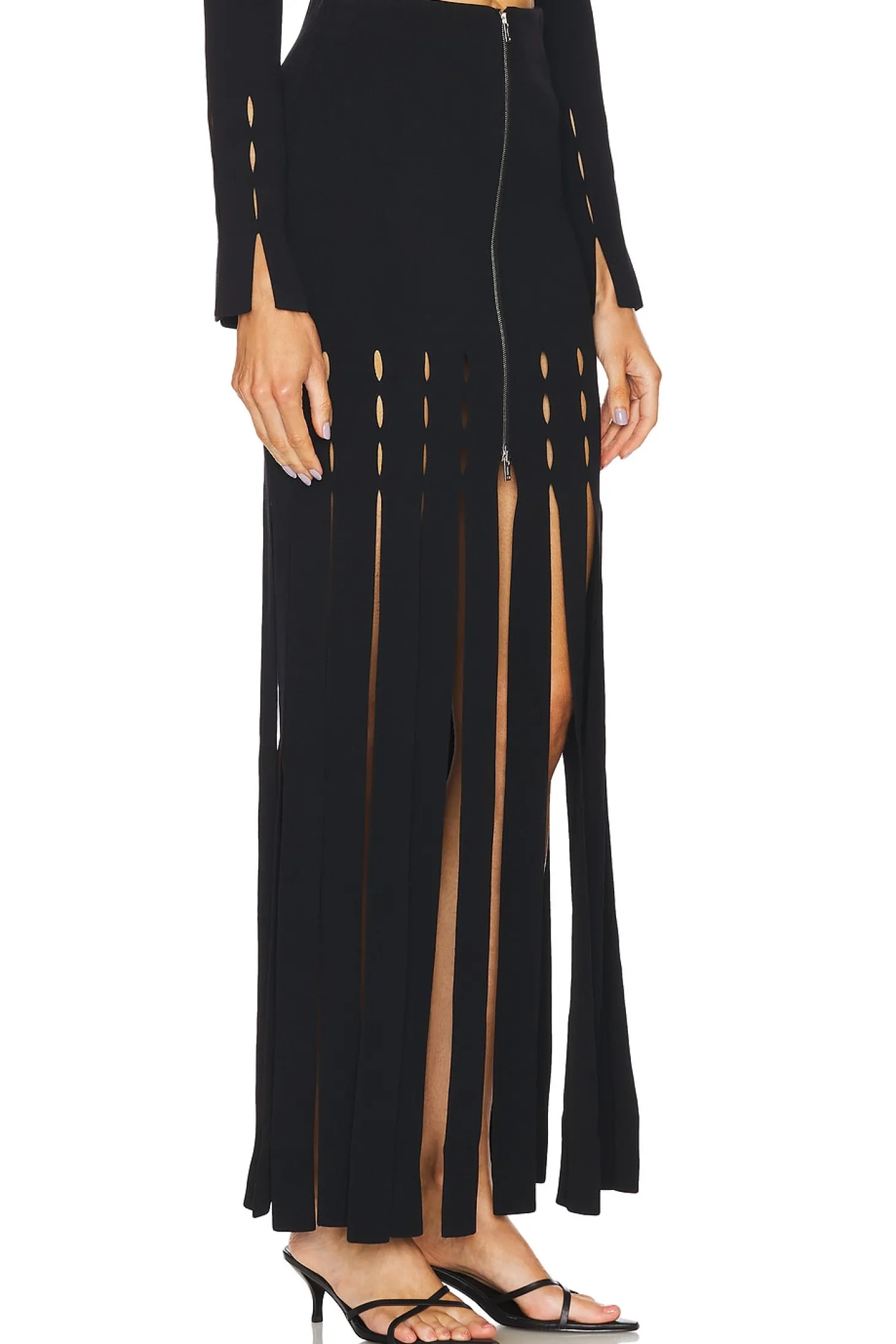 52% viscose 46% polyamide 2% elastane.Made in China.Hand wash.Unlined.Dual exposed front zipper closure.Fringe details.Item not sold as set.Skirt to shortest hem measures approx 12.5" and to longest hem approx 42.5" in length