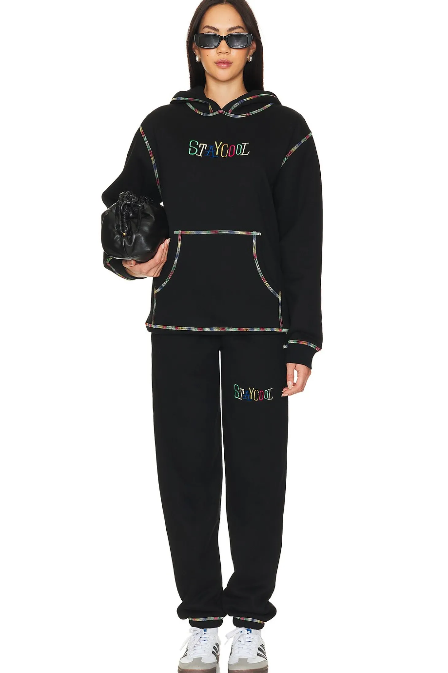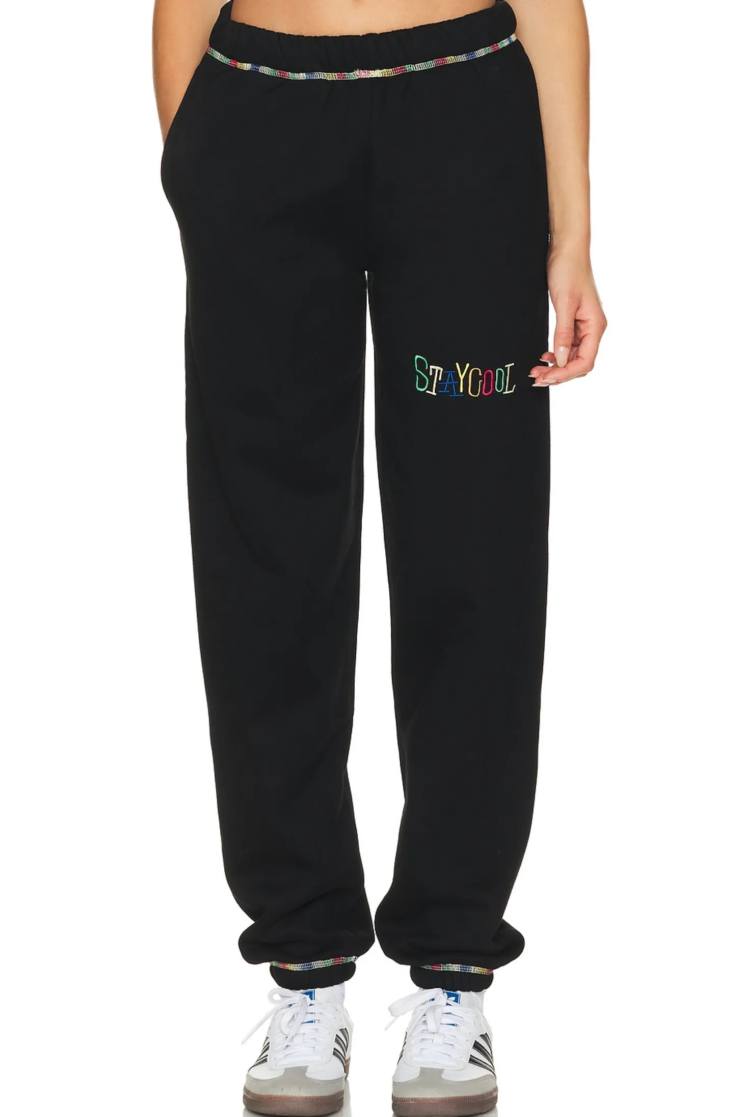 50% cotton 50% polyester.Made in China.Machine wash.Pull-on styling with elastic waistband.Side seam pockets.Fleece lining.Item not sold as a set.18" at the knee narrows to 10" at the leg opening