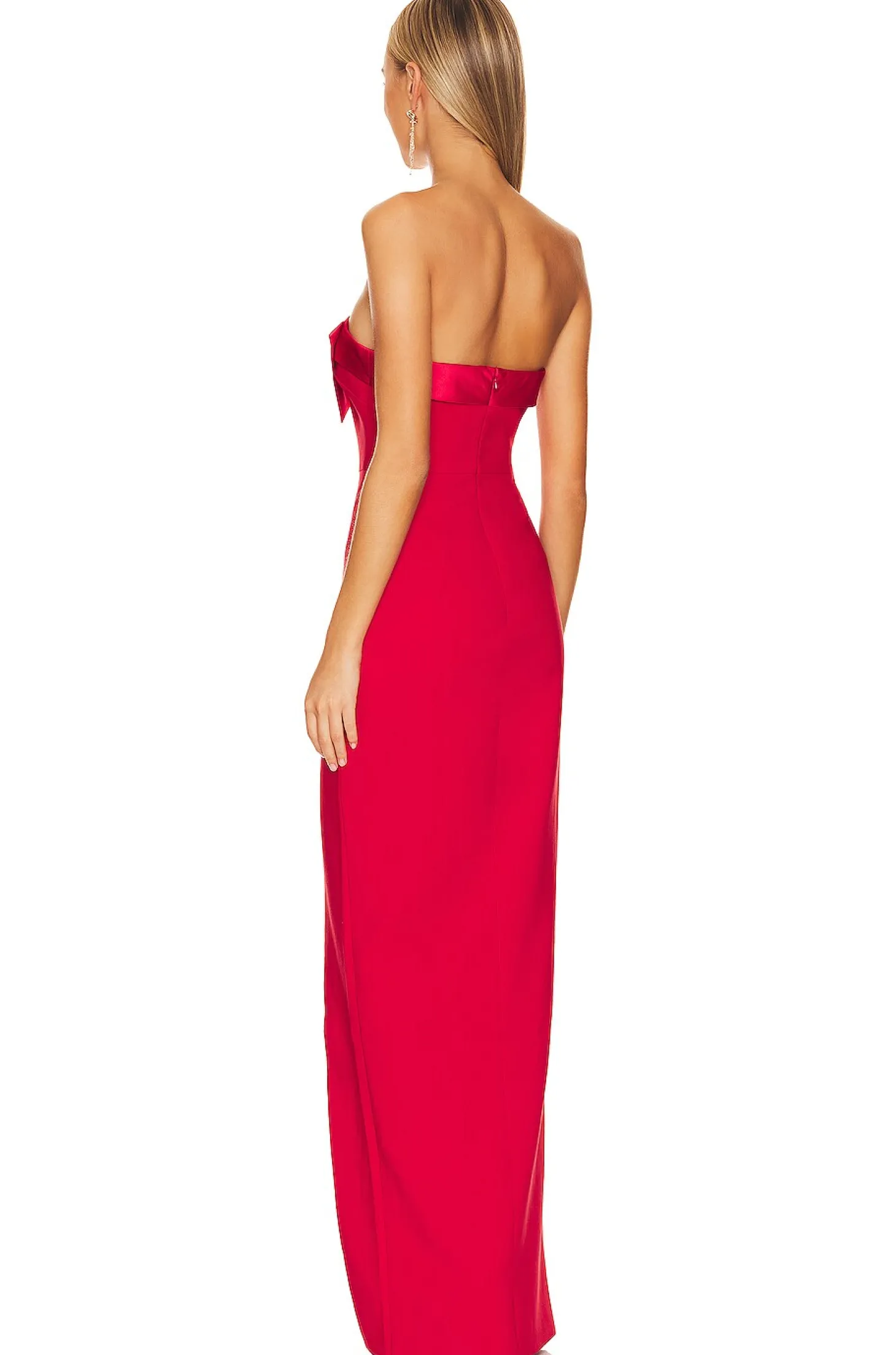 Self: 67% polyester 27% rayon 6% spandex Lining: 100% polyester Contrast Fabric: 97% polyester 3% spandex.Made in China.Dry clean only.Fully lined.Hidden back zipper closure.Sateen bow accent.Crepe fabric with side slit.Neckline to hem measures approx 55.5" in length