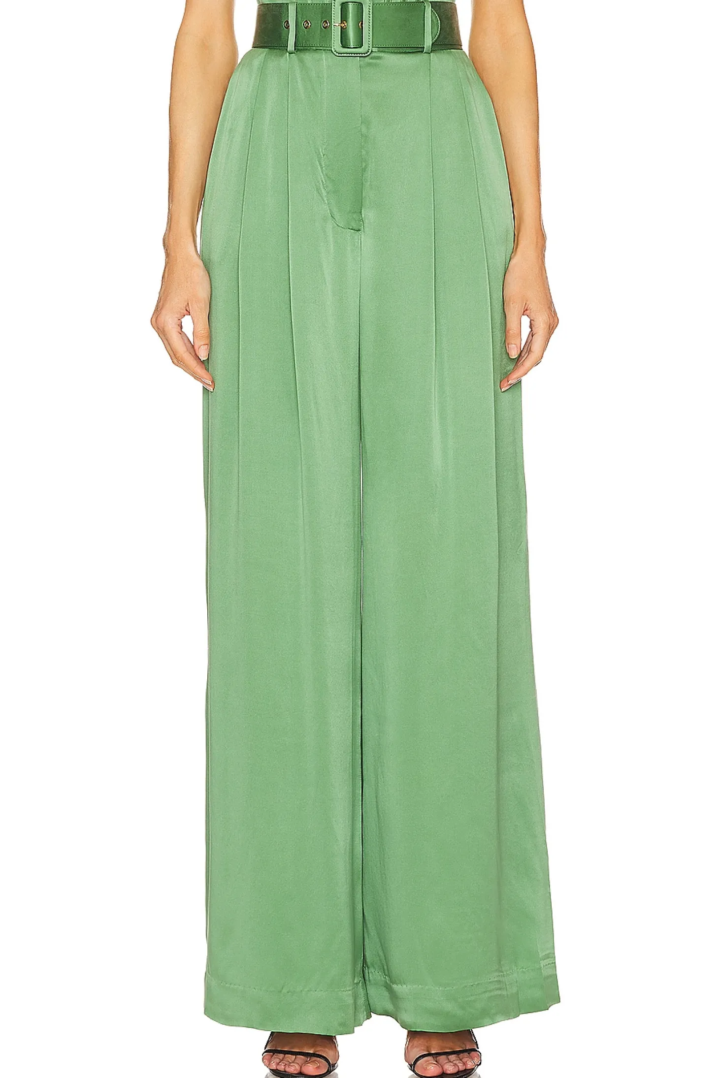 100% silk.Made in China.Dry clean only.Zip fly with hook and bar closure.Side seam pockets.Attached waist belt with buckle closure.Lightweight charmeuse fabric Item not sold as a set.26" at the knee and 26" at the leg opening